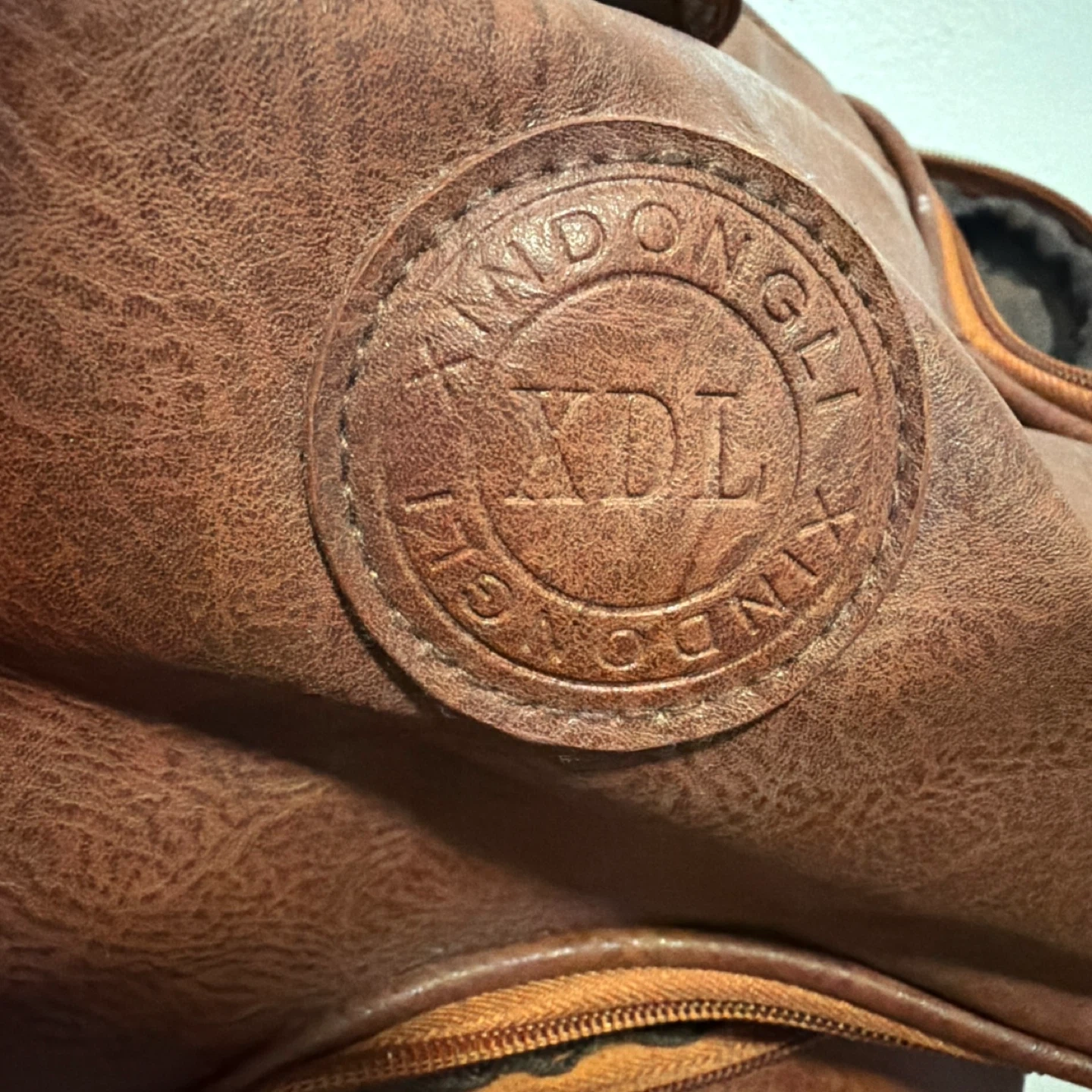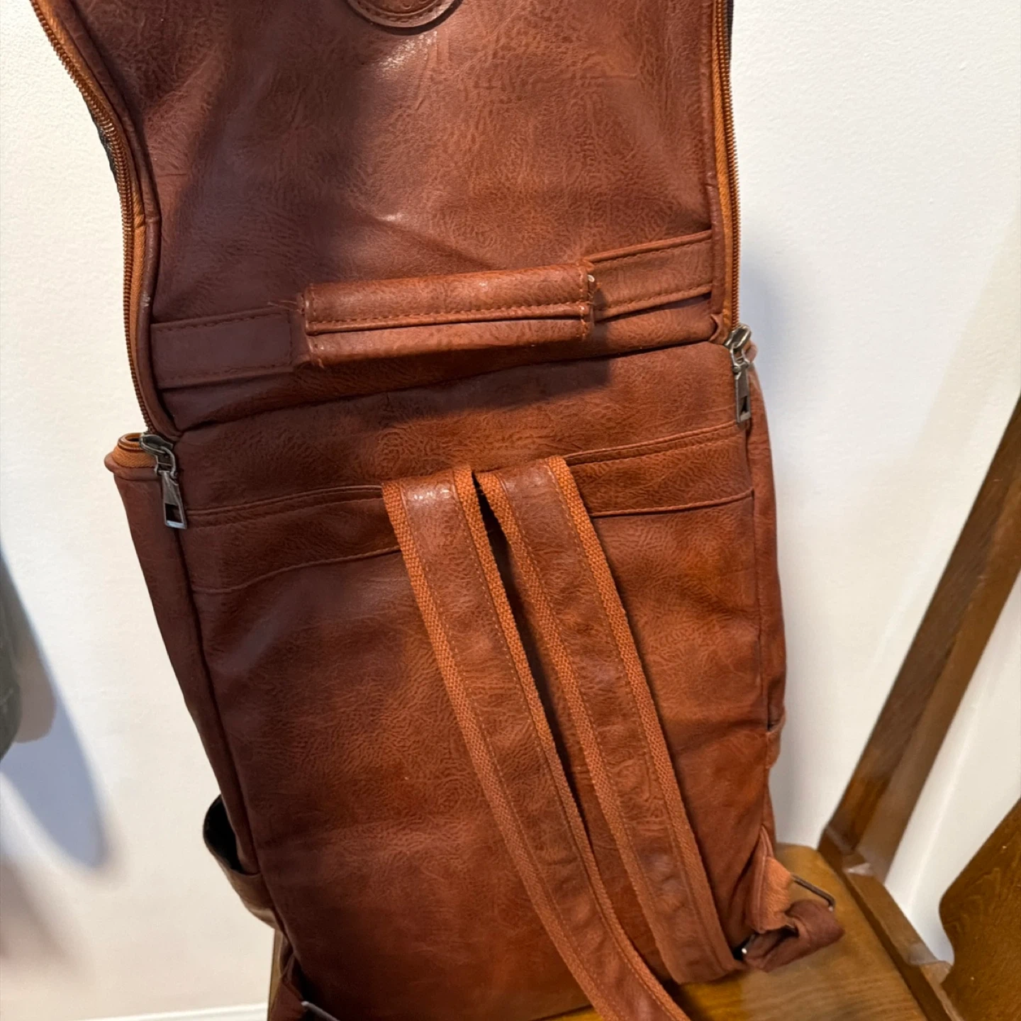 261This is a brown leather backpack with the Andong XDL logo on the front. It has a unique design with multiple pockets and compartments. It's perfect for carrying books, electronics, or other essentials. The backpack is in great condition and ready for a new owner