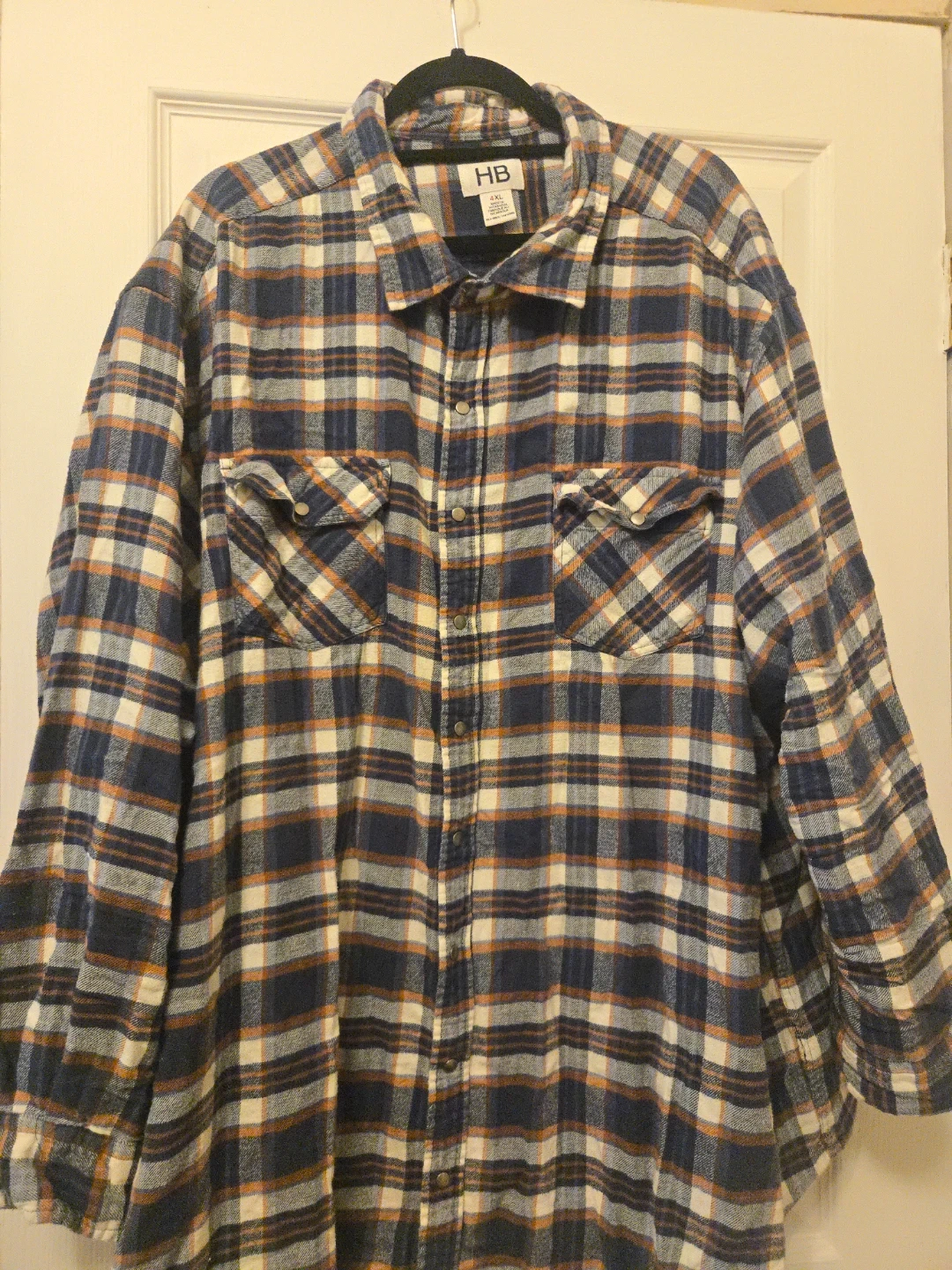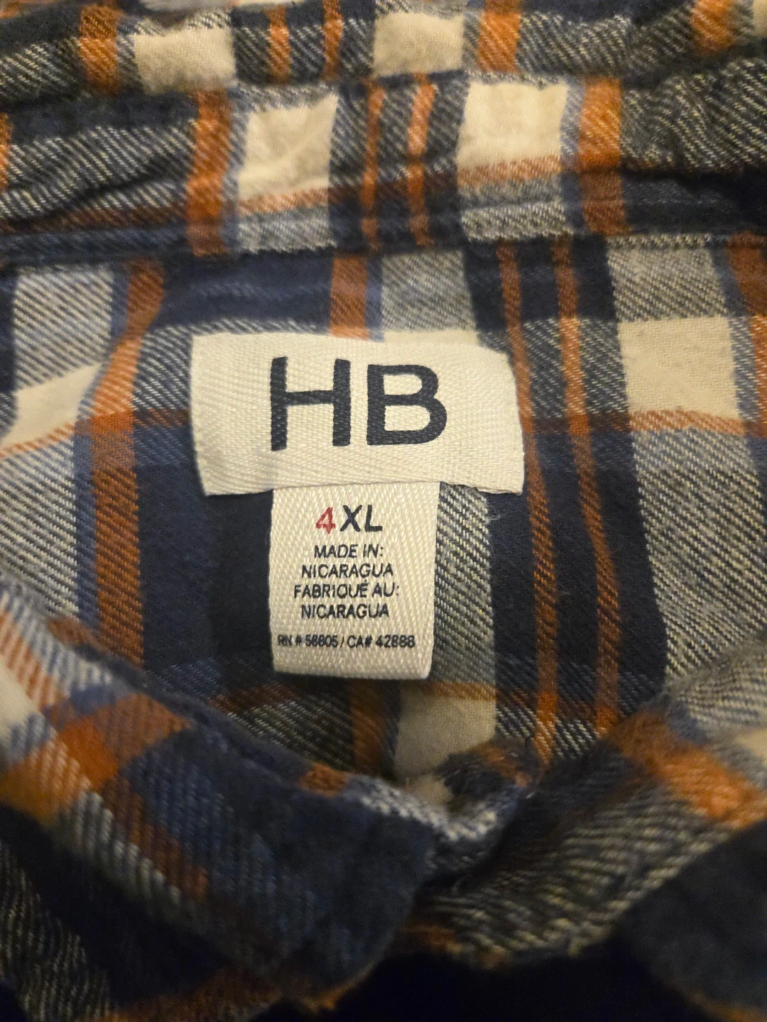 HB brand plaid flannel shirt. Size 4XL. Made in Nicaragua. Button-front closure with two chest pockets.