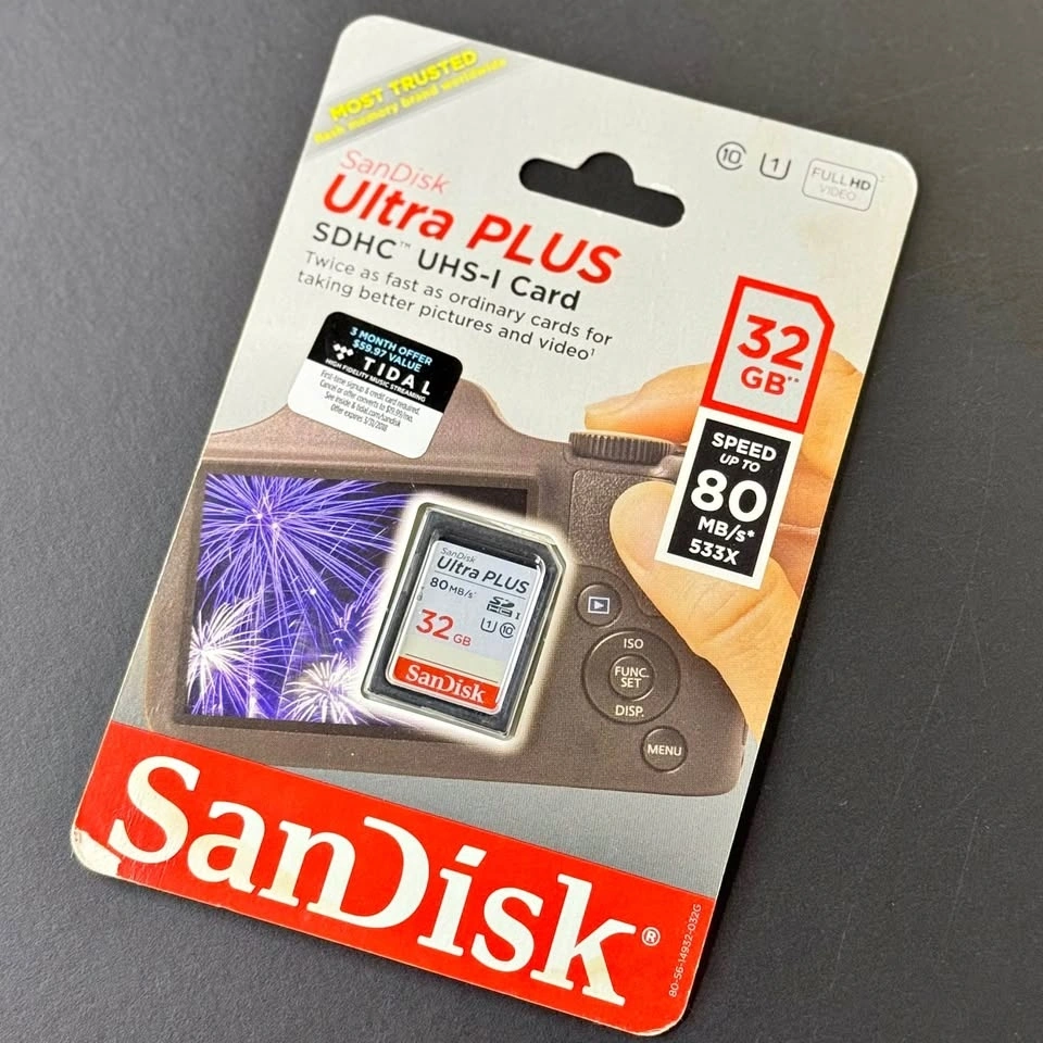 Brand new, sealed SanDisk 32GB SDHC UHS-I Card. Has a speed of up to 80 MB/s. Compatible with devices that support UHS-I and SDHC formats.