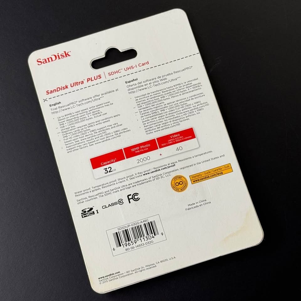 Brand new, sealed SanDisk 32GB SDHC UHS-I Card. Has a speed of up to 80 MB/s. Compatible with devices that support UHS-I and SDHC formats.