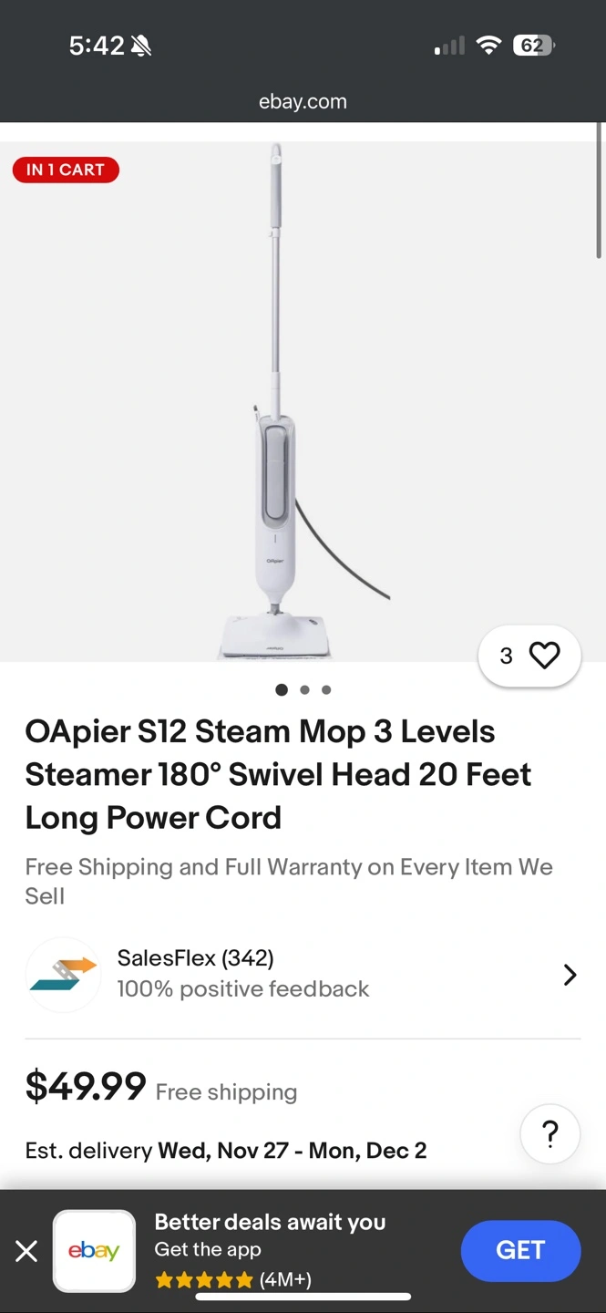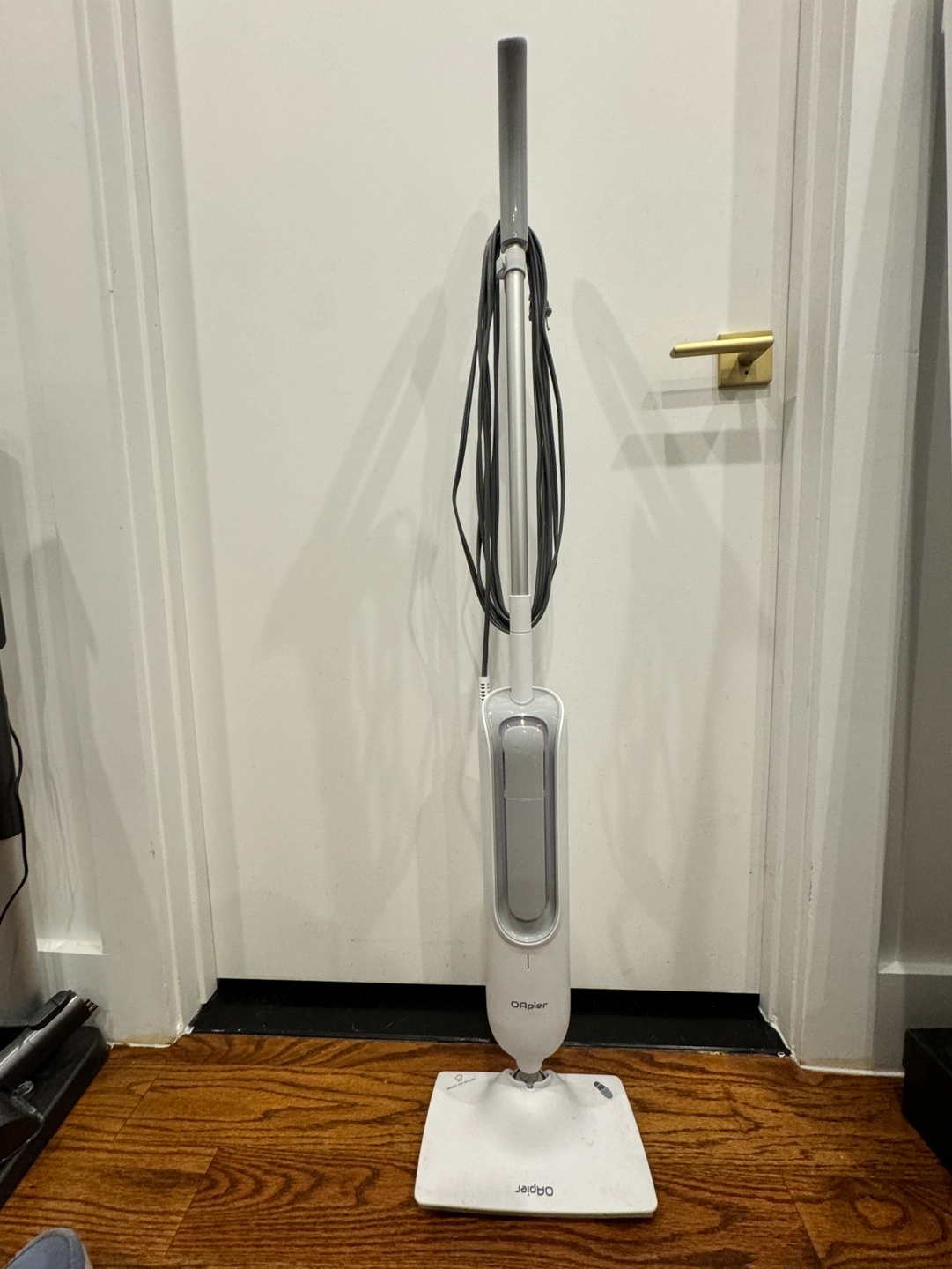 Steam mop with 180 degree swivel head. Has three settings and a 20-foot cord. Retail for 50, gently used total 8-10 times only. You need to get new replacement mop fabric on amazon.