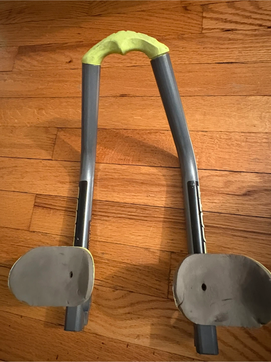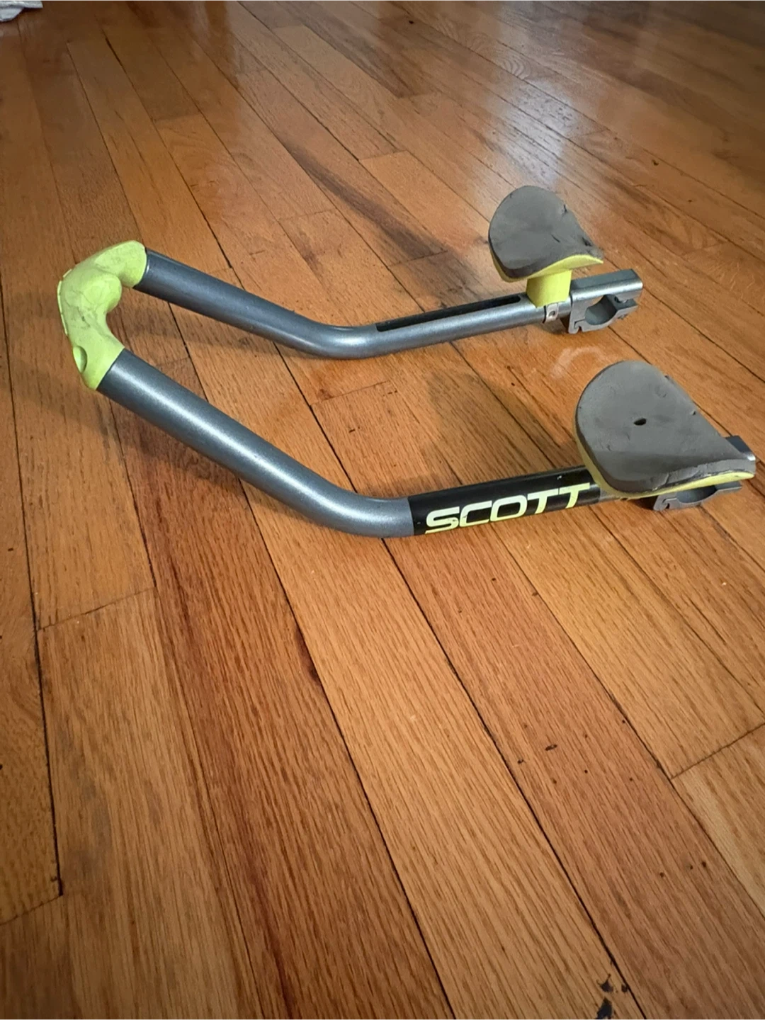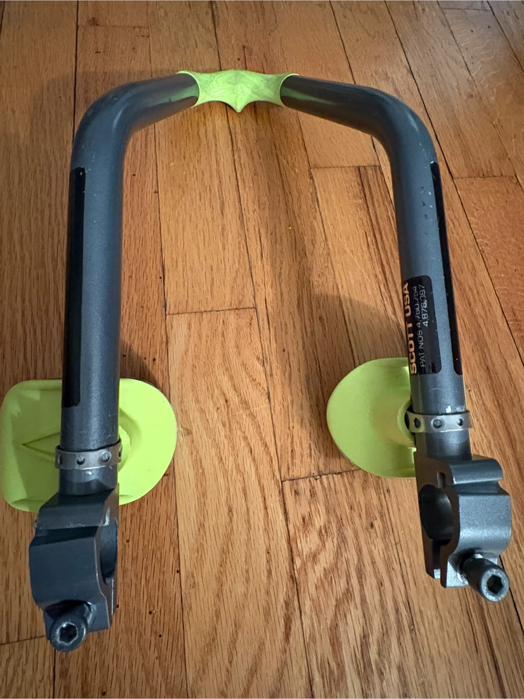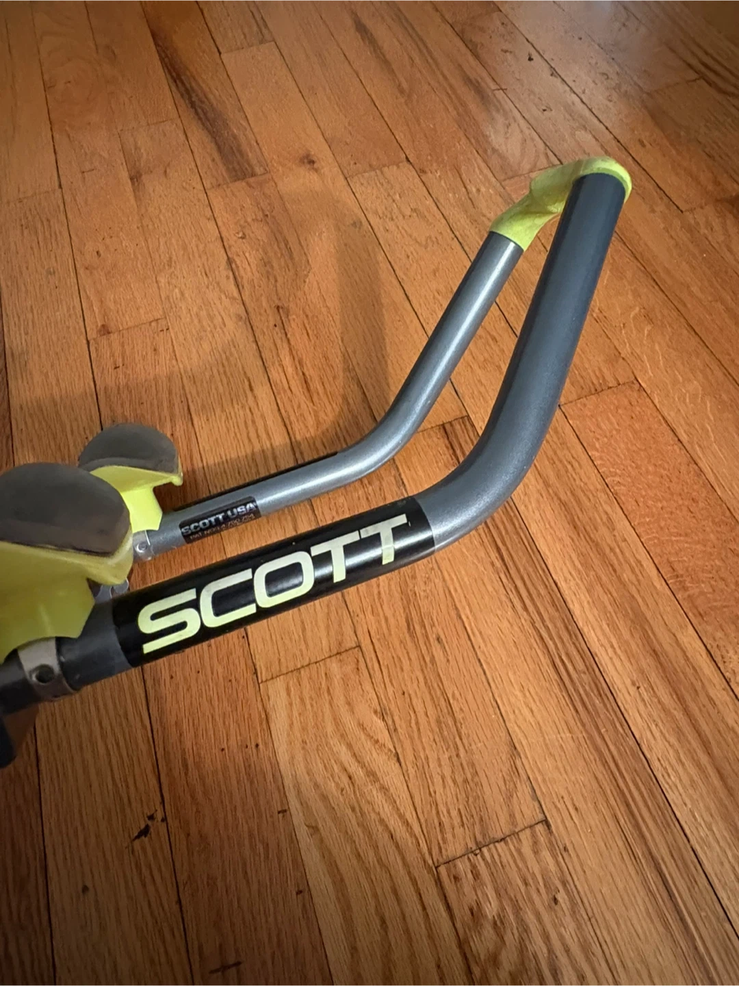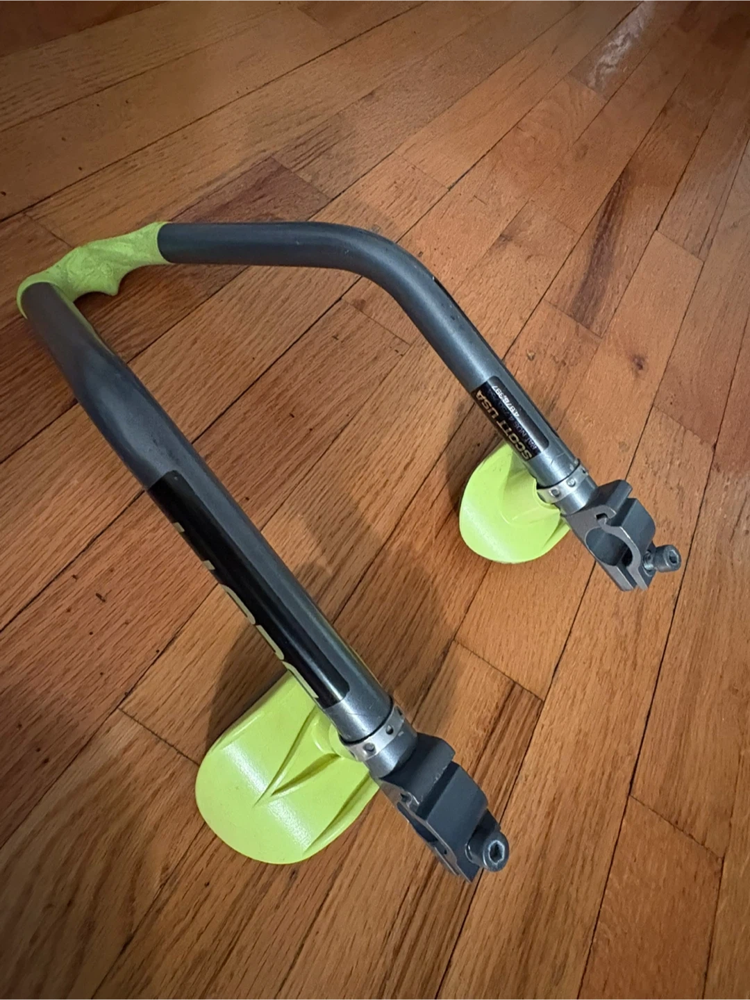 These are Scott USA aerobars for cycling. They're made of aluminum with bright lime green accents and grey grips. They're designed to attach to your bike's handlebars for a more aerodynamic riding position.