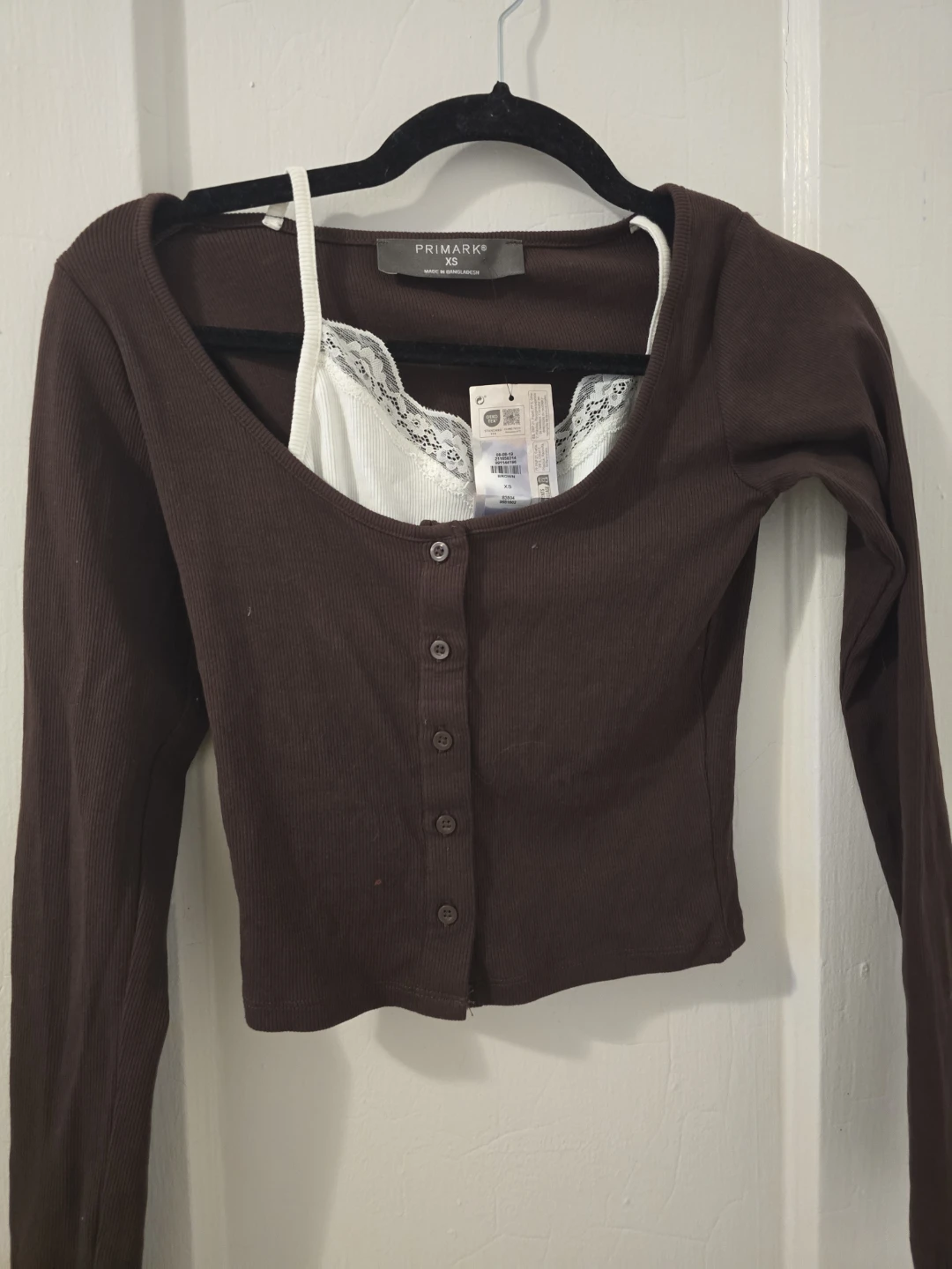 This is a brown ribbed cropped cardigan from Primark in size XS. It features a button-up front and a white camisole with lace trim peeking out. Made in Bangladesh.