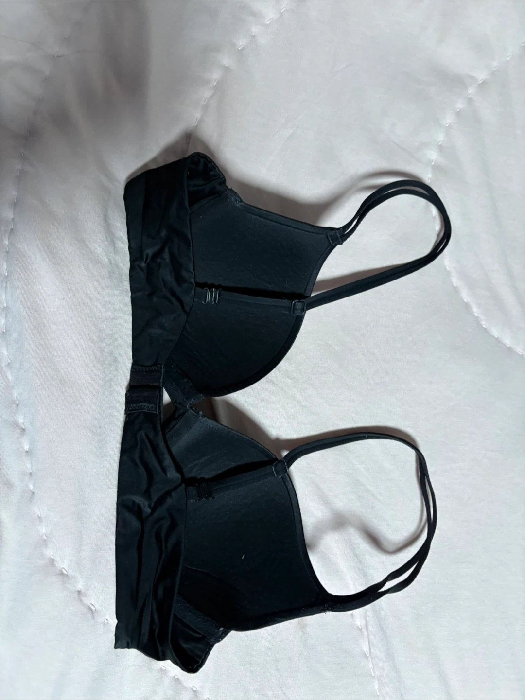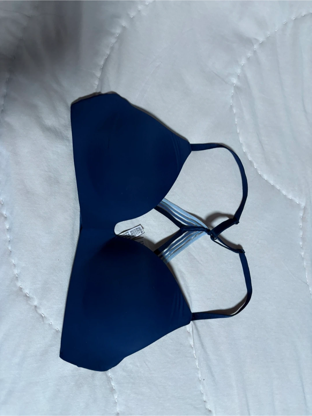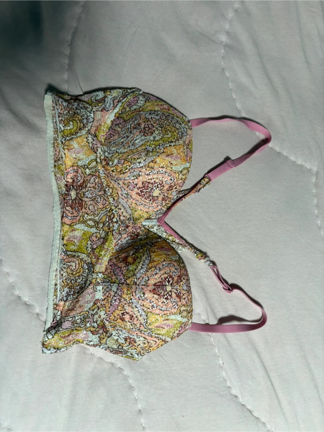 This is a Victoria's Secret "Pink" brand bra. It features adjustable straps and a hook-and-eye closure. Available in black, navy, and a colorful paisley print.
