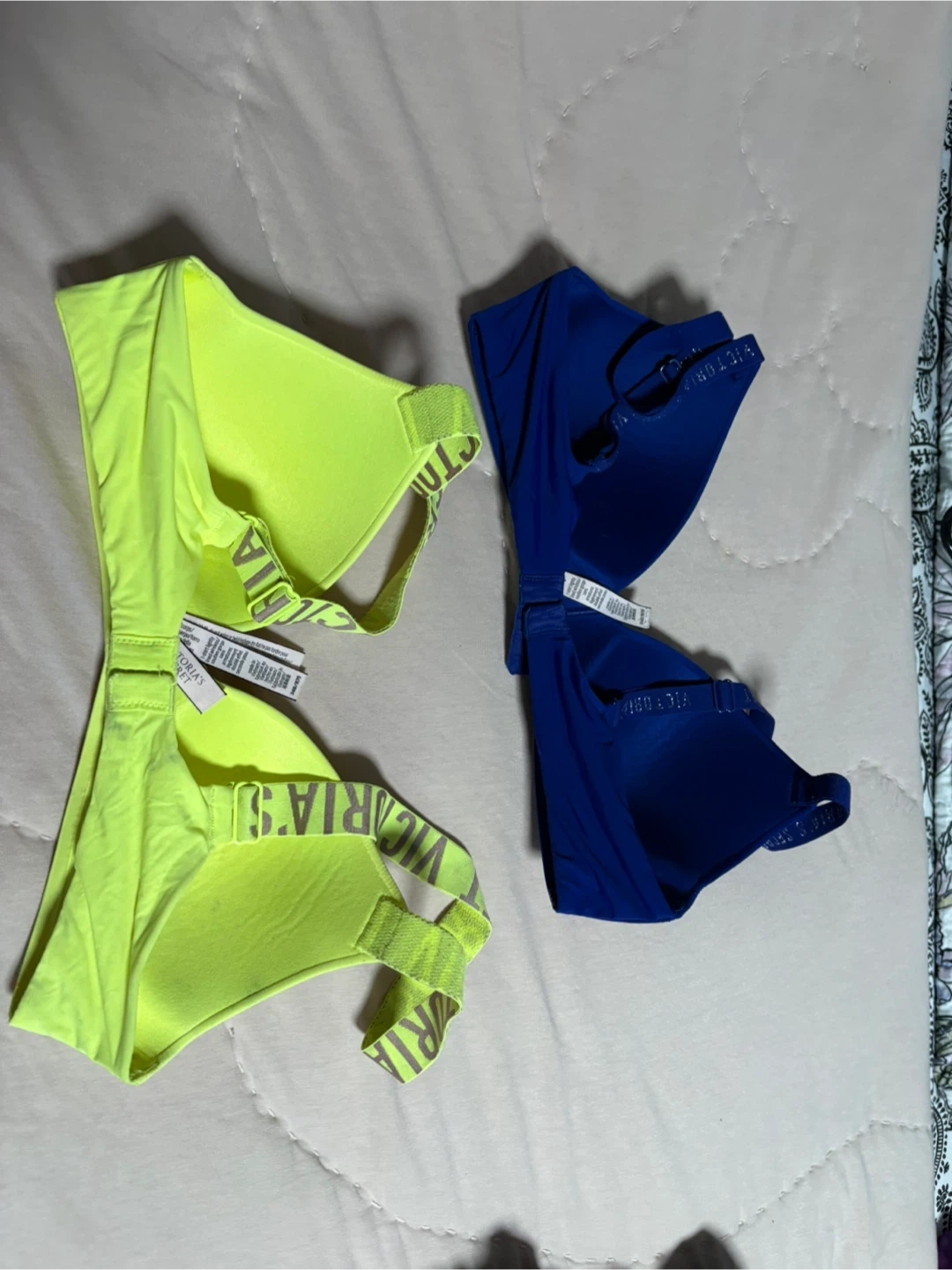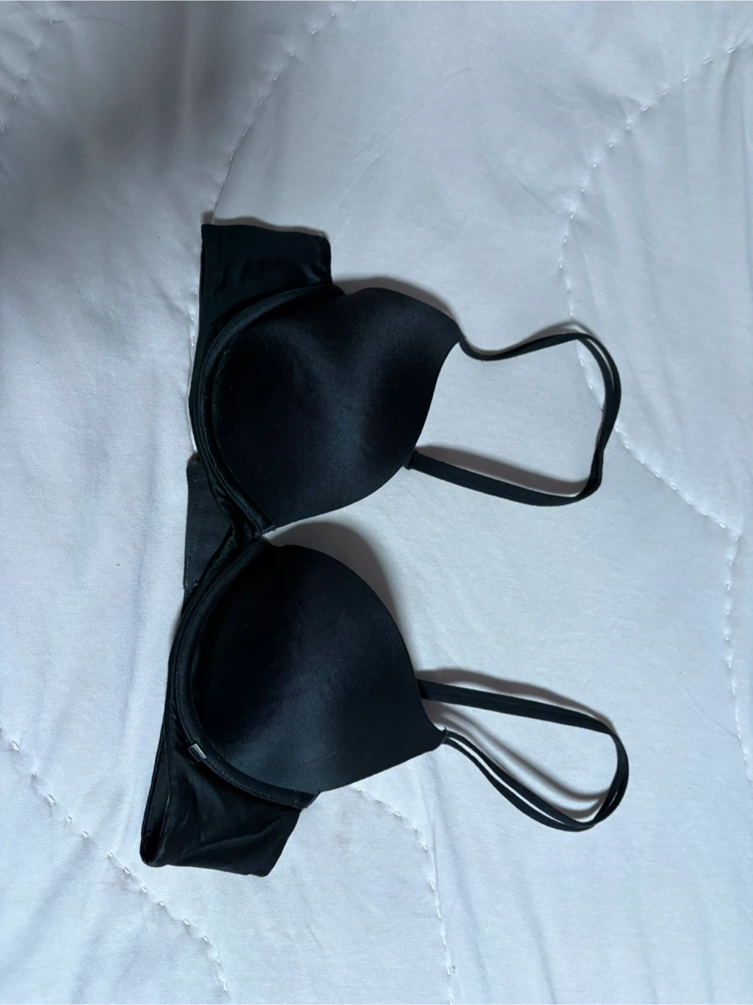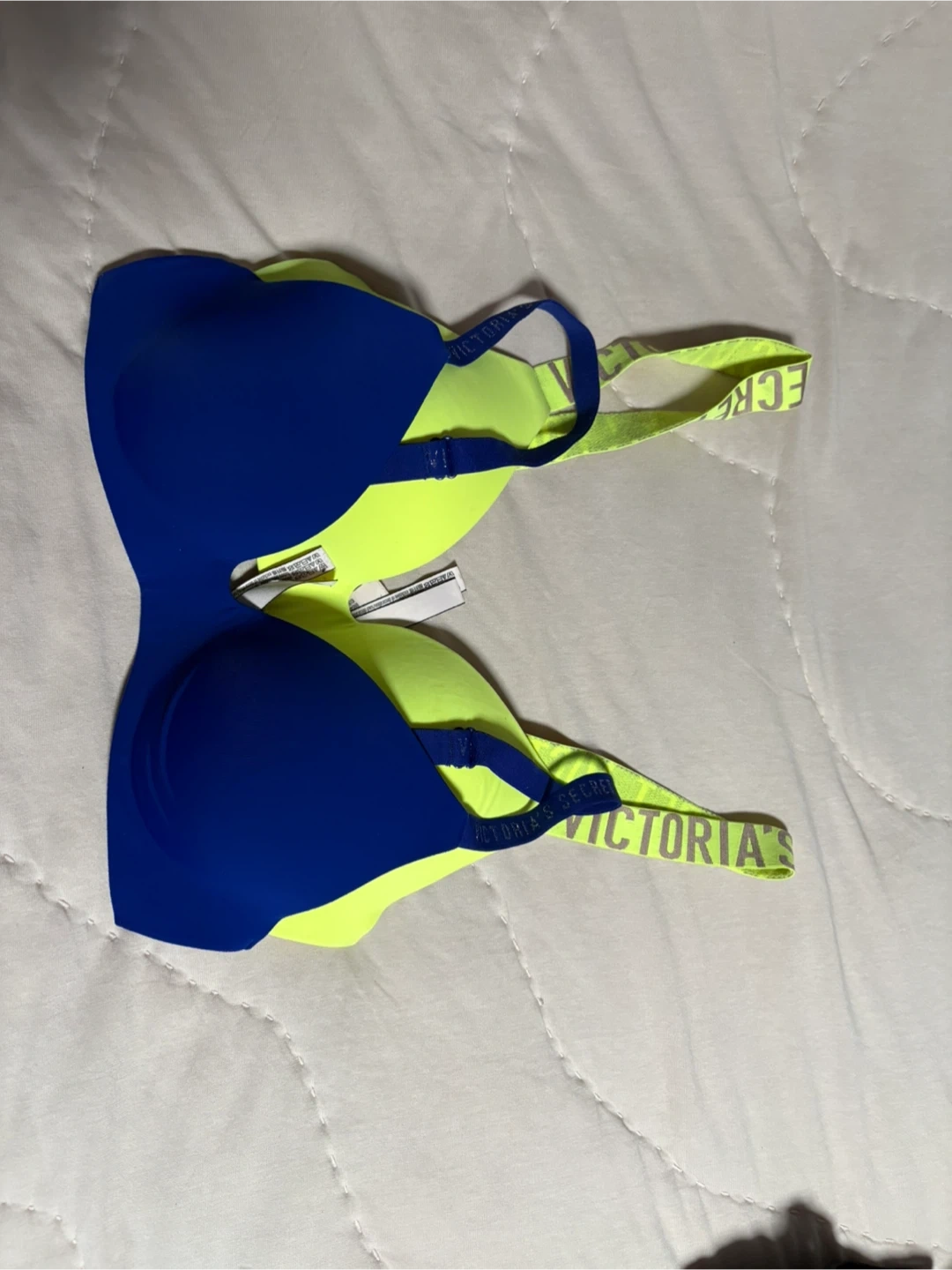 This is a Victoria's Secret "Pink" brand bra. It features adjustable straps and a hook-and-eye closure. Available in black, navy, and a colorful paisley print.