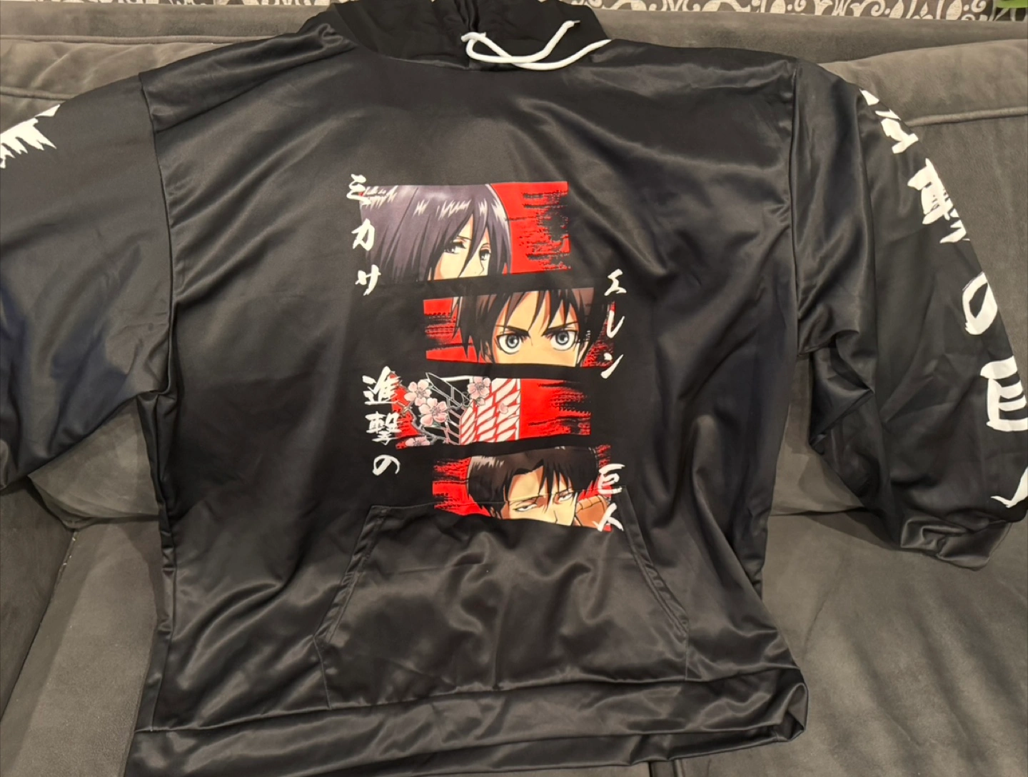 Brand new Black anime hoodie pullover. Features Attack on Titan characters and kanji. 2XL, has a pocket. Smoke free and let from home. In original bag, no tags.