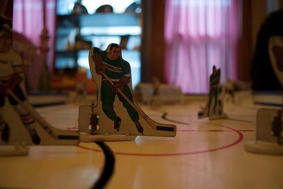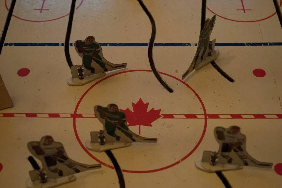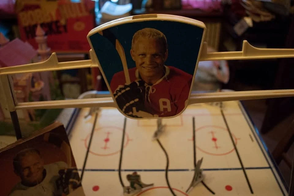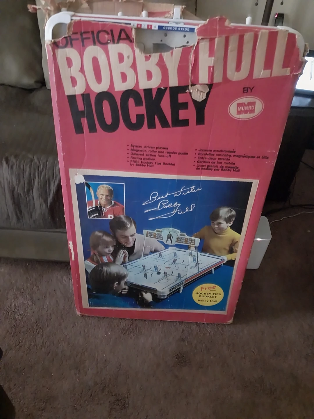 Vintage Bobby Hull Metal Hockey game comes with his Tips on Goal Scoring. Includes metal player figures representing teams like Chicago and Minnesota. Metal board features rink markings and a Canadian maple leaf. A fun retro game for hockey enthusiasts! 🏒