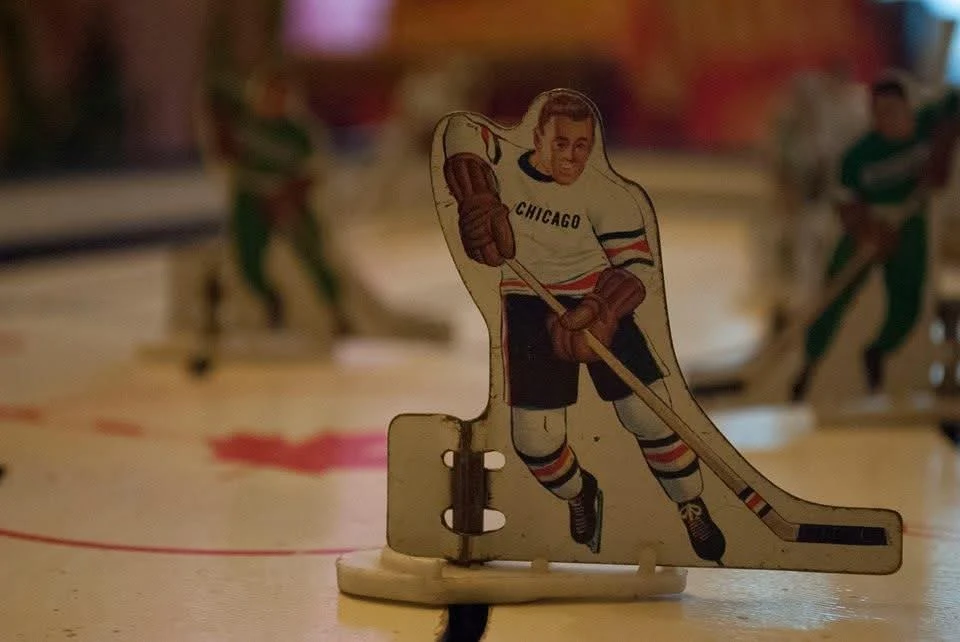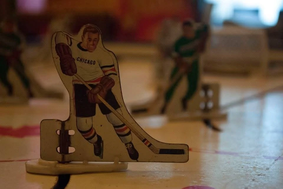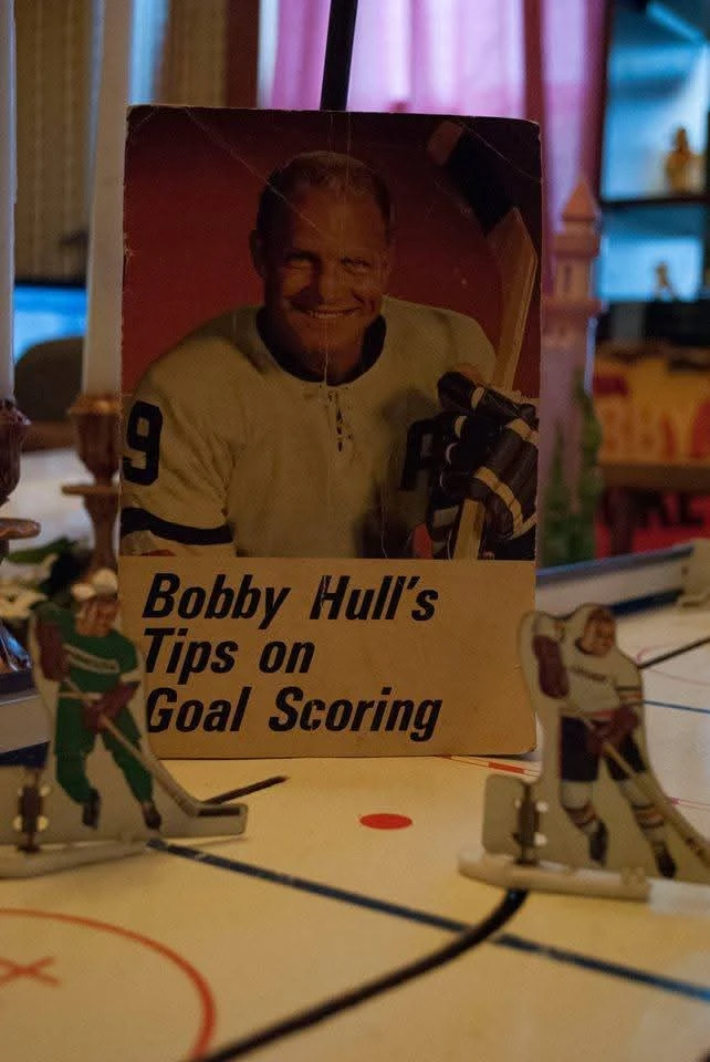 Vintage Bobby Hull Metal Hockey game comes with his Tips on Goal Scoring. Includes metal player figures representing teams like Chicago and Minnesota. Metal board features rink markings and a Canadian maple leaf. A fun retro game for hockey enthusiasts! 🏒