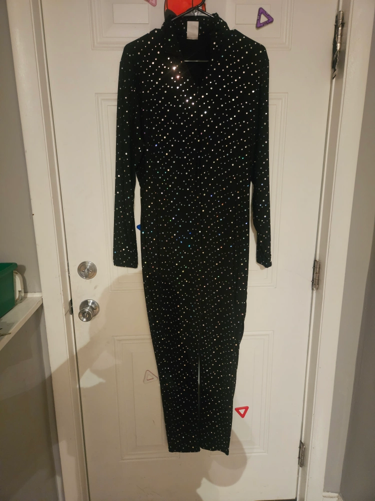 Selling a stylish black sequin jumpsuit in size XL! It's a fun and sparkly piece, perfect for parties or costumes. The material is comfortable and the sequins add a touch of glamour. Get ready to shine!