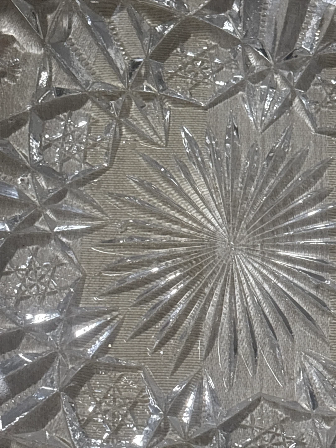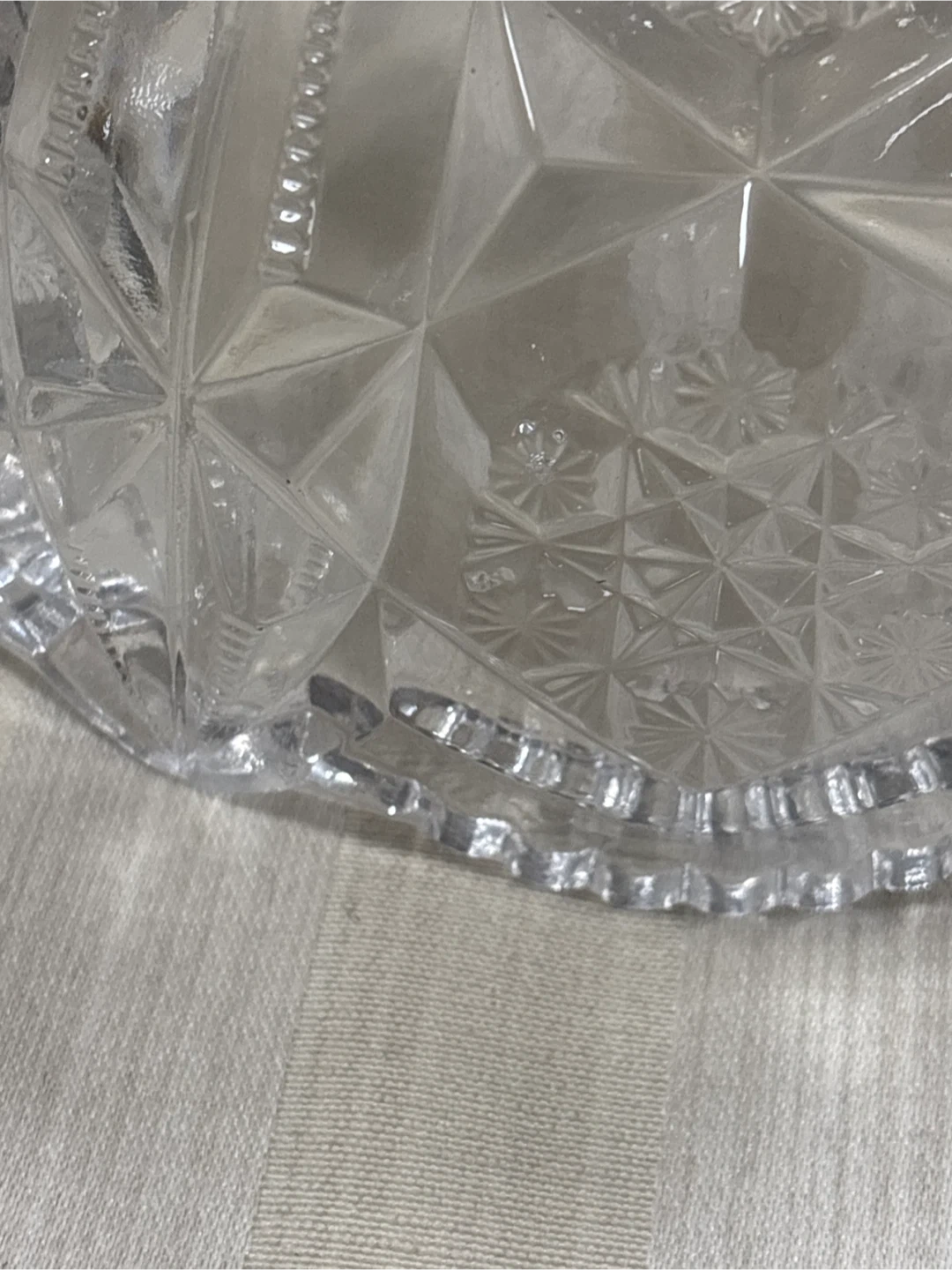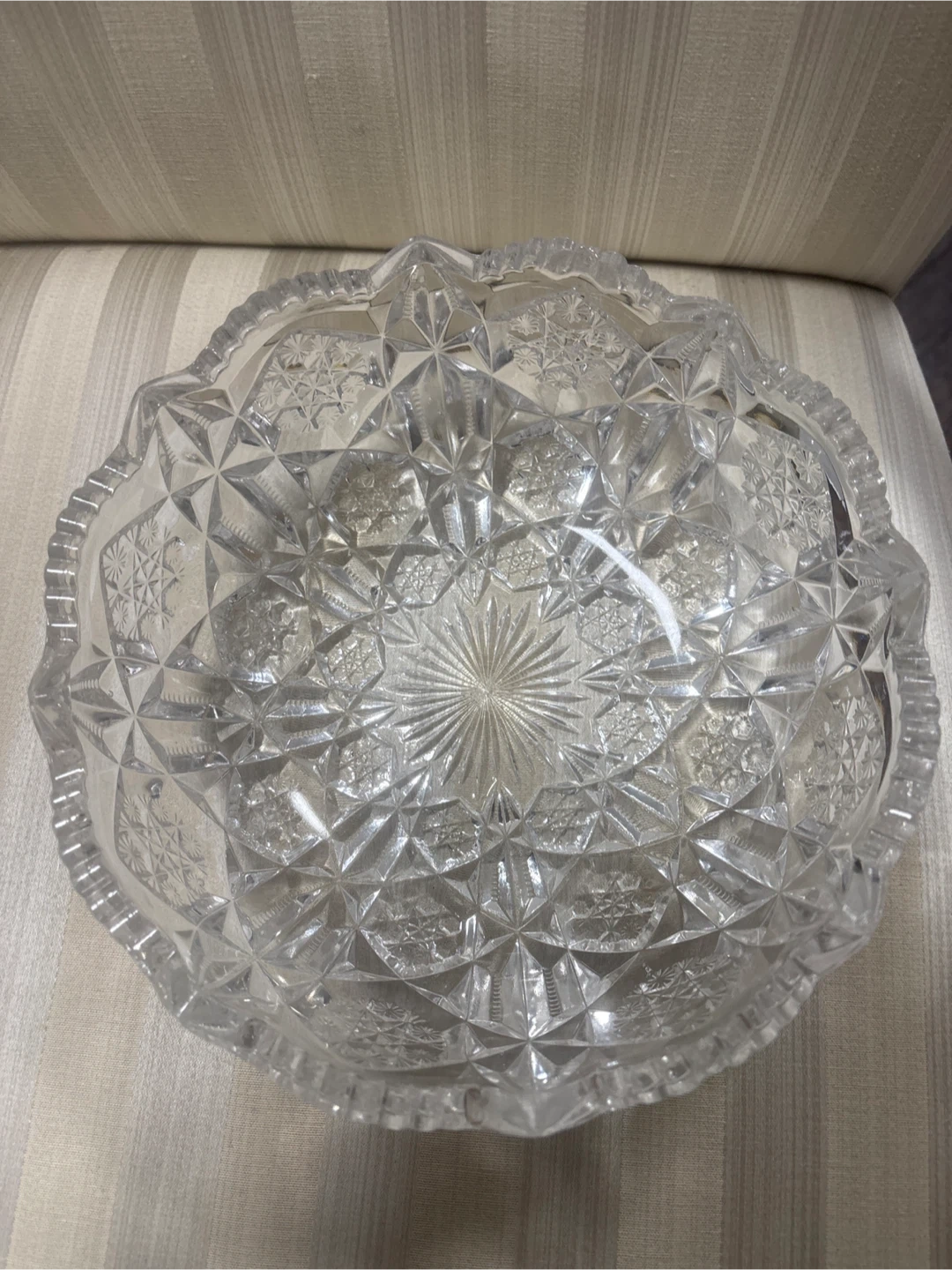 This is a beautiful, clear crystal glass serving bowl. It features intricate, cut glass patterns all around and on the base. Perfect for displaying fruit or serving snacks!