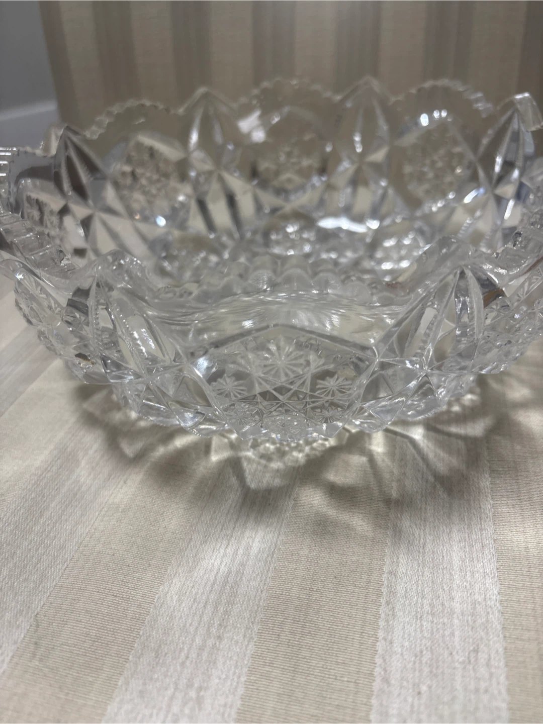 This is a beautiful, clear crystal glass serving bowl. It features intricate, cut glass patterns all around and on the base. Perfect for displaying fruit or serving snacks!
