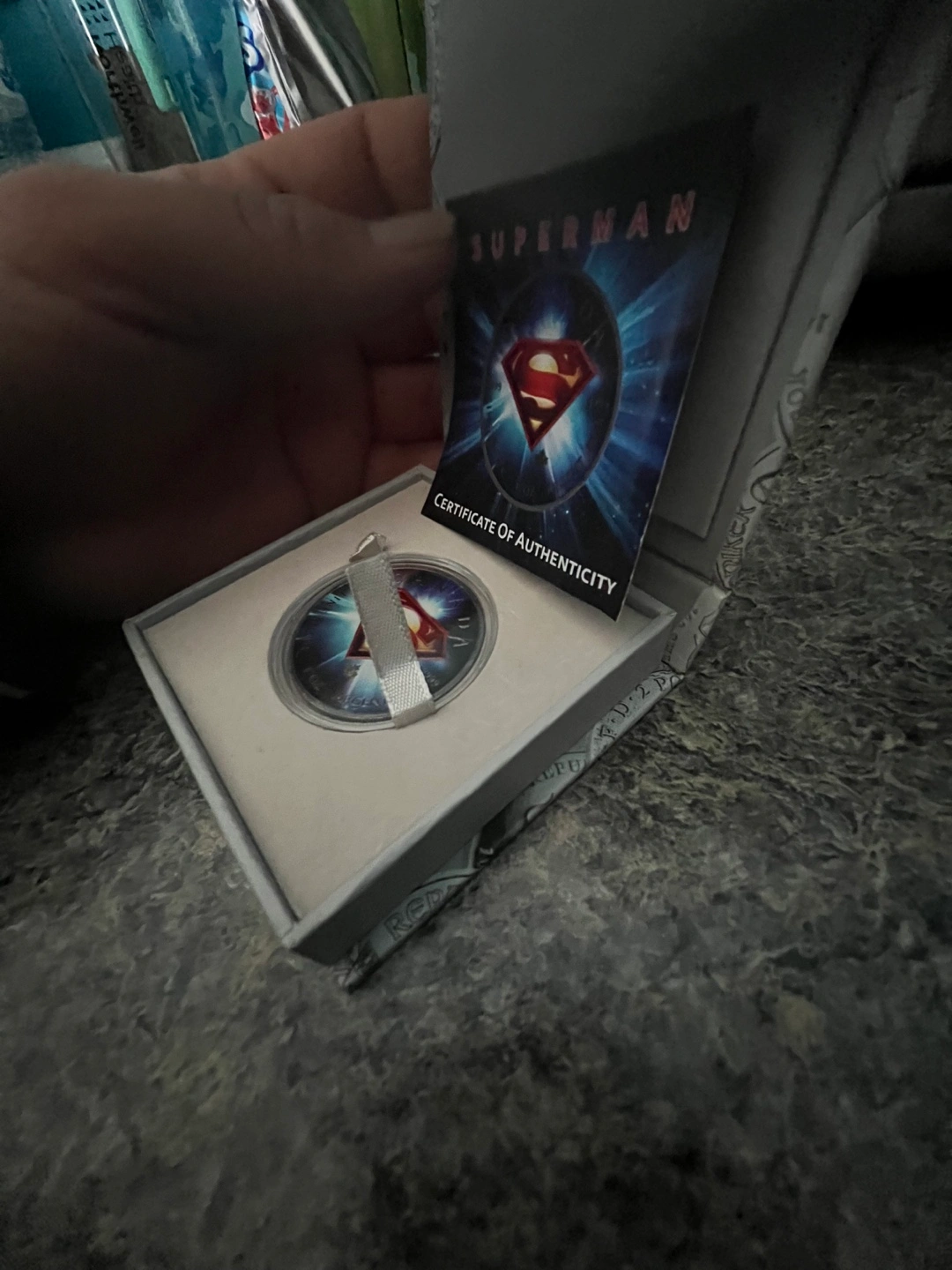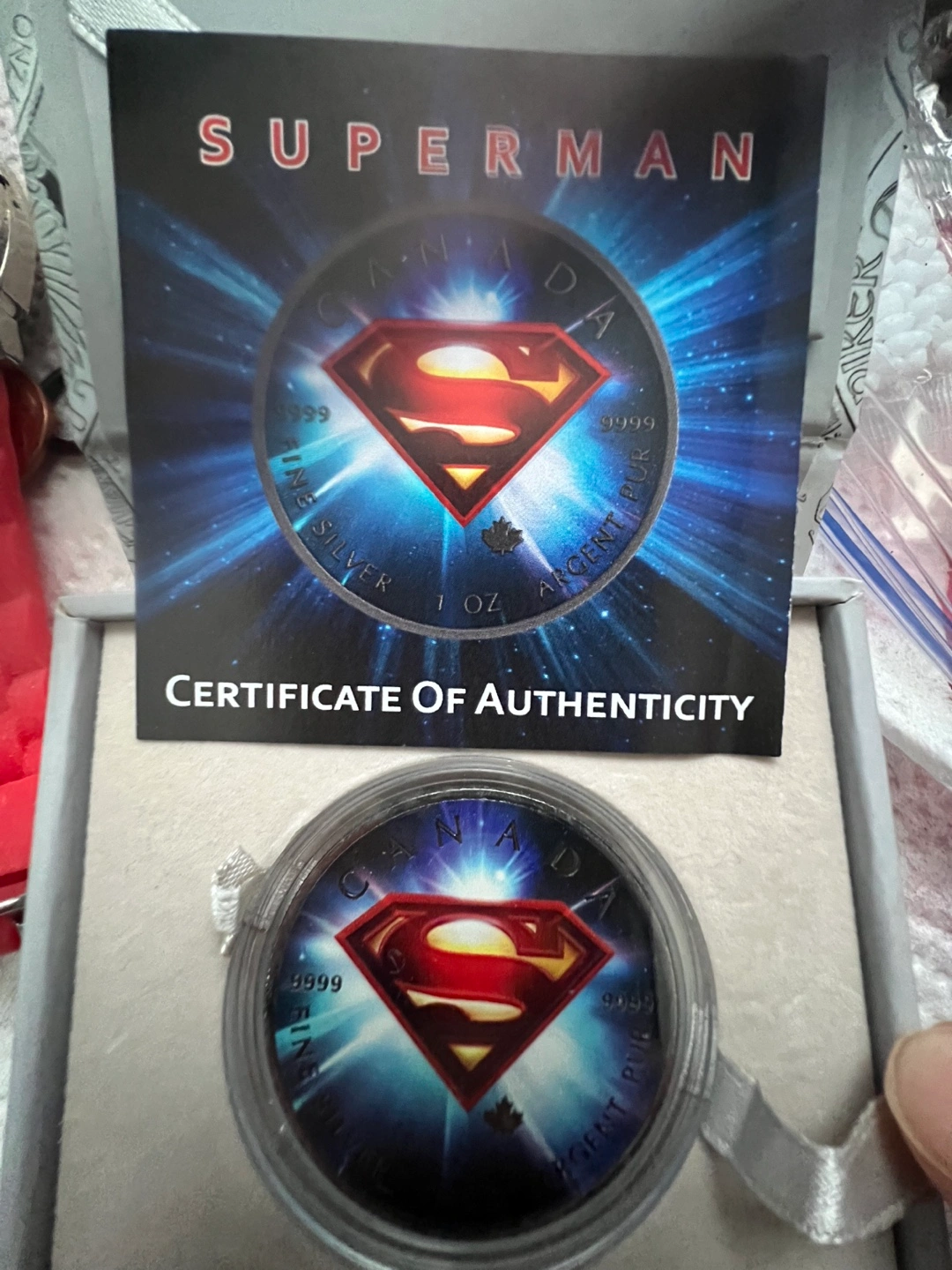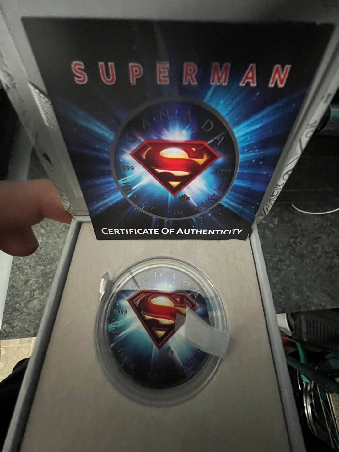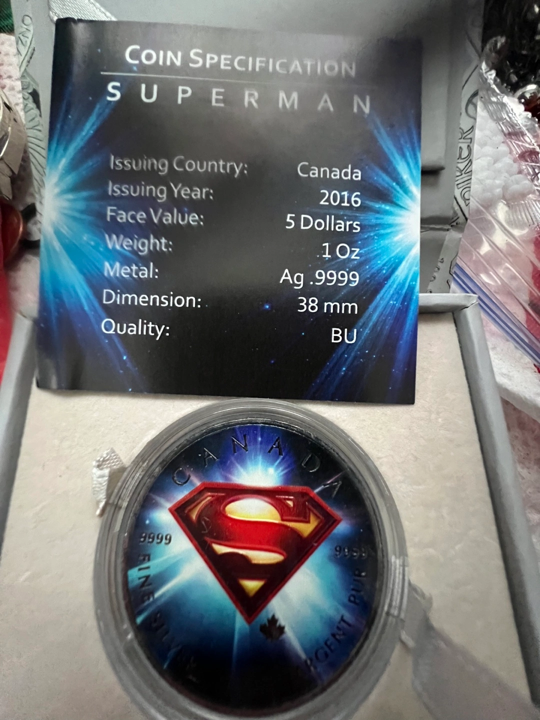 This is a 1 oz .9999 fine silver coin from Canada featuring Superman. It has a face value of 5 Dollars and a dimension of 38 mm. Comes with a certificate of authenticity.