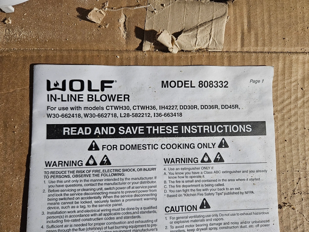 In-line blower. For use with various Wolf models. Domestic cooking use only. Includes instructions. In original box.