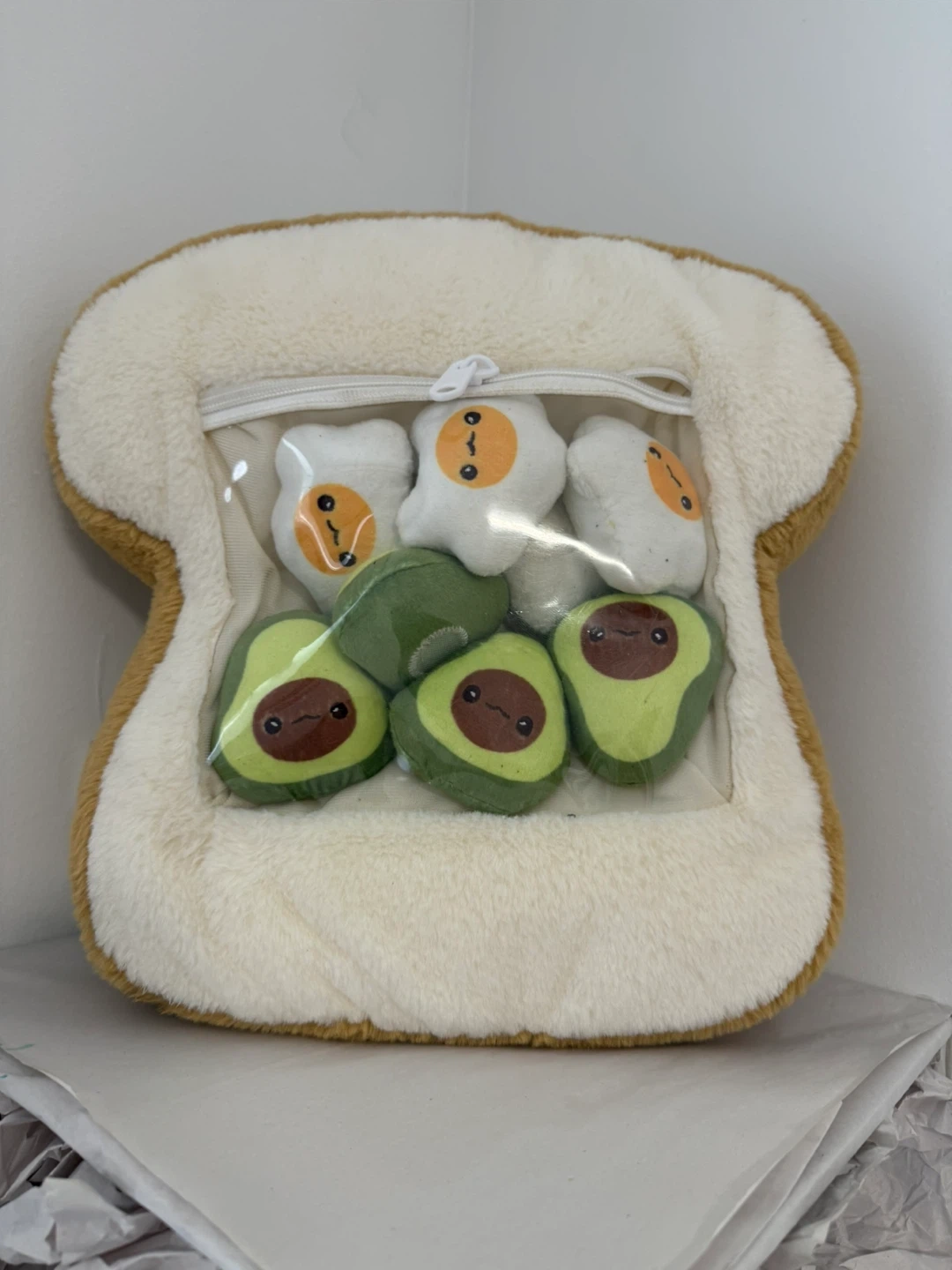 This plush tic tac toe game is shaped like a slice of toast and comes with adorable avocado and fried egg plushies. It's a fun and portable game for kids. Made by Jazwares.