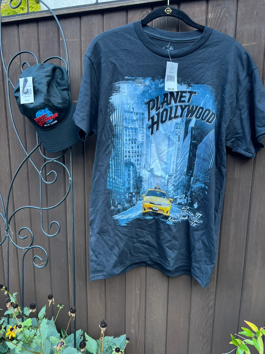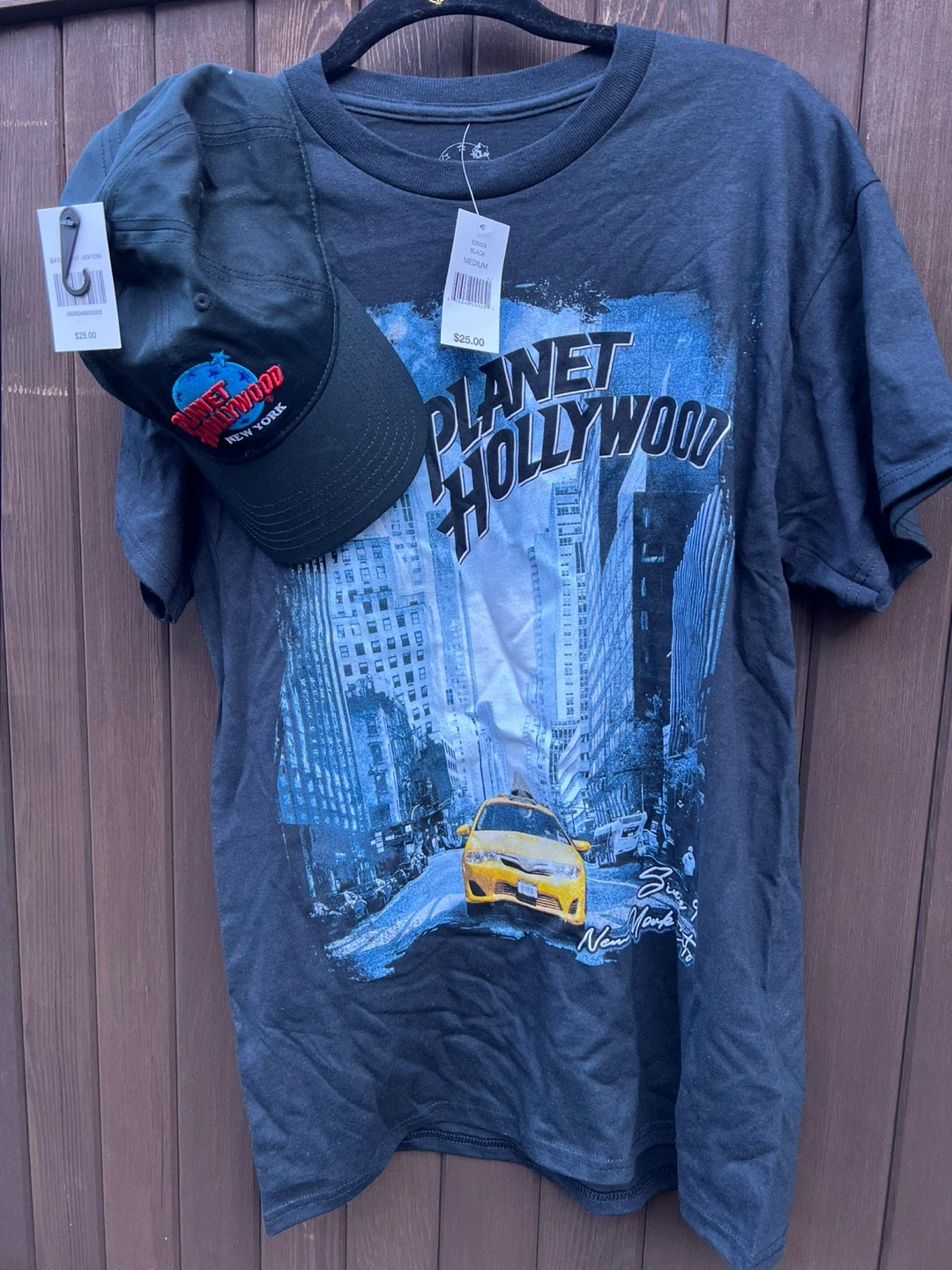 Planet Hollywood New York T-shirt and hat set, both brand new with tags! The shirt is a size medium and the hat is one size fits all. The shirt is black with a cool city scene graphic. Originally bought for $25 each!