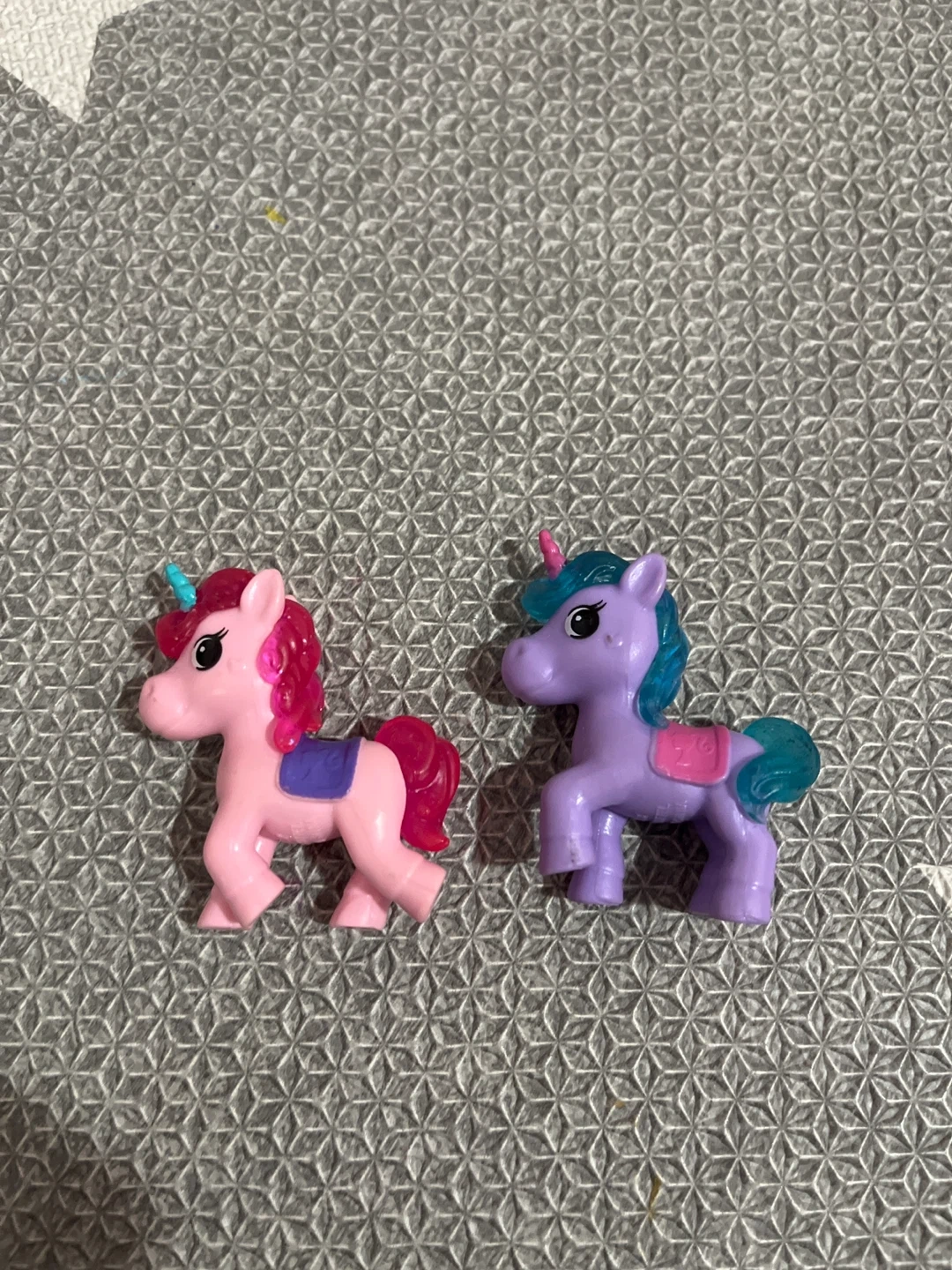 Two small unicorn figurines. One is pink with pink and purple accents. The other is purple with blue and teal accents. Plastic material.