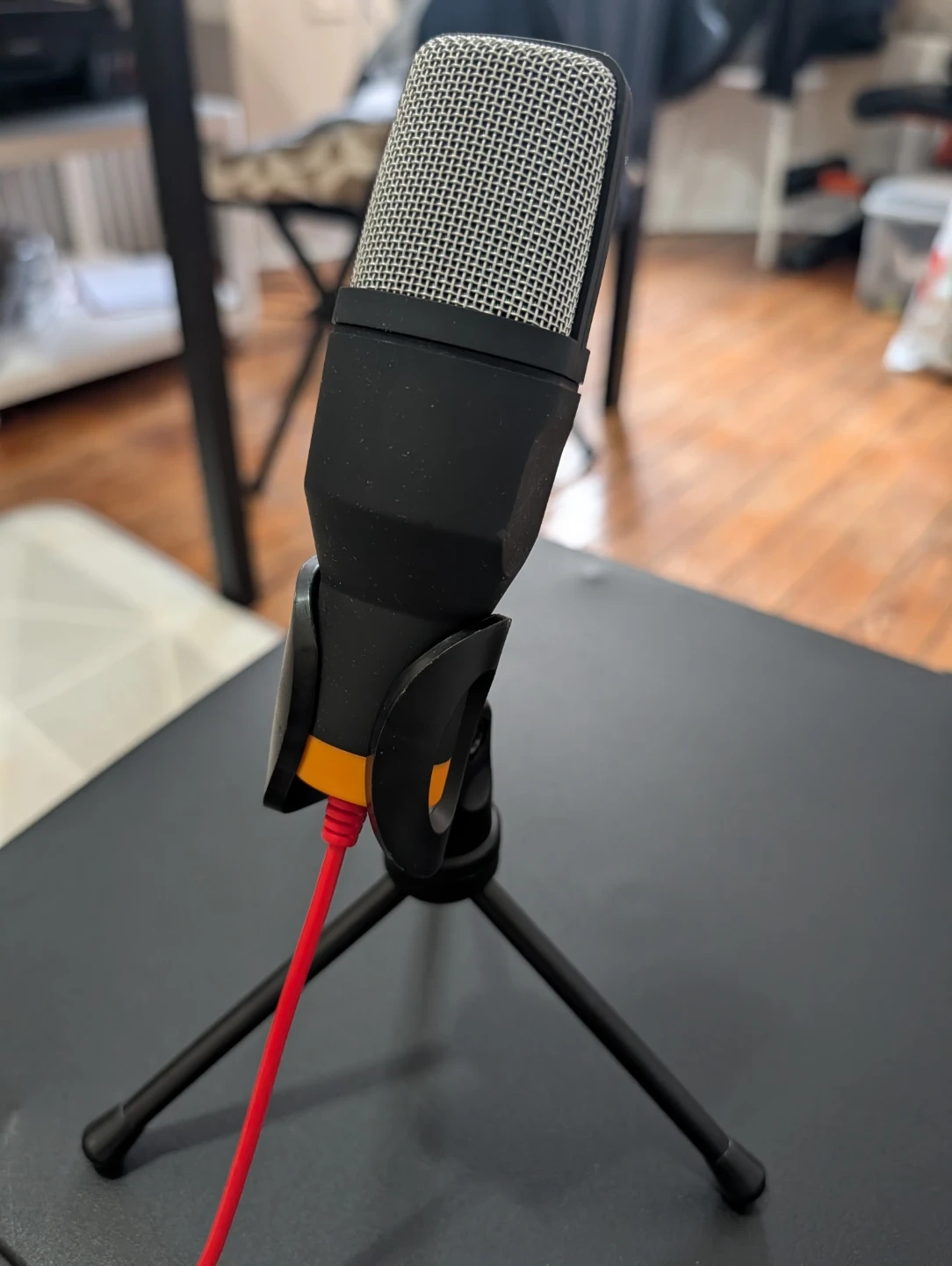 This is a ZAX SOUND SF-666 condenser microphone. It's a compact microphone with a mesh grille and a red cable. Comes with a mini tripod stand for easy placement.