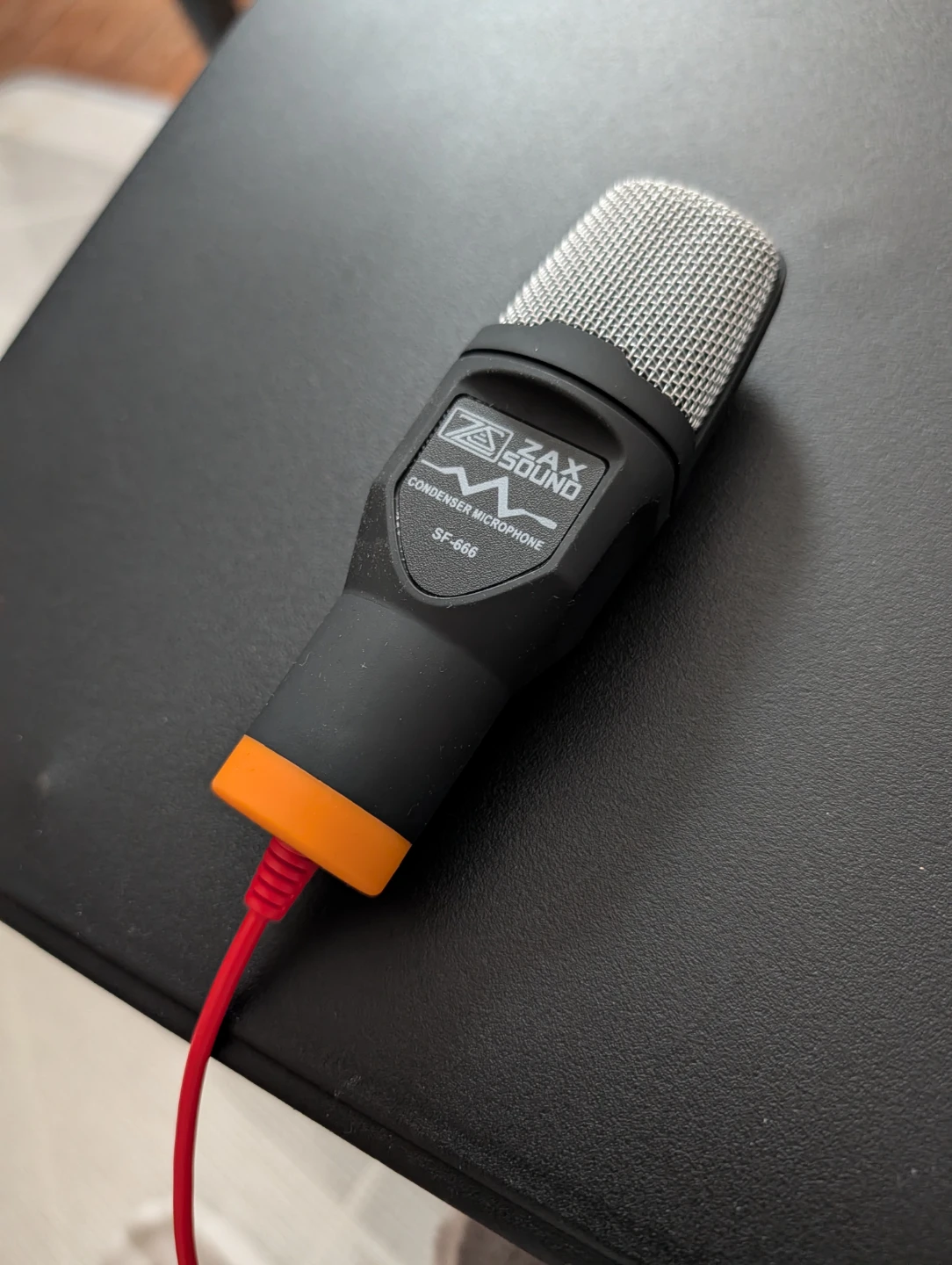 This is a ZAX SOUND SF-666 condenser microphone. It's a compact microphone with a mesh grille and a red cable. Comes with a mini tripod stand for easy placement.