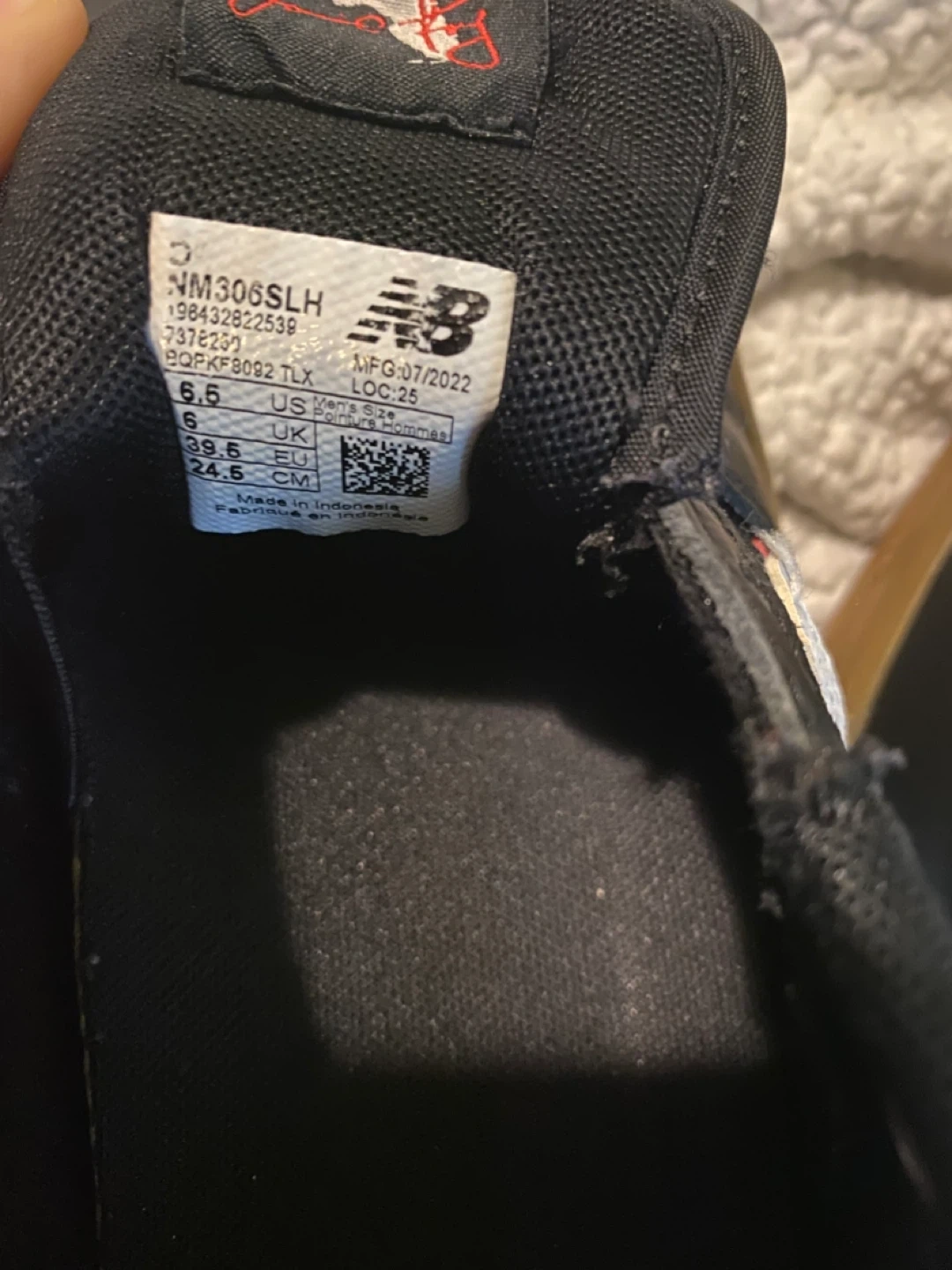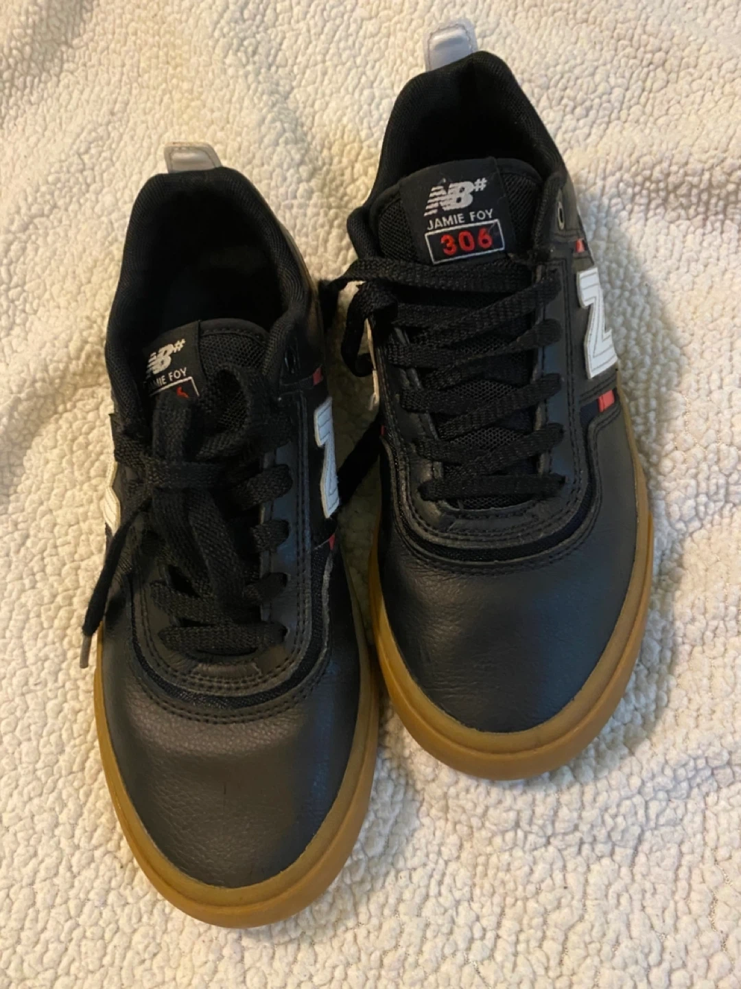 New Balance Jamie Foy 306 skate shoes in black and gum. Men's US size 6.5. Manufactured 07/2022. These shoes offer a durable design for skateboarding.