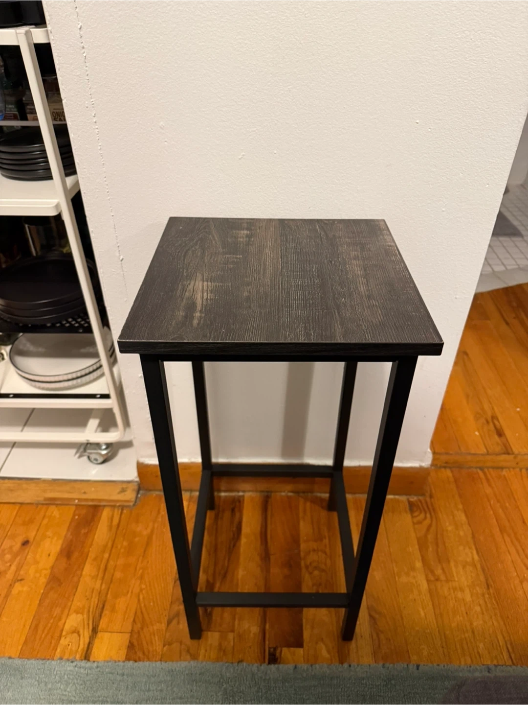These stools can also be used as side tables. They have a wood grain top and a black metal frame. It's a simple, stylish piece for any room. Its compact size makes it easy to place in various spaces. Useful for holding drinks, books, or decor.