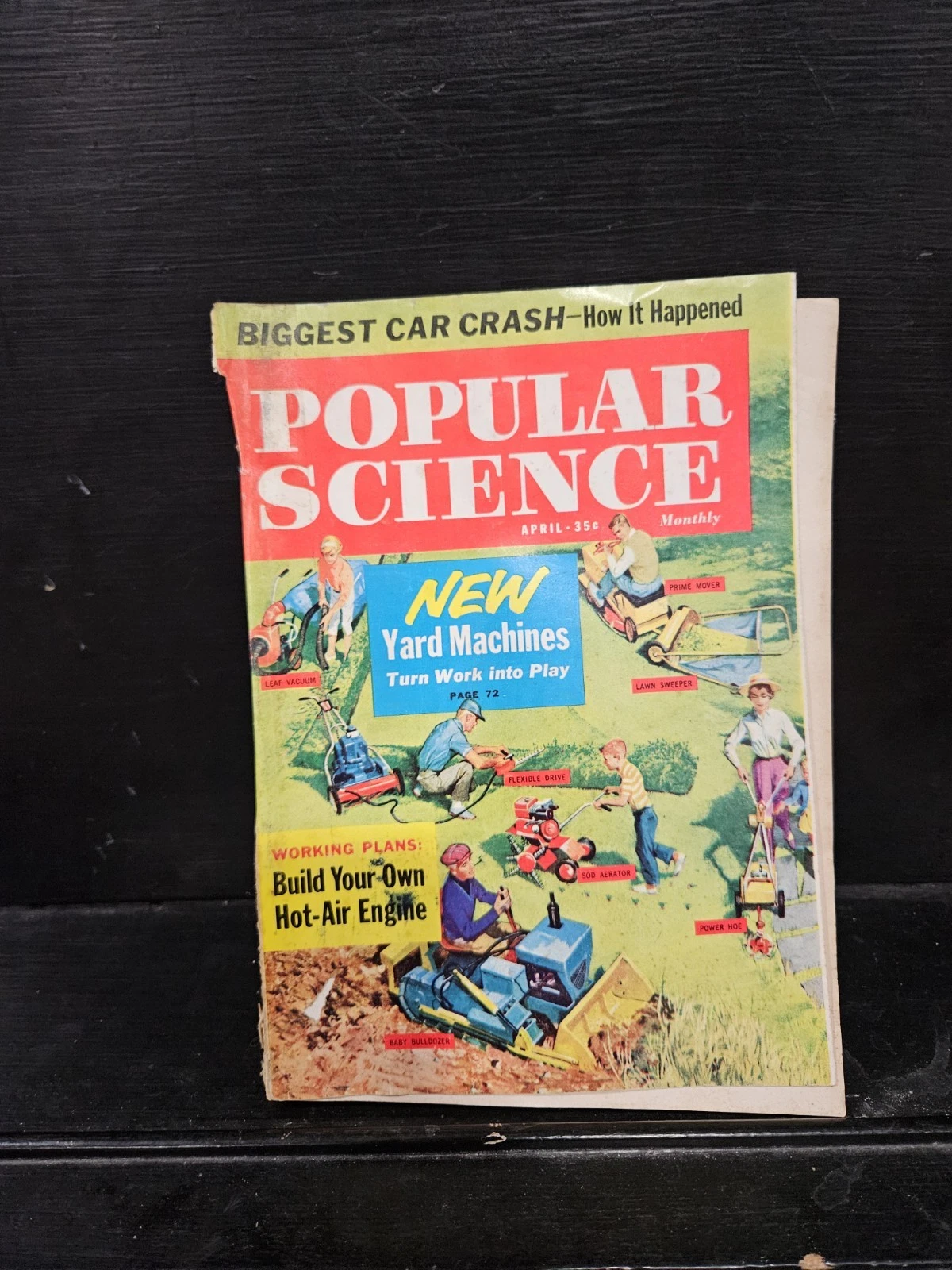 This is a 1961 April issue of Popular Science magazine. It features articles on building a hot-air engine, yard machines, and car crashes. It's a first edition, illustrated, and covers science, engineering, and cars from the 1960s.