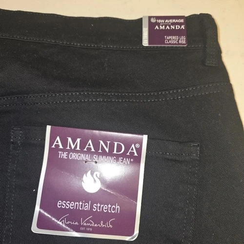 These are a pair of NWT Gloria Vanderbilt Amanda Jeans in size 16W Average, designed for plus-size women. They come in a sleek black color and feature a slimming style, making them both stylish and flattering. Made by Gloria Vanderbilt, these jeans are of high quality and offer a straight leg fit for a classic and timeless look. Perfect for everyday wear or dressed up for a special occasion, these jeans are sure to become a staple in any woman's wardrobe.