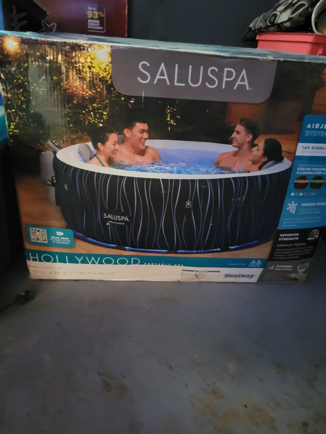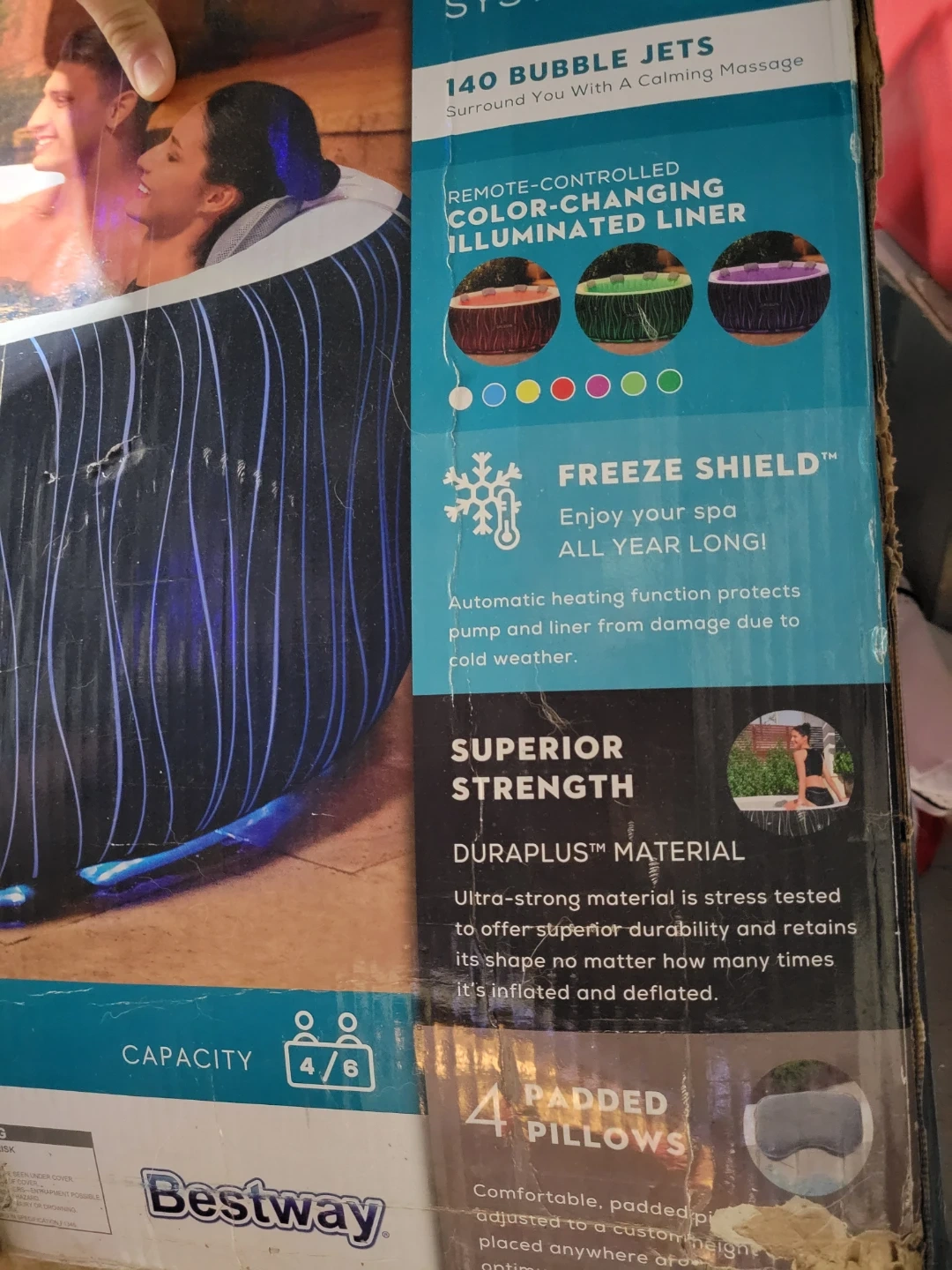 This Bestway Saluspa Hollywood portable spa features 140 bubble jets and a remote-controlled color-changing illuminated liner. It's made with ultra-strong DuraPlus material for superior durability. The Freeze Shield technology allows for year-round spa use, as the automatic heating function protects the pump and liner from damage due to cold weather.