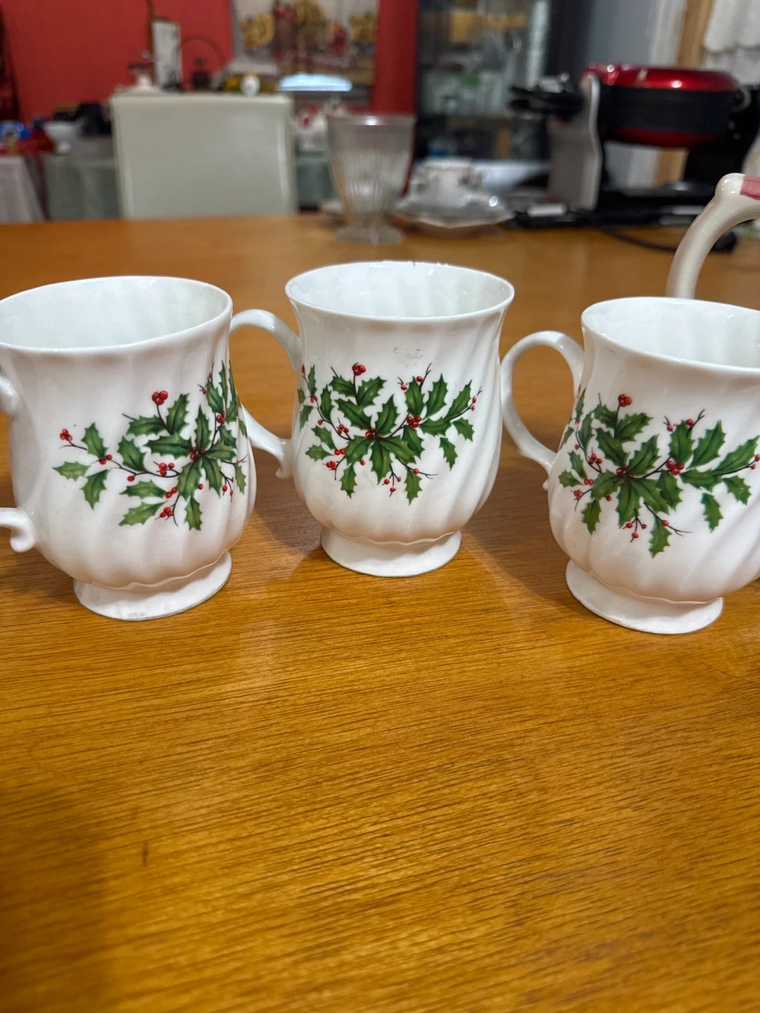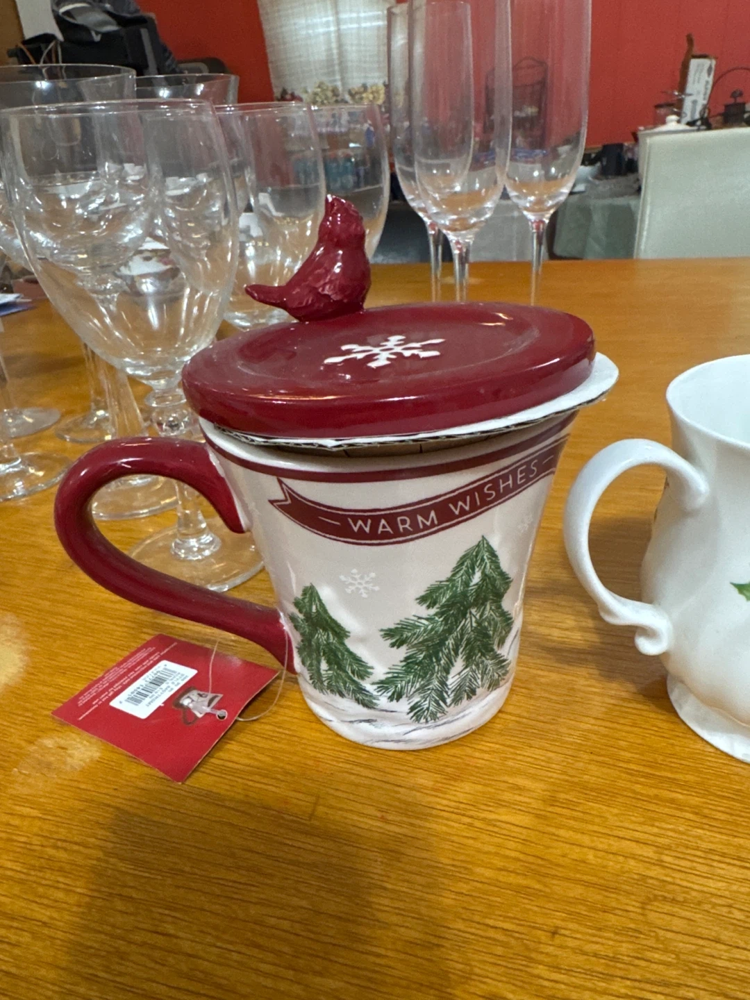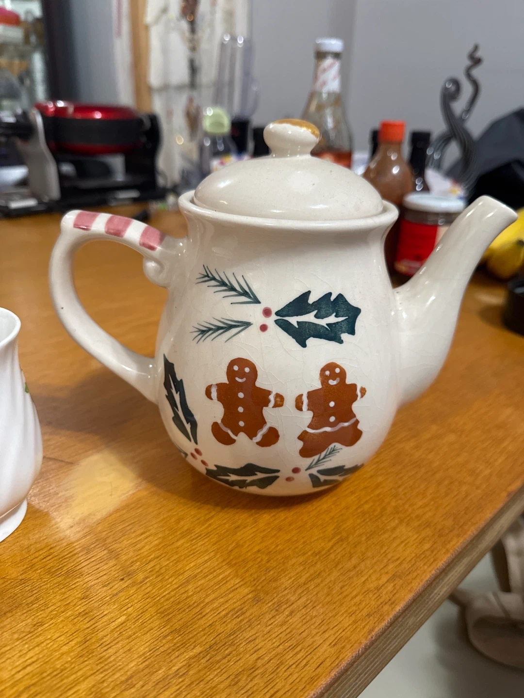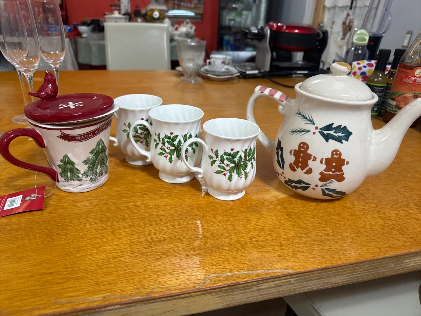 Selling a festive holiday tea set! It includes a teapot with a cute gingerbread man design, three mugs with holly leaves, and a lidded mug with a Christmas tree and cardinal design. Perfect for cozy winter gatherings