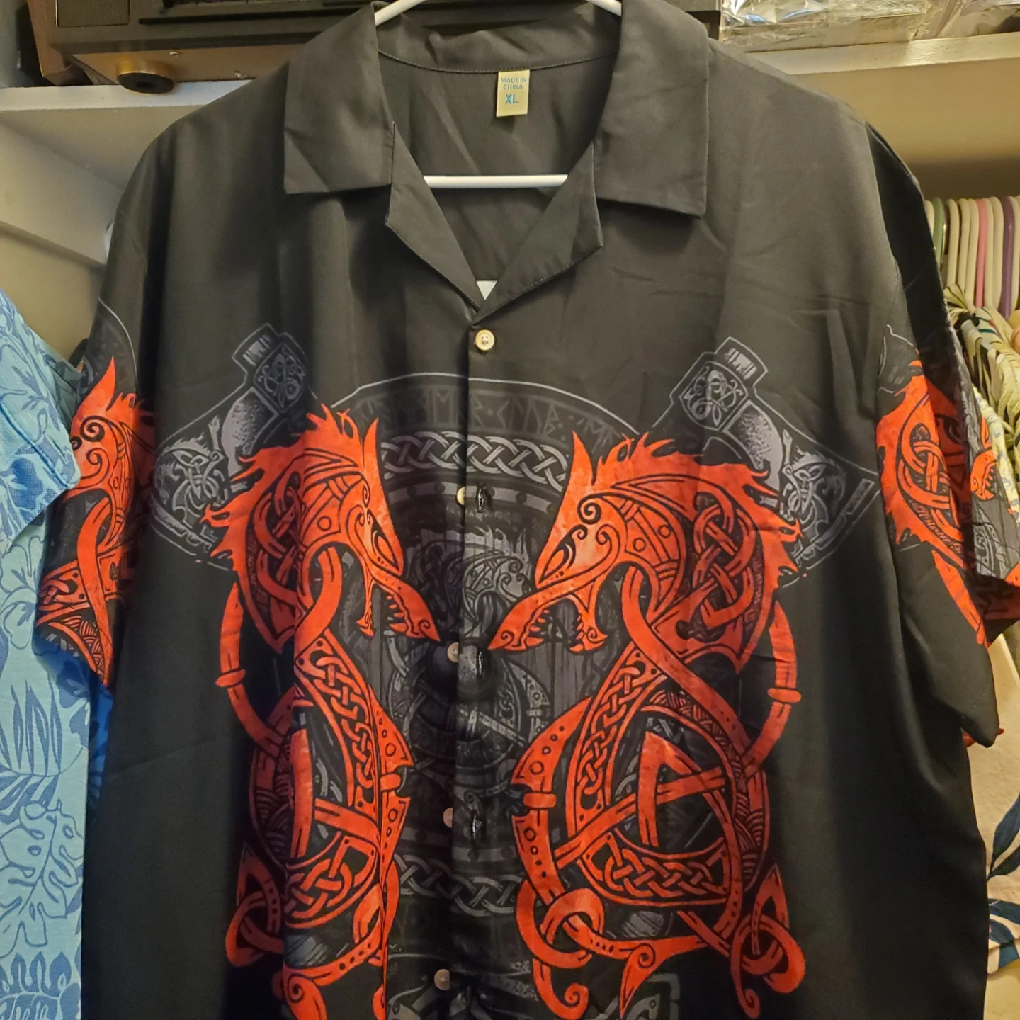 18I'm selling a button-down shirt with a unique Viking dragon design. It's a size XL and features a cool red and gray dragon graphic on a black background. Perfect for anyone who loves Norse mythology or just wants a standout shirt!