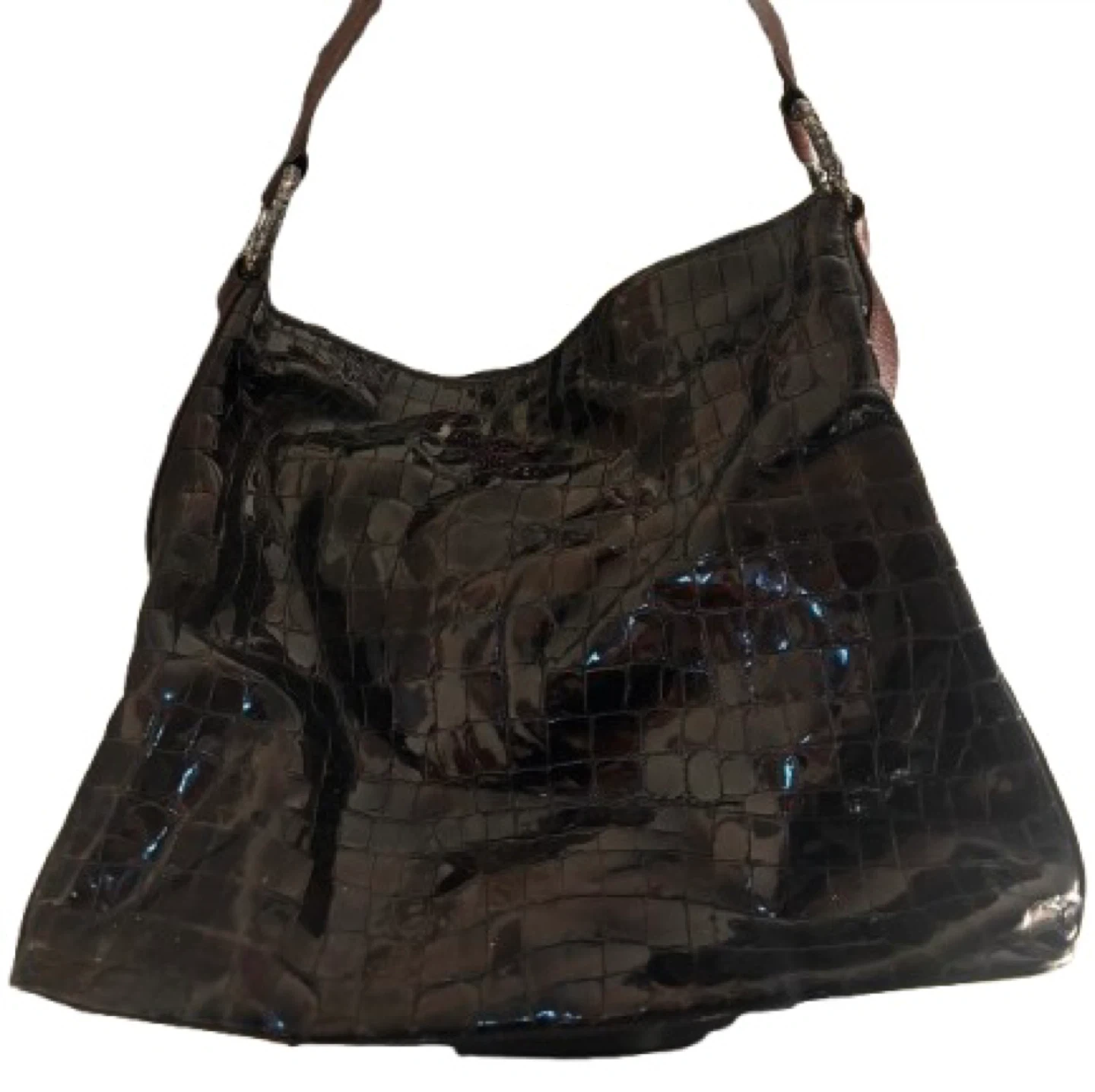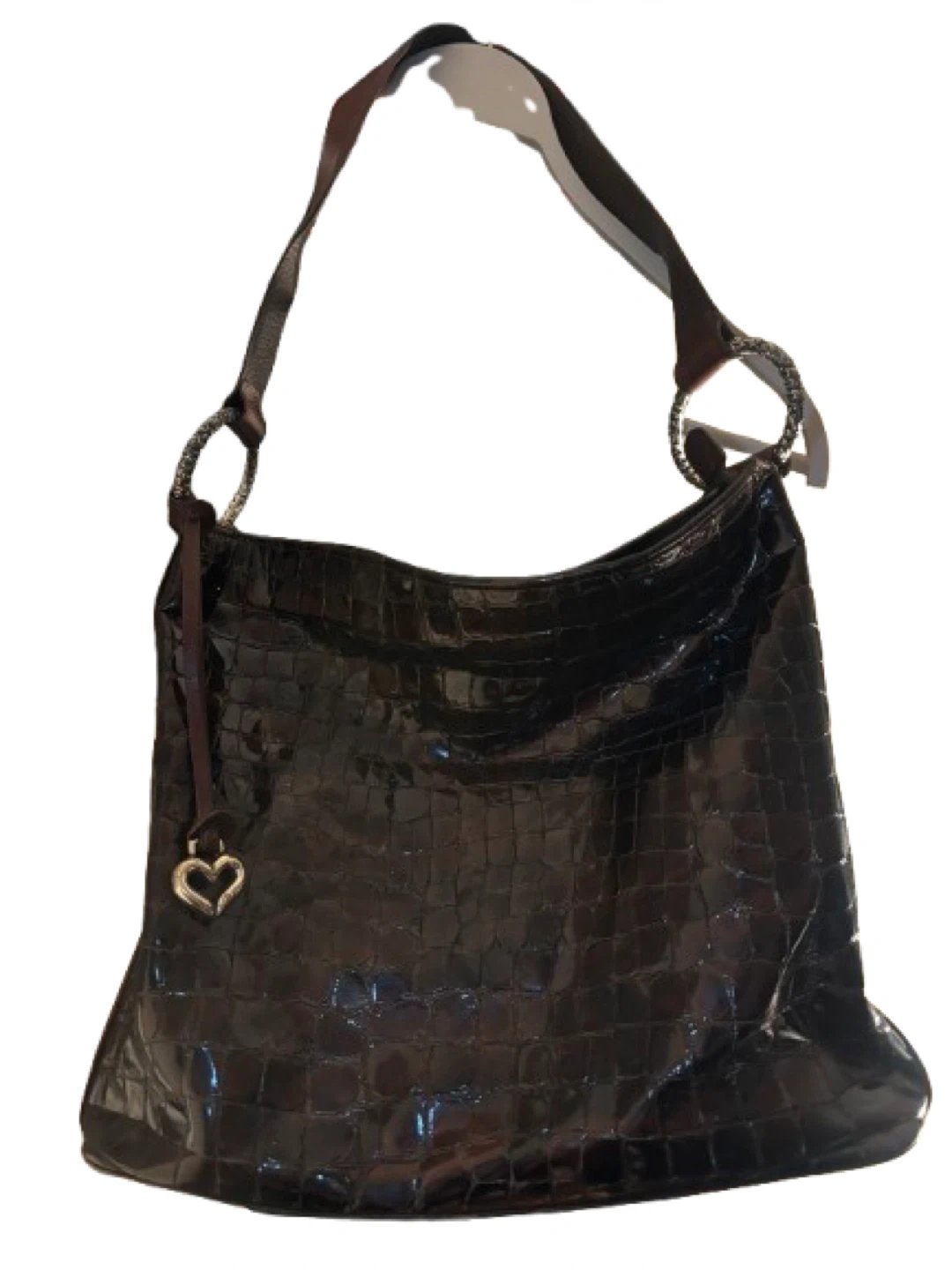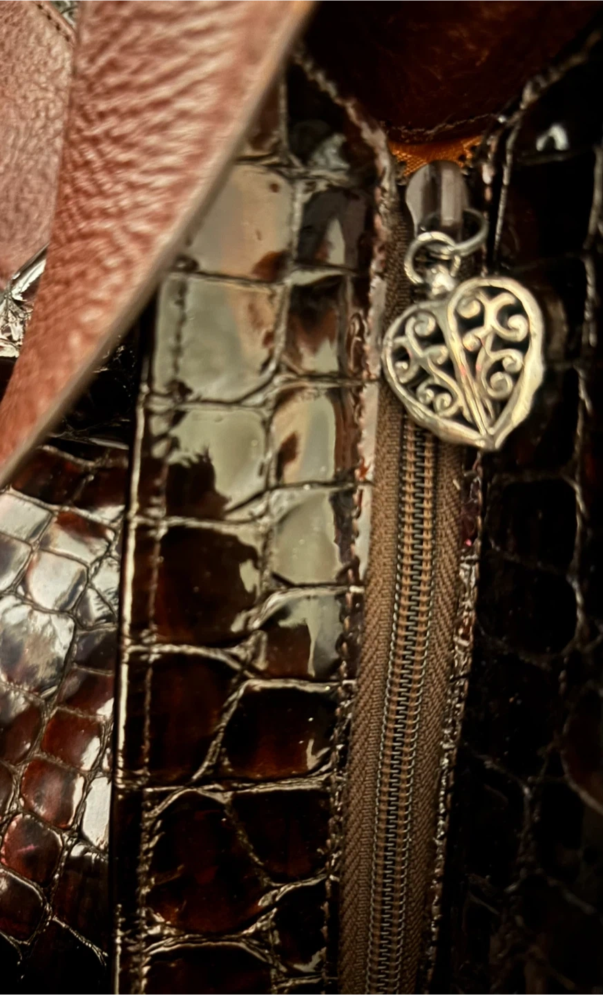 Brighton shoulder bag in a brown patent finish with a croc embossed texture. It features a decorative heart charm on the zipper pull. The interior lining has a unique patterned design.