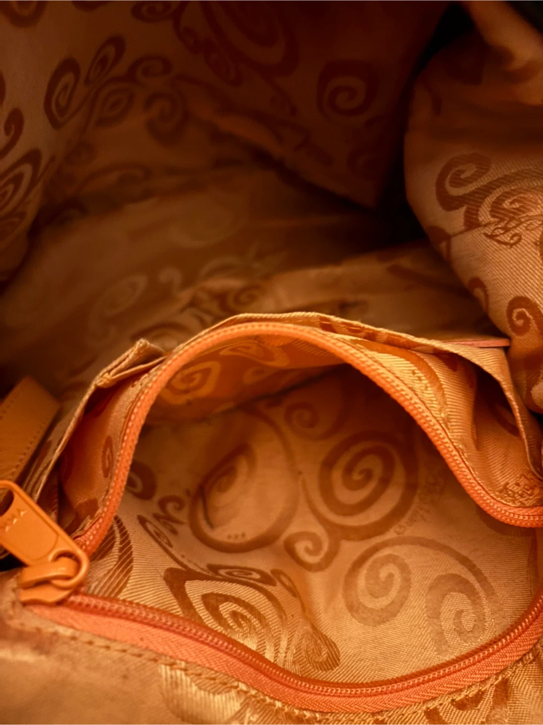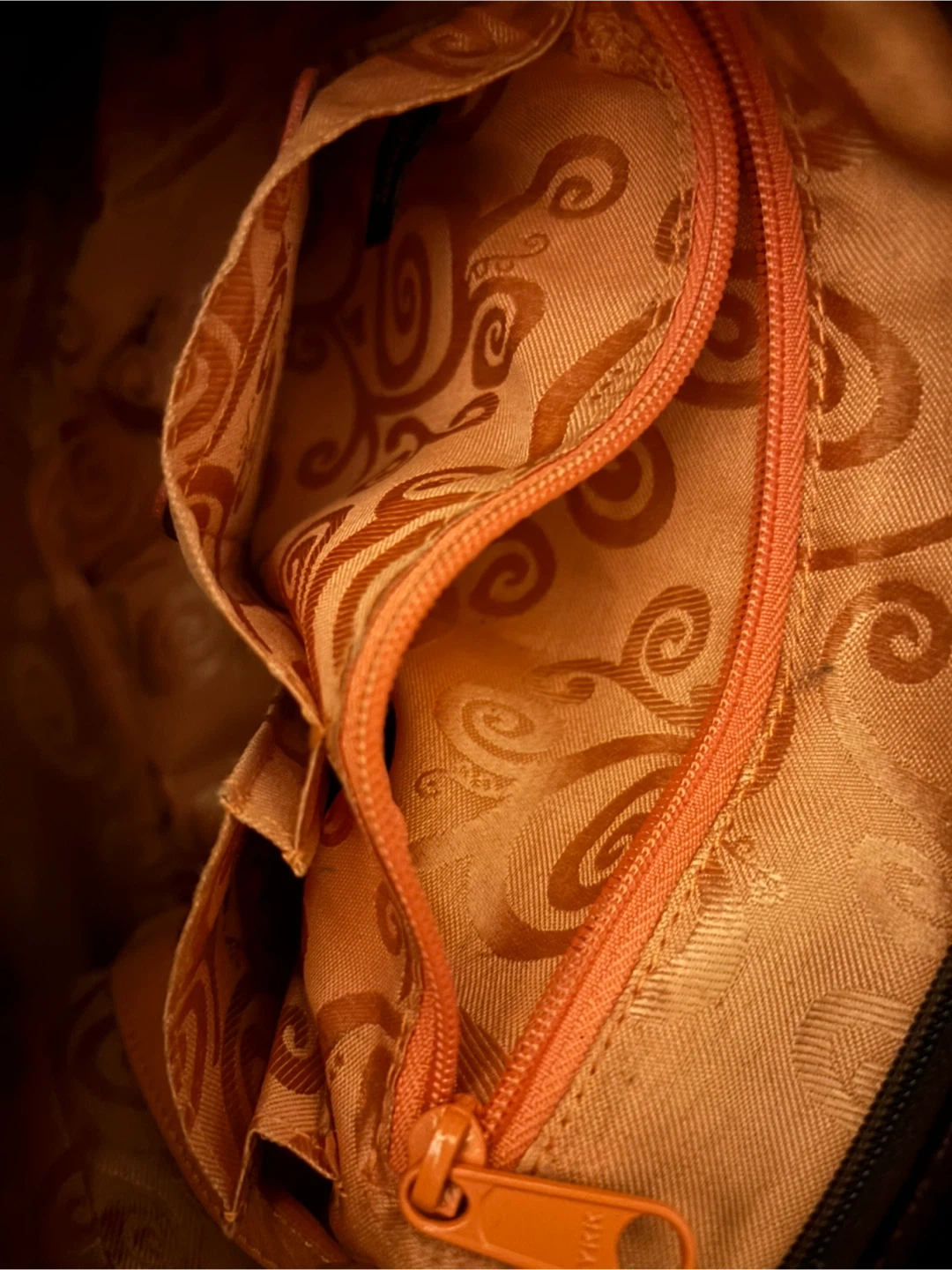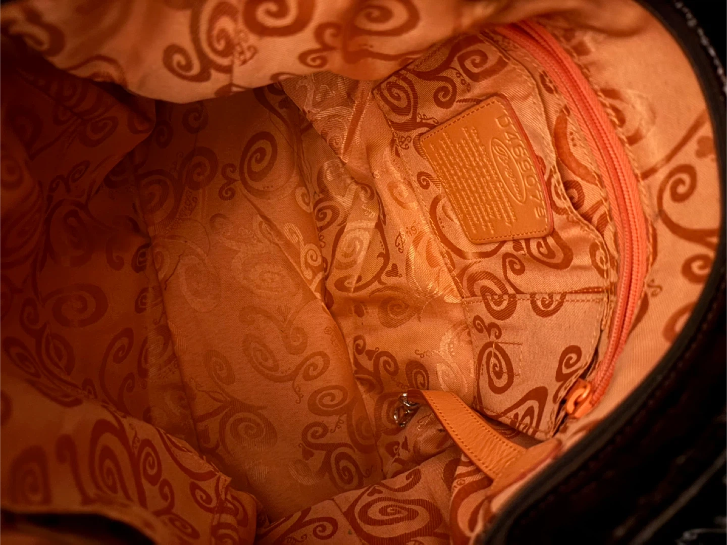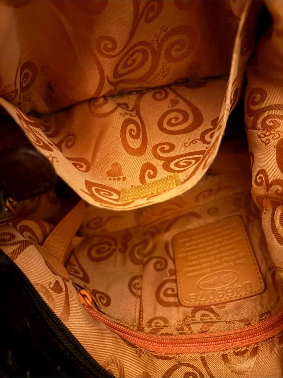 Brighton shoulder bag in a brown patent finish with a croc embossed texture. It features a decorative heart charm on the zipper pull. The interior lining has a unique patterned design.