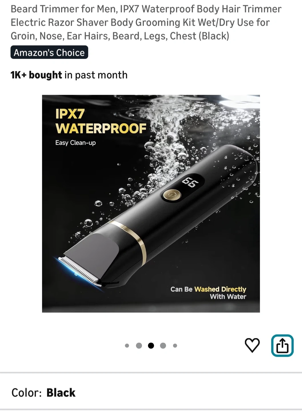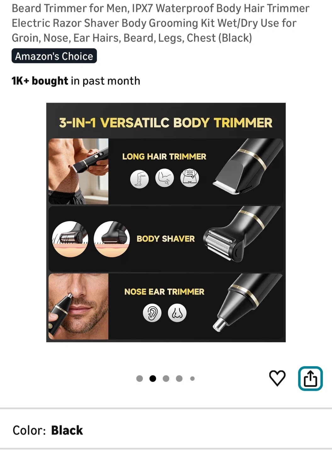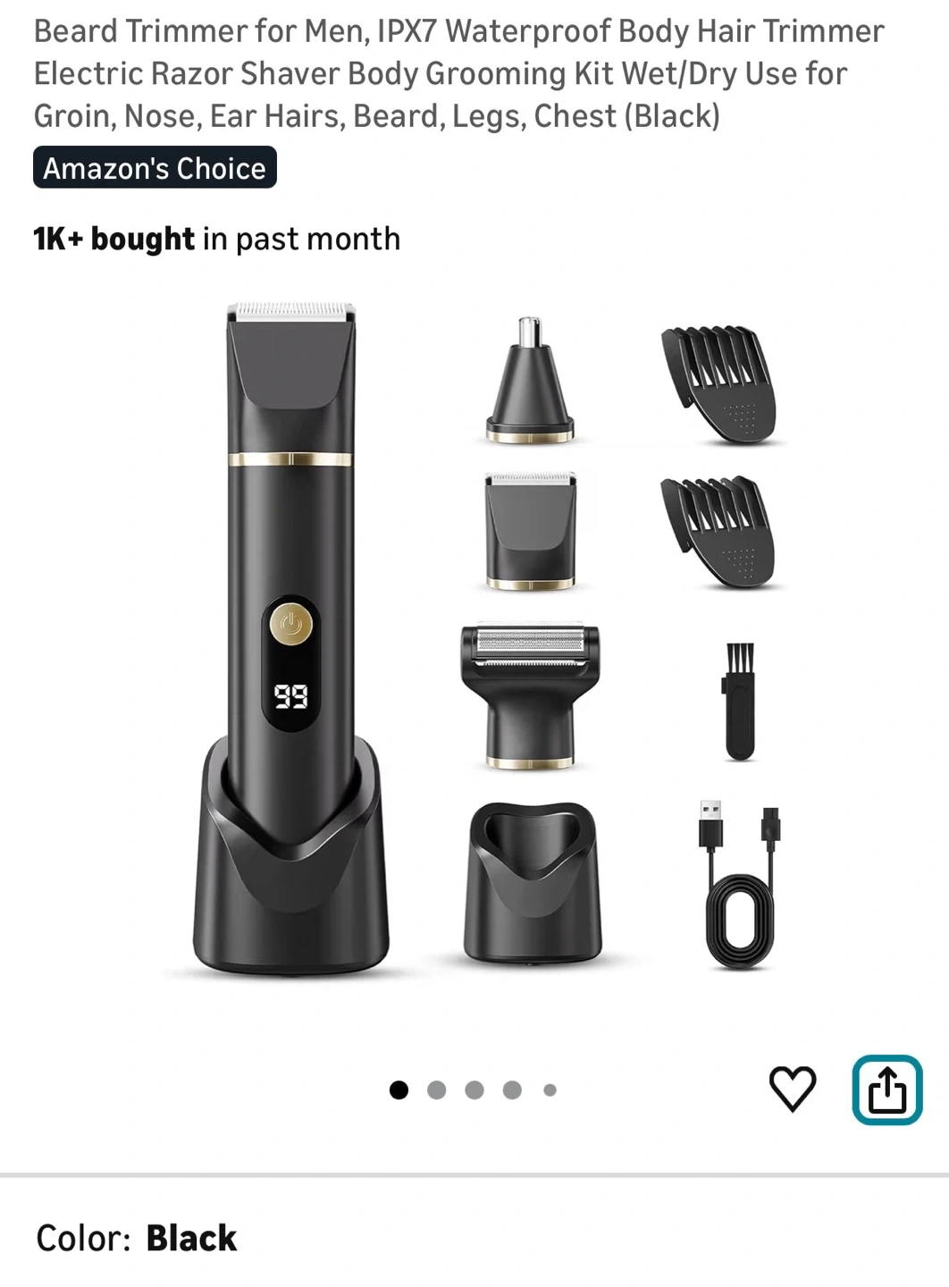 Beard Trimmer, IPX7 Waterproof Body Hair Trimmer Electric Razor Shaver Body Grooming Kit Wet/Dry Use for Groin, Nose, Ear Hairs, Beard, Legs, Chest (Black)