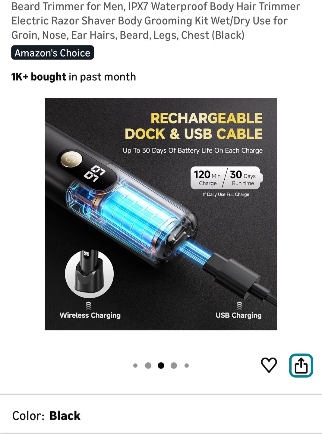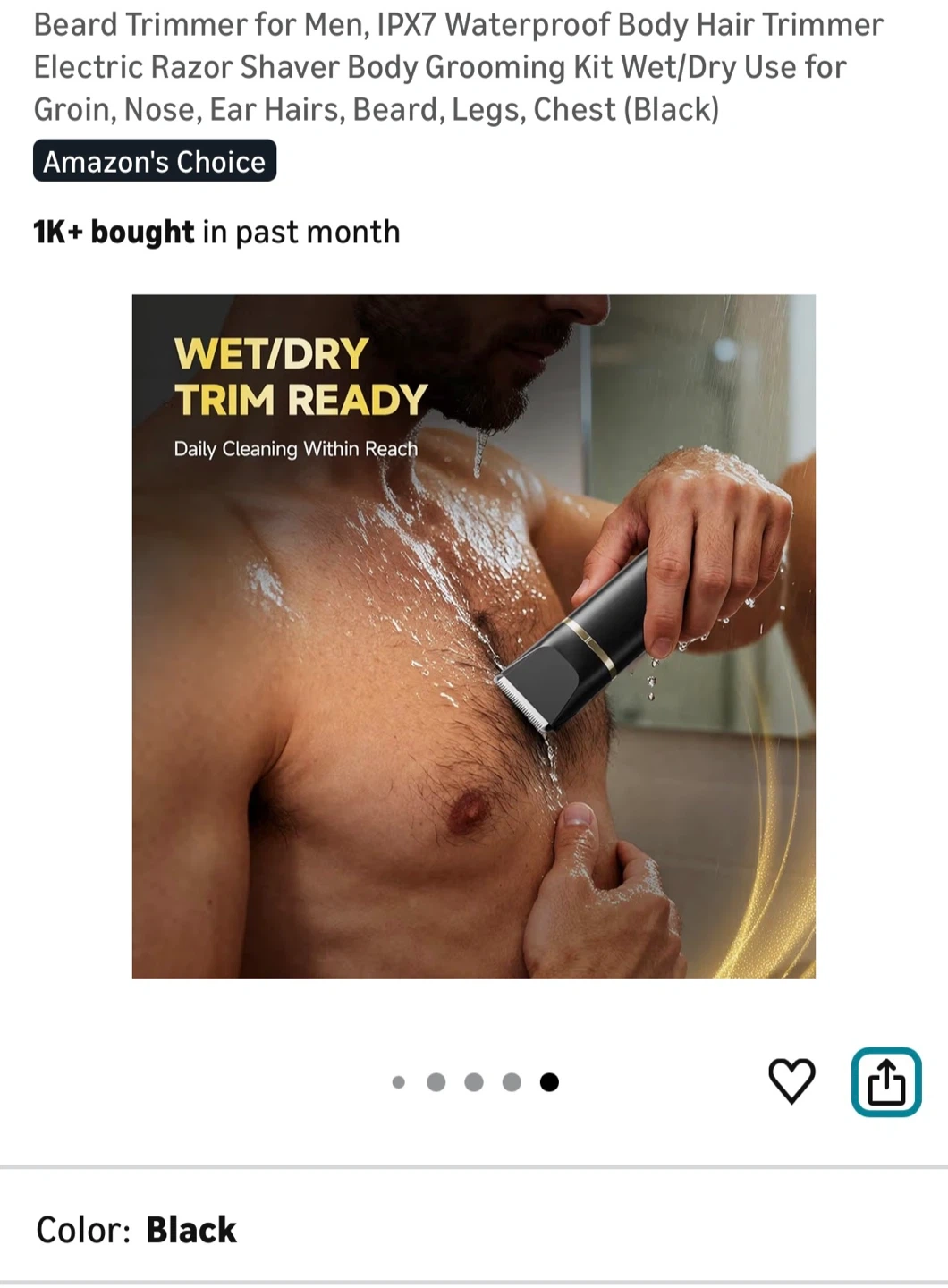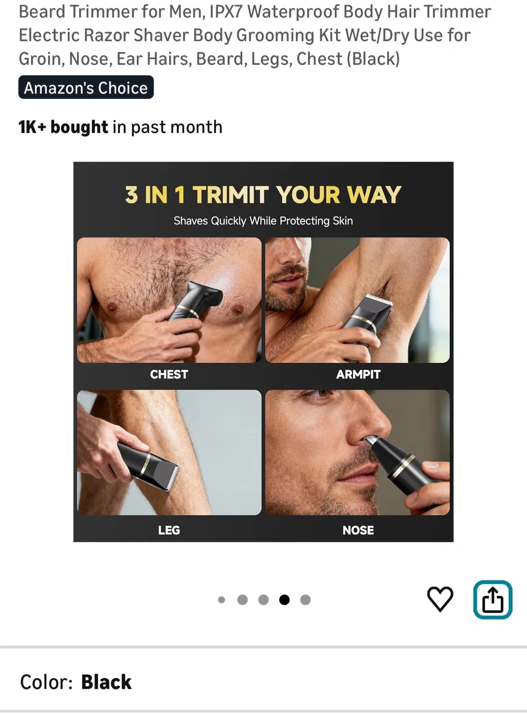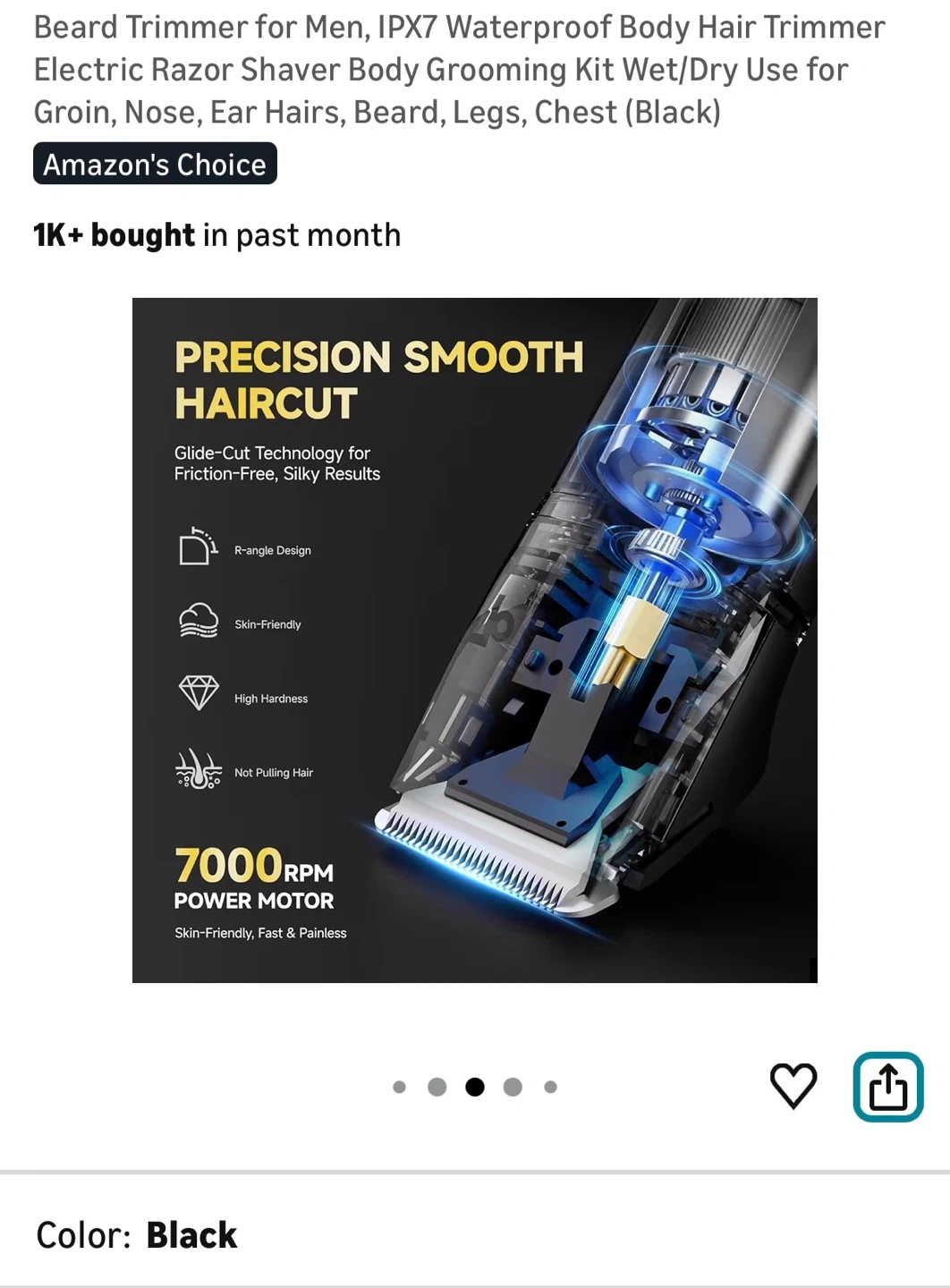 Beard Trimmer, IPX7 Waterproof Body Hair Trimmer Electric Razor Shaver Body Grooming Kit Wet/Dry Use for Groin, Nose, Ear Hairs, Beard, Legs, Chest (Black)