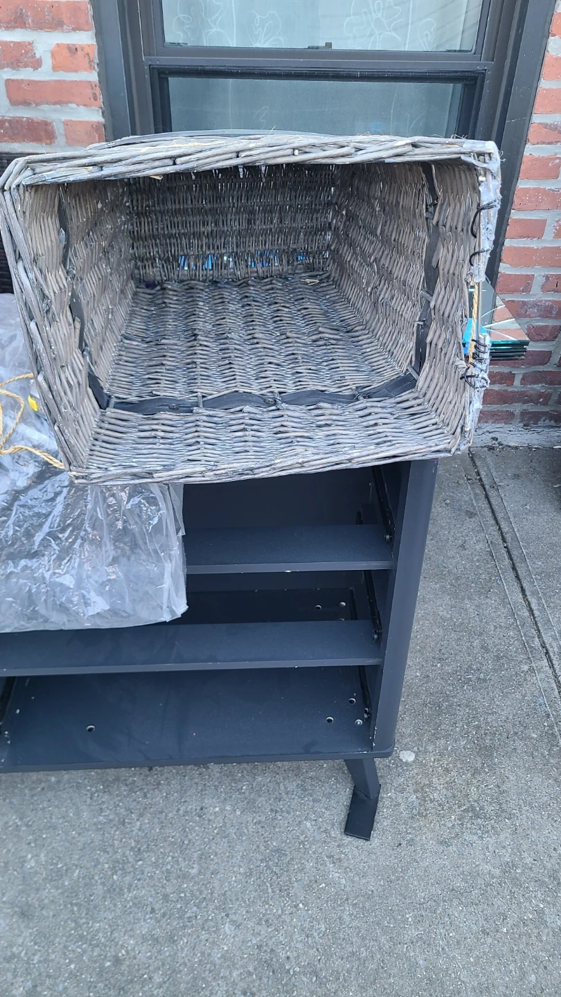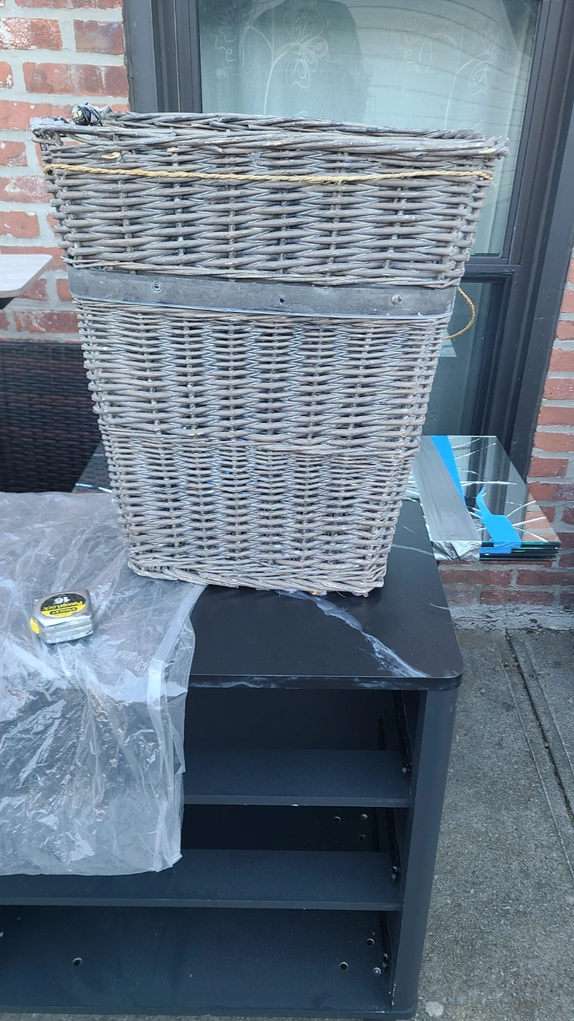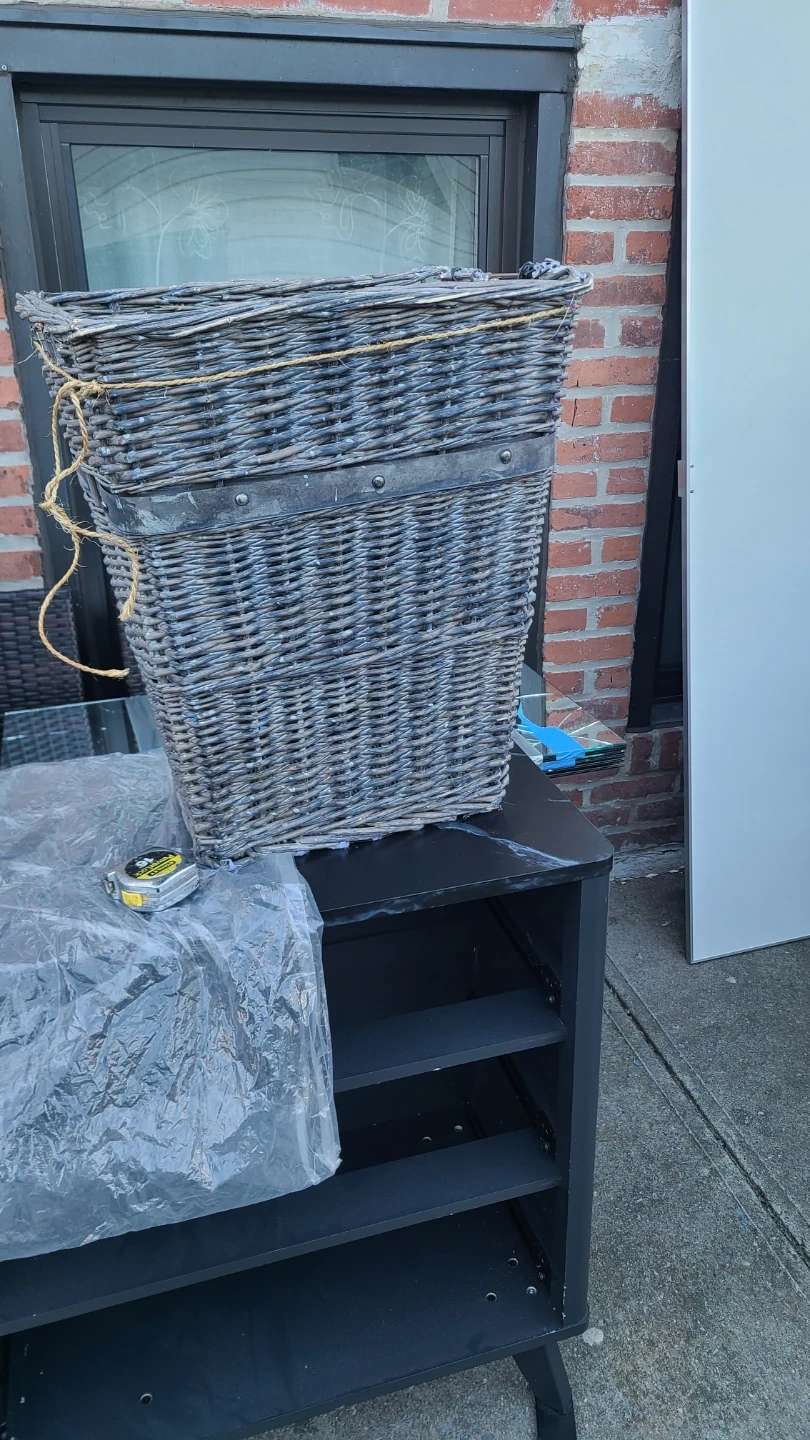 Large grey wicker storage basket. It's woven from natural materials and features a decorative band and rope tie detail at the top. Perfect for storing blankets, toys, or other household items! Measure about 17.5 inch long by 13 inch wide by 20 onch high
