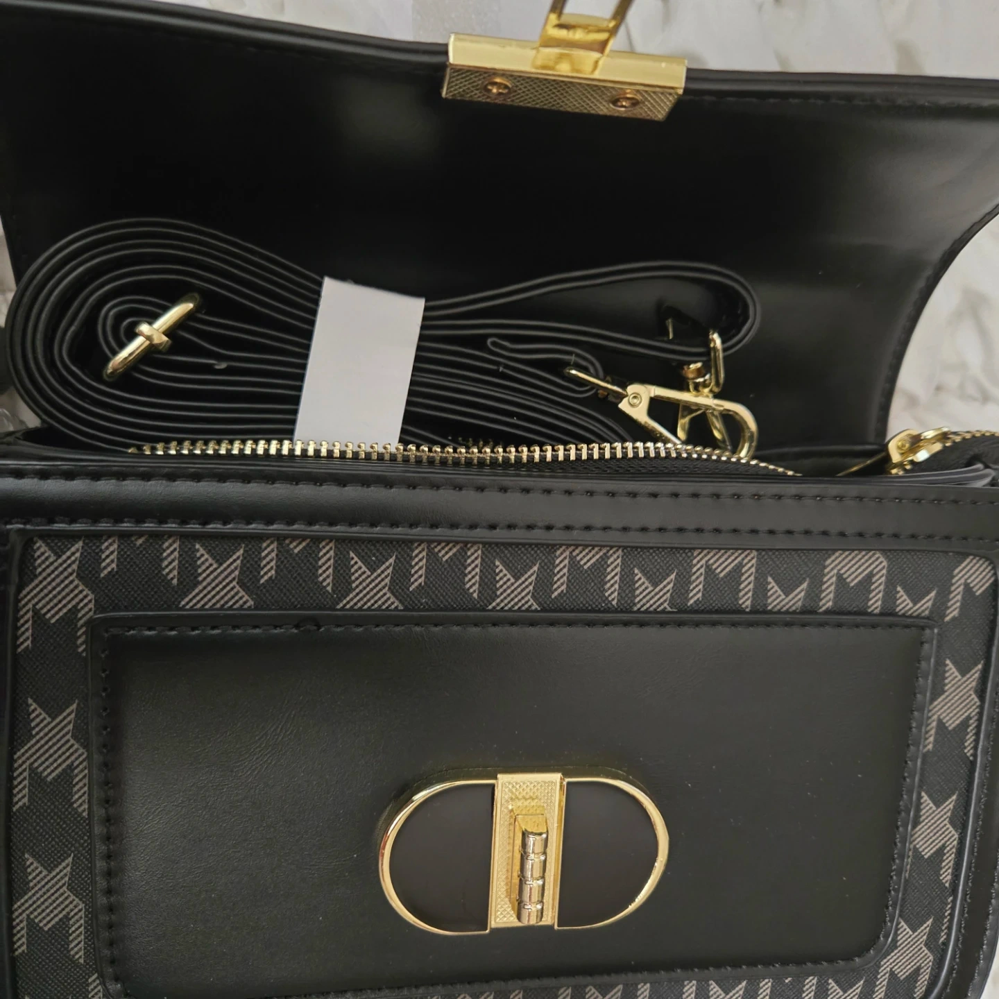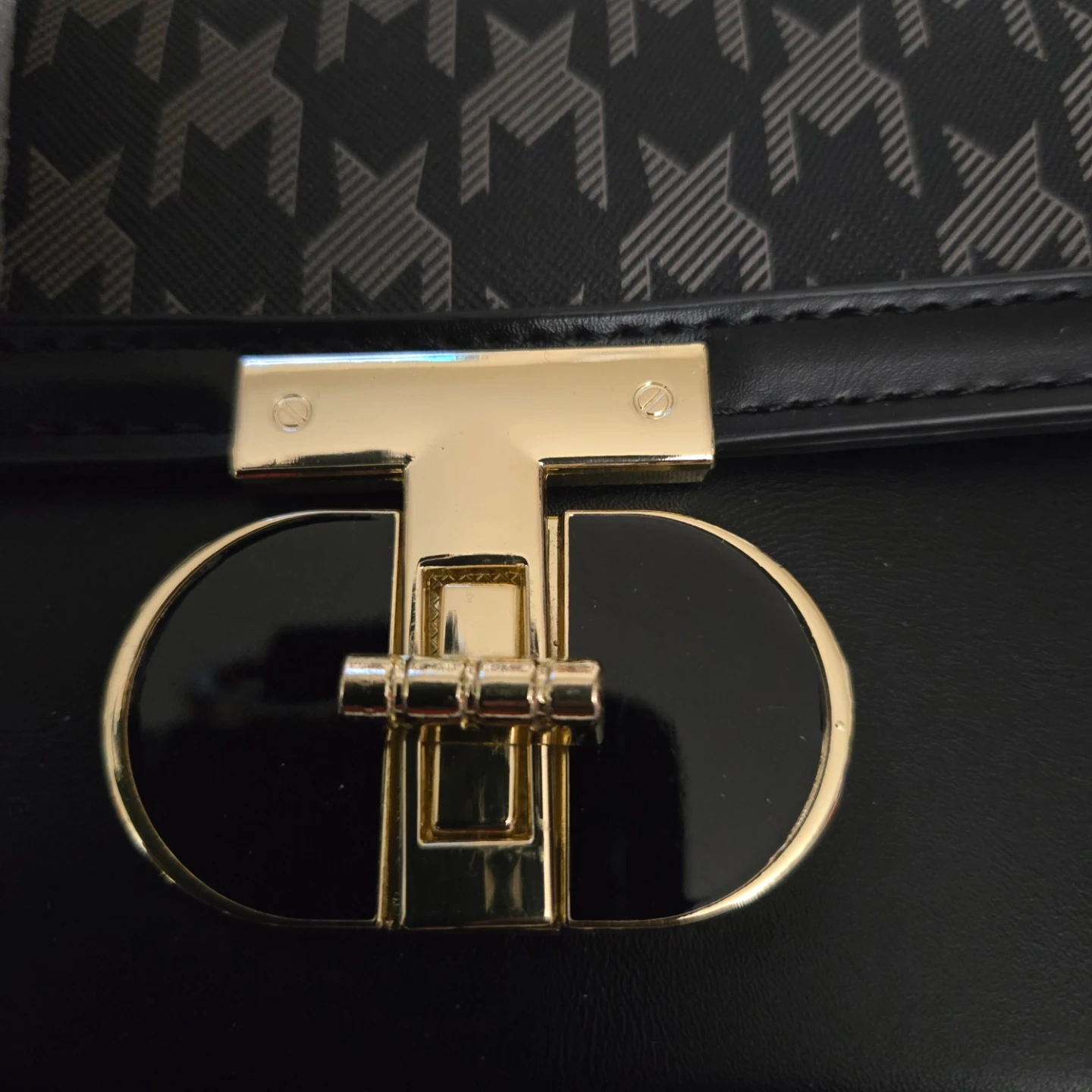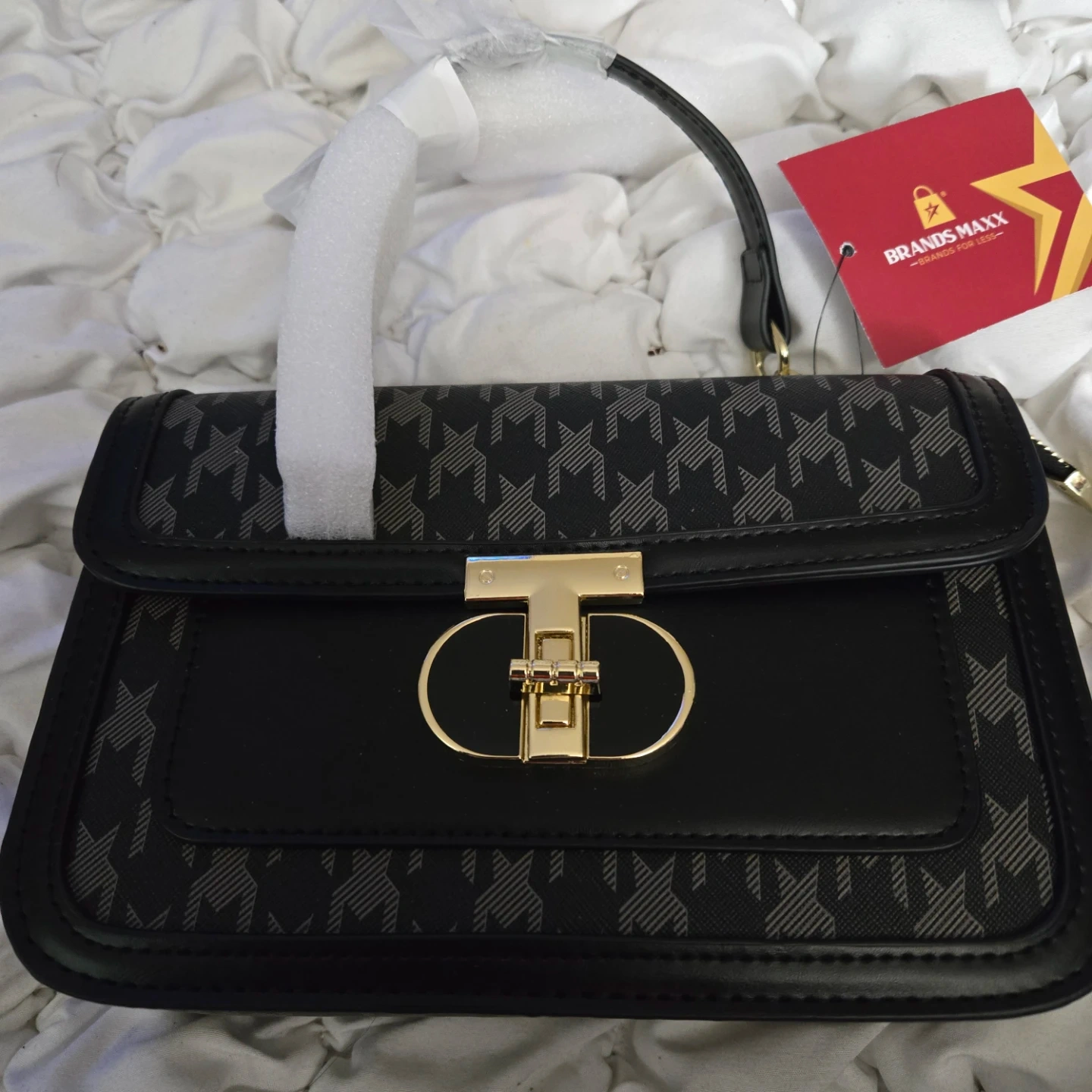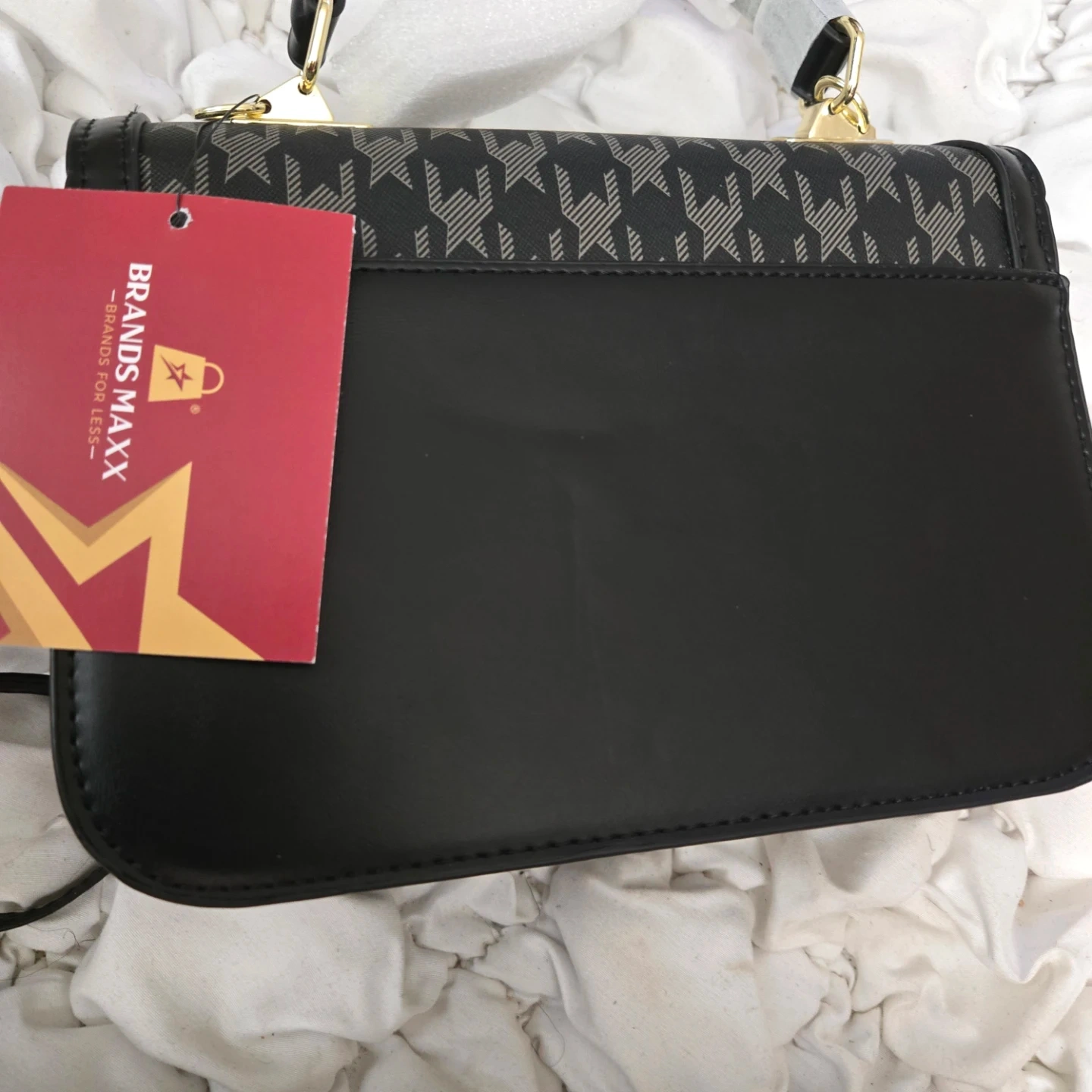 This Brands Maxx satchel is brand new with tags! It features a stylish black houndstooth print and a gold-tone clasp. The bag includes an additional shoulder strap and has a structured design. Perfect for adding a touch of elegance to any outfit!