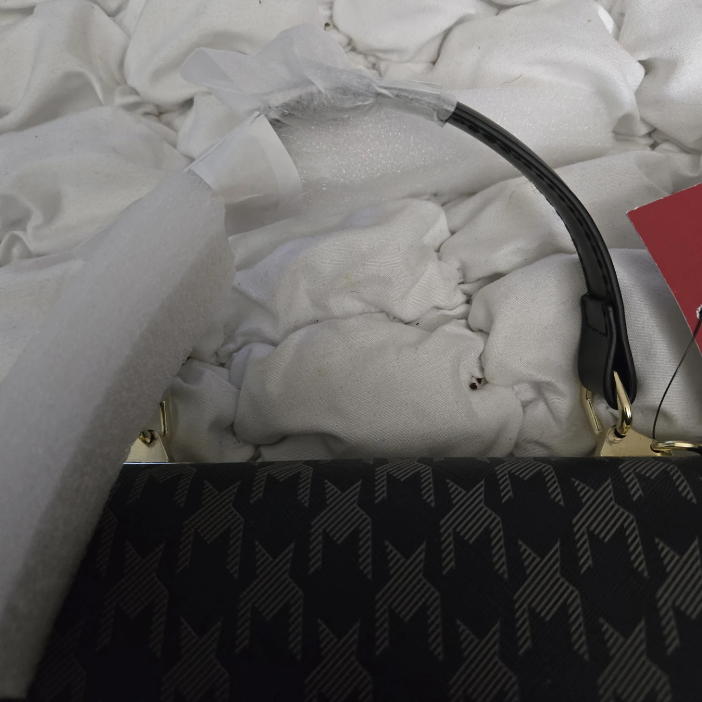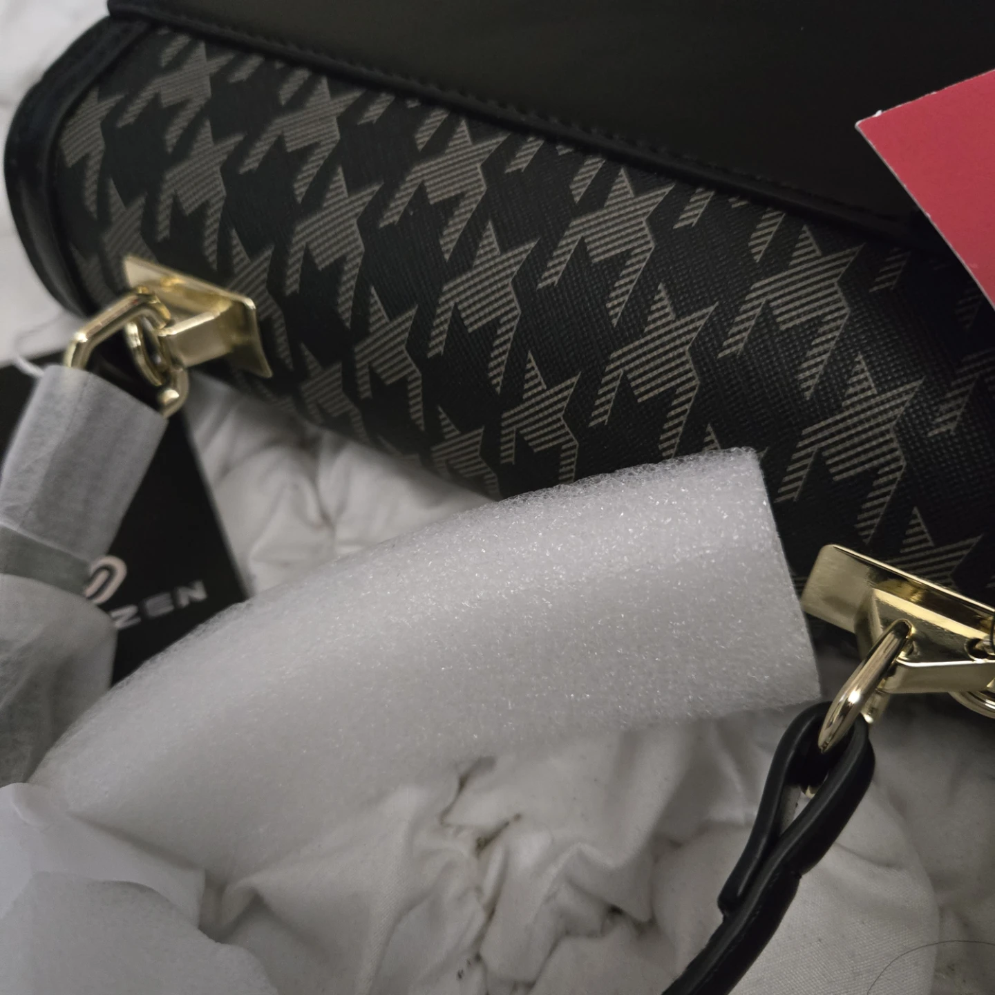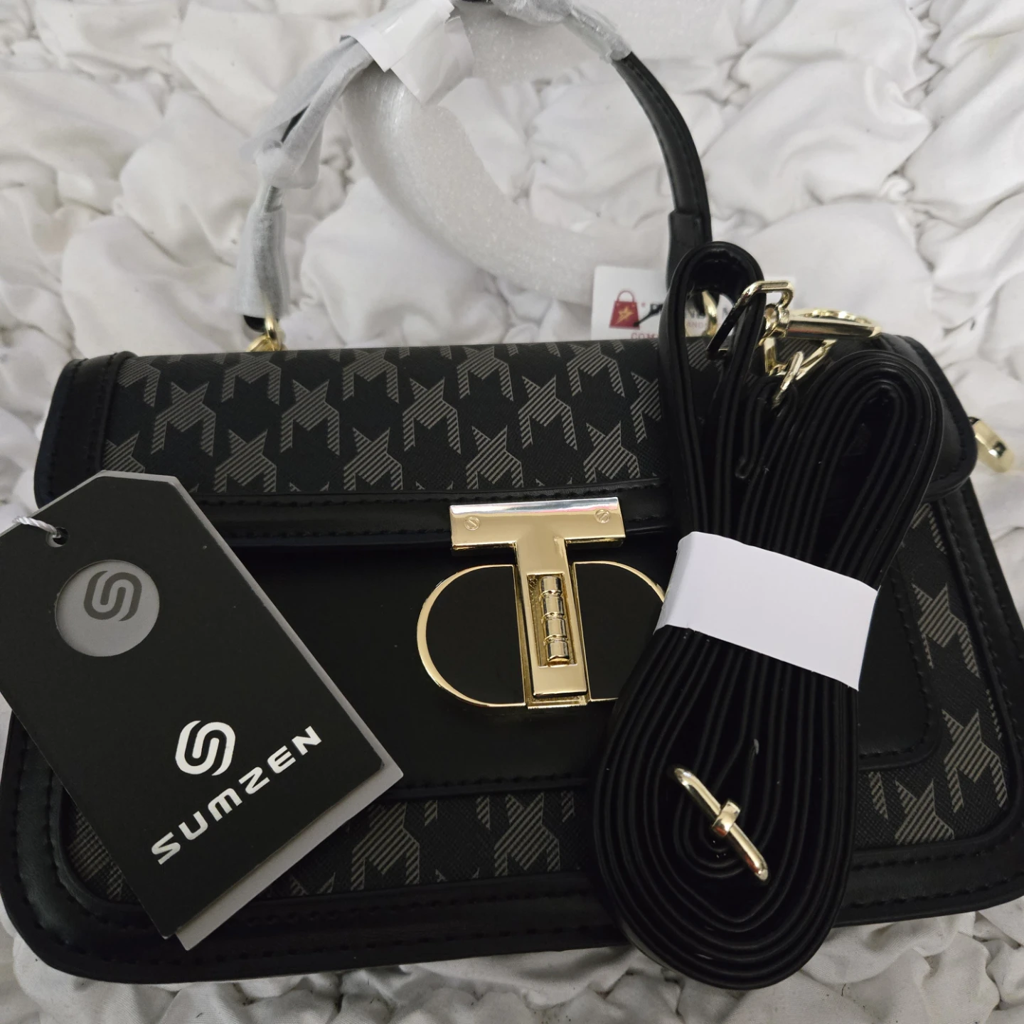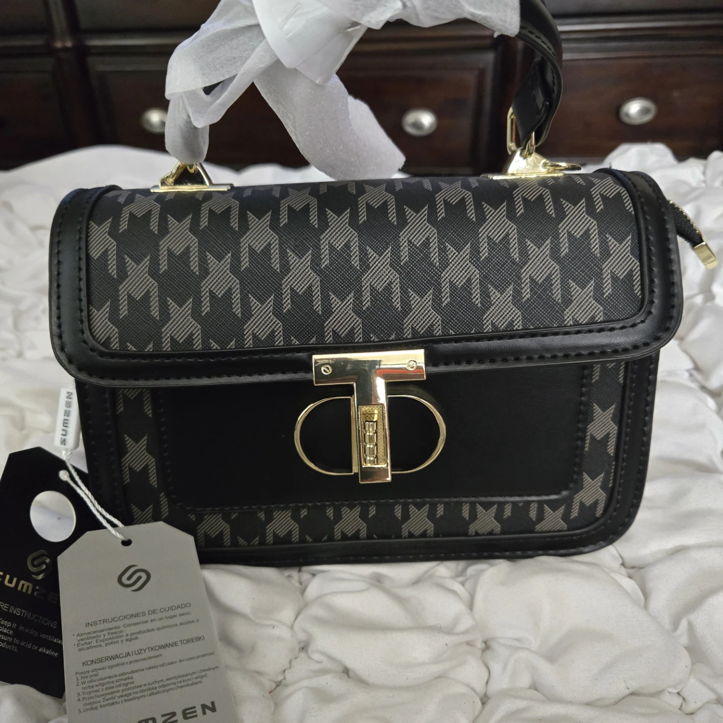 This Brands Maxx satchel is brand new with tags! It features a stylish black houndstooth print and a gold-tone clasp. The bag includes an additional shoulder strap and has a structured design. Perfect for adding a touch of elegance to any outfit!
