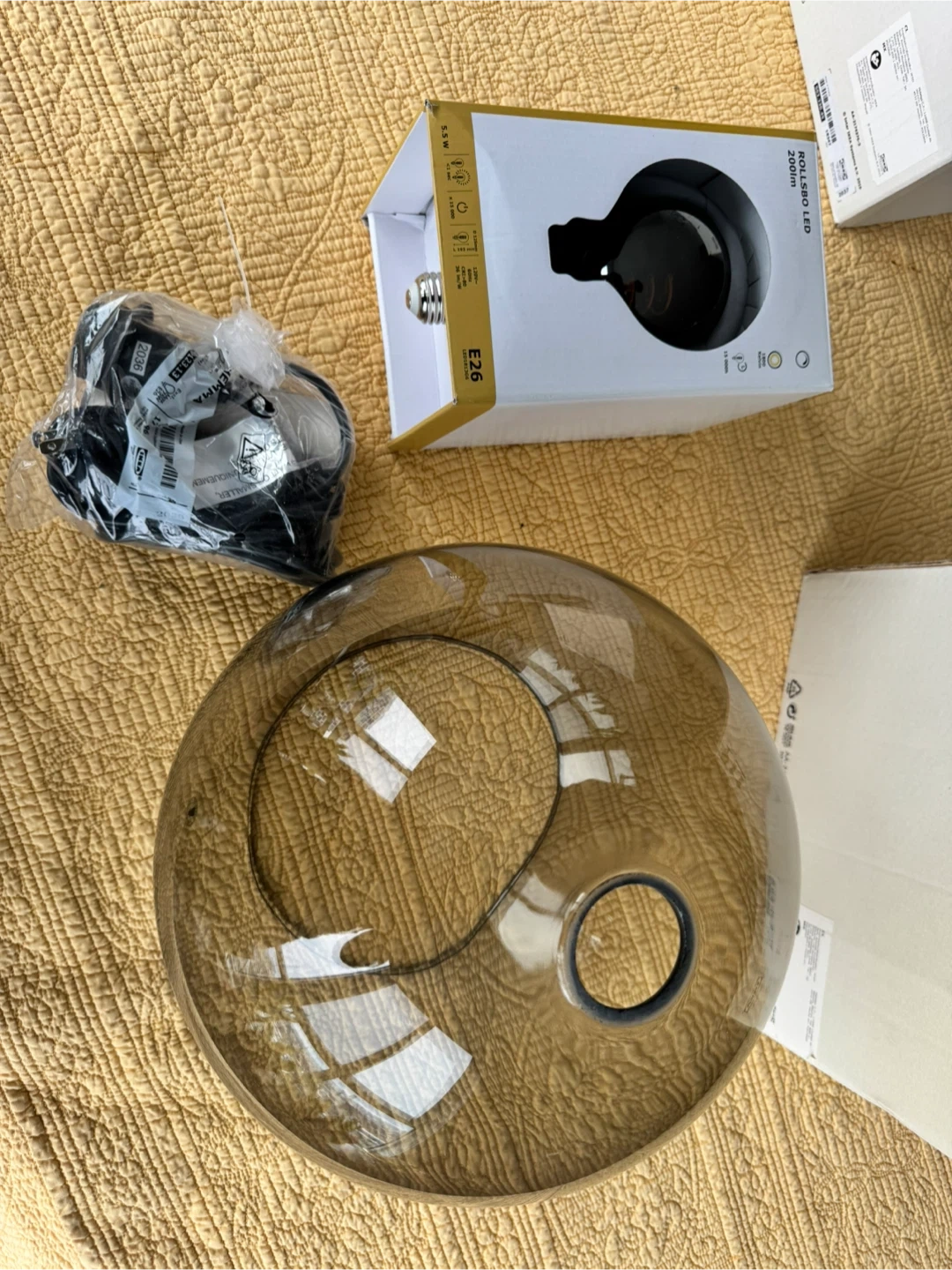 A pair IKEA Jakosbyn pendant lamp shade in a smoky grey colour. Includes a pair of black Hemma cords and Rollsbo LED bulb.