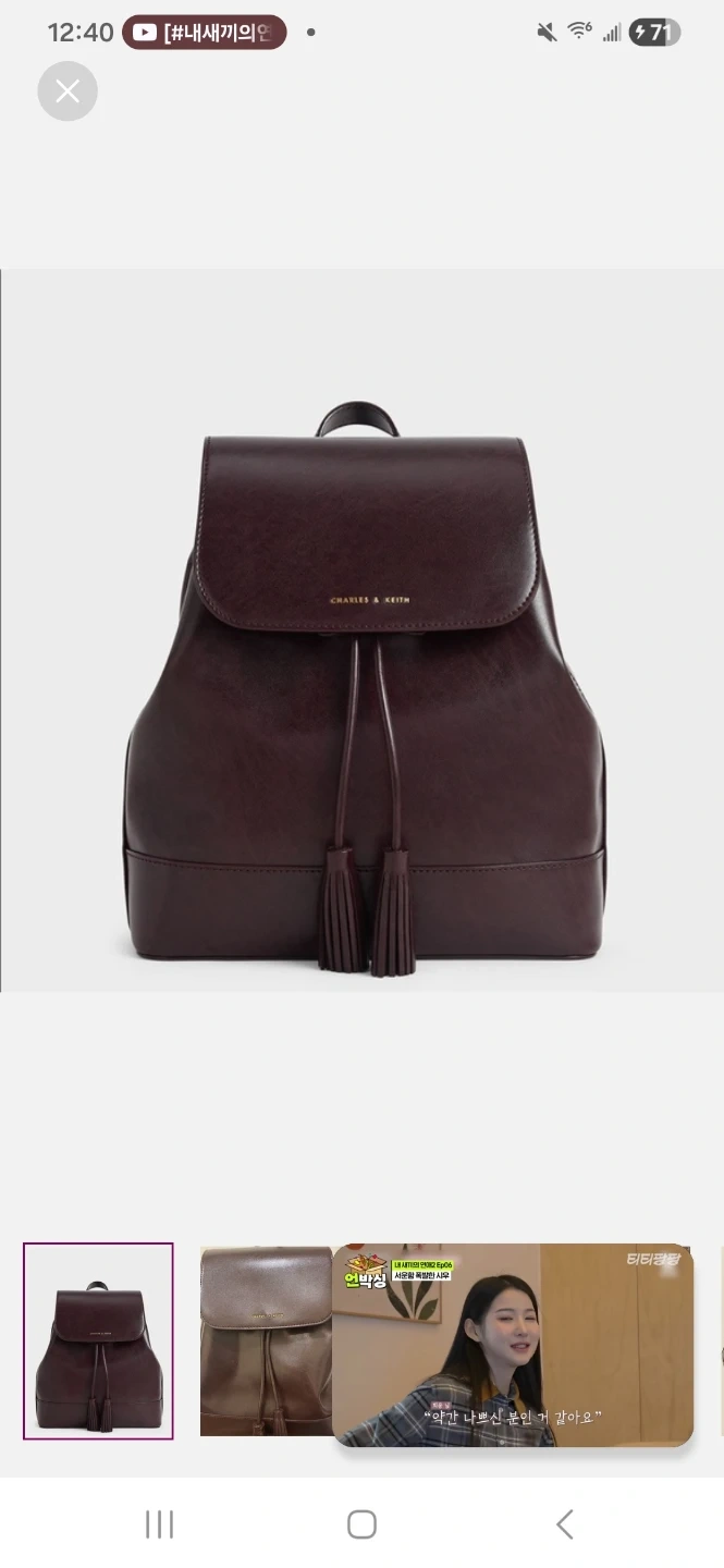 Charles & Keith backpack in a deep burgundy color. It's made from smooth leather and features tassel detailing on the drawstring. A classic flap closure keeps your belongings secure.