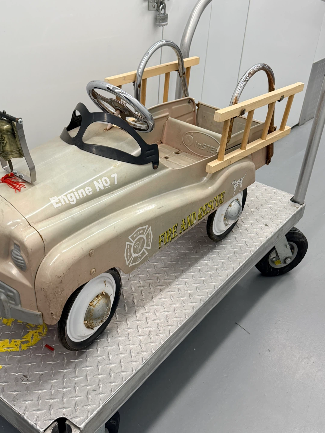This is a vintage fire engine pedal car, marked 'Engine No. 7' and 'FIRE AND RESCUE'. It features wooden ladders on the sides and a working bell on the front. It has a metal body with some signs of wear, consistent with its age.
