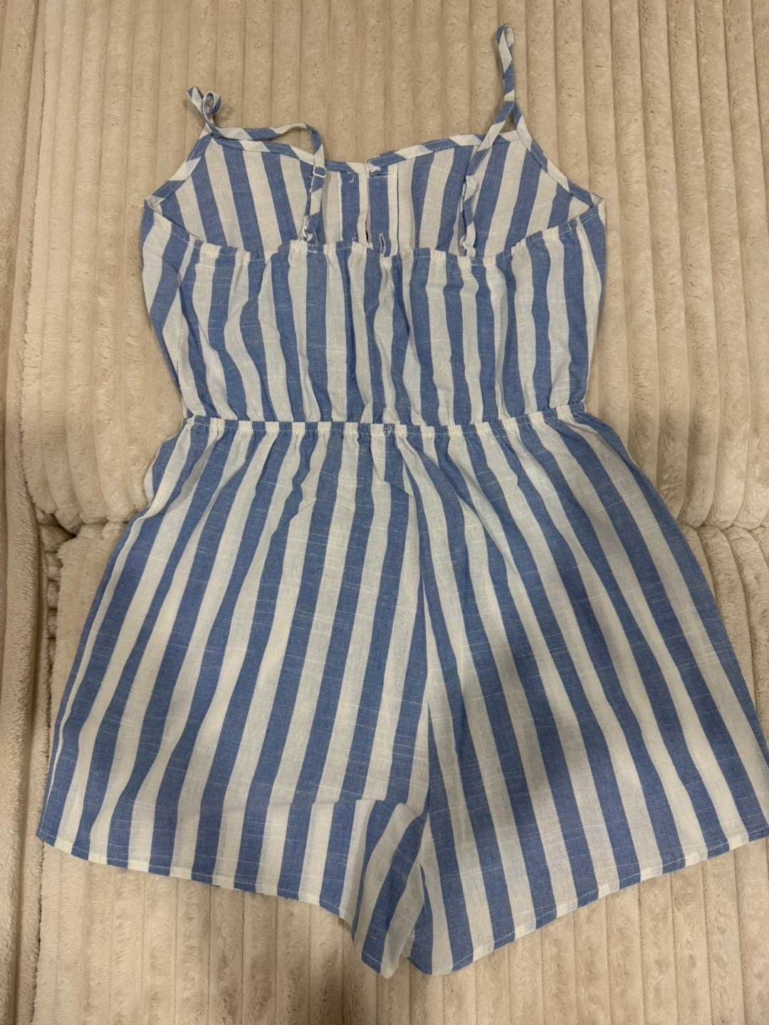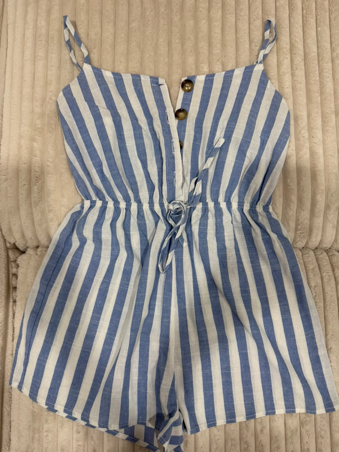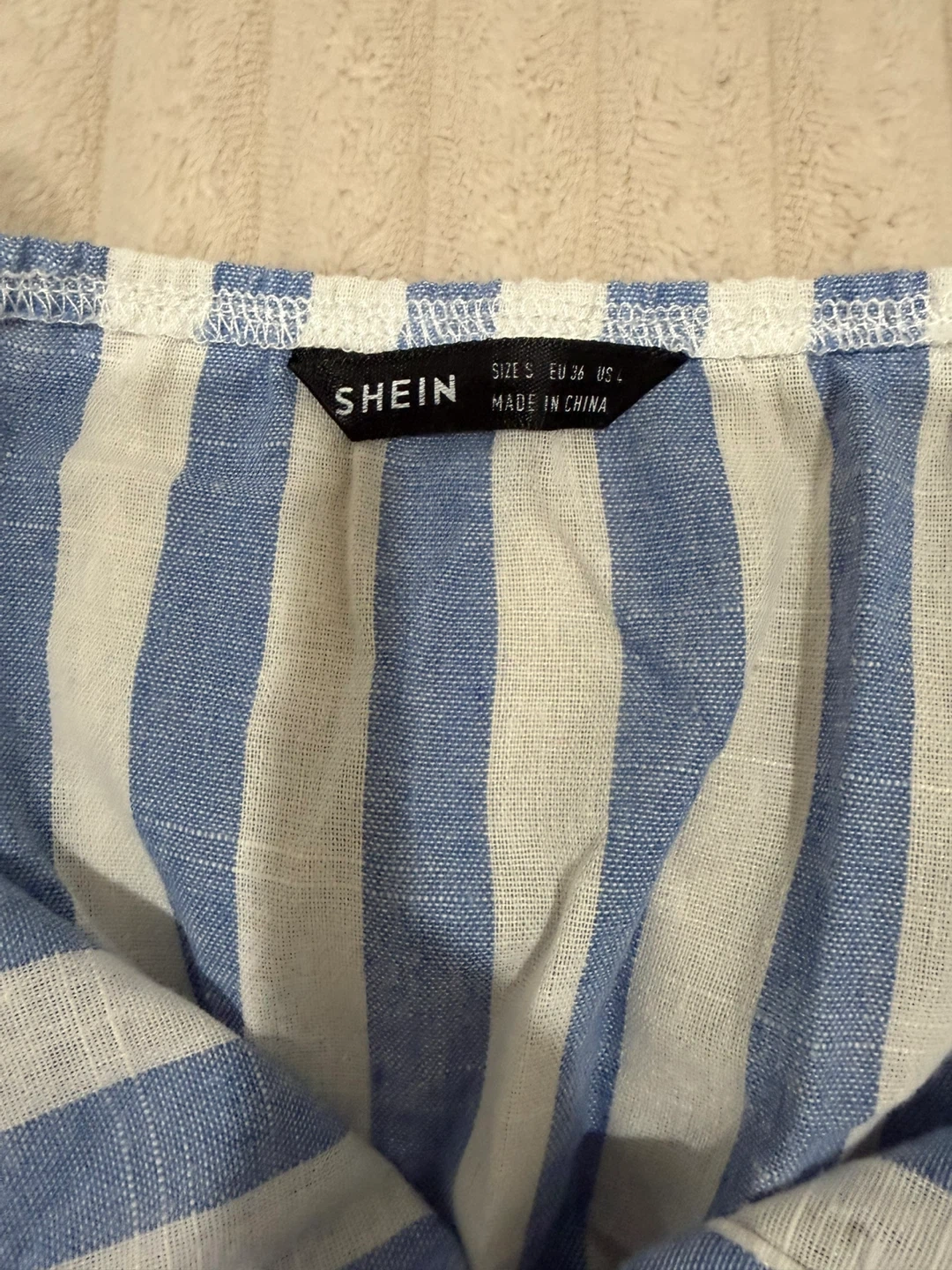 This SHEIN romper features a blue and white stripe pattern. It's a size S with adjustable straps and a tie waist. Made in China.