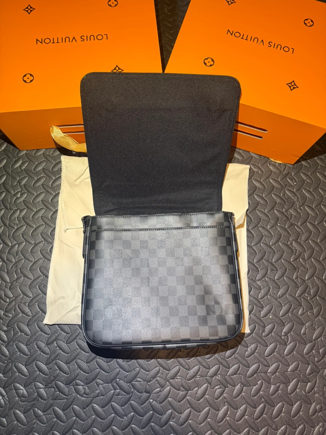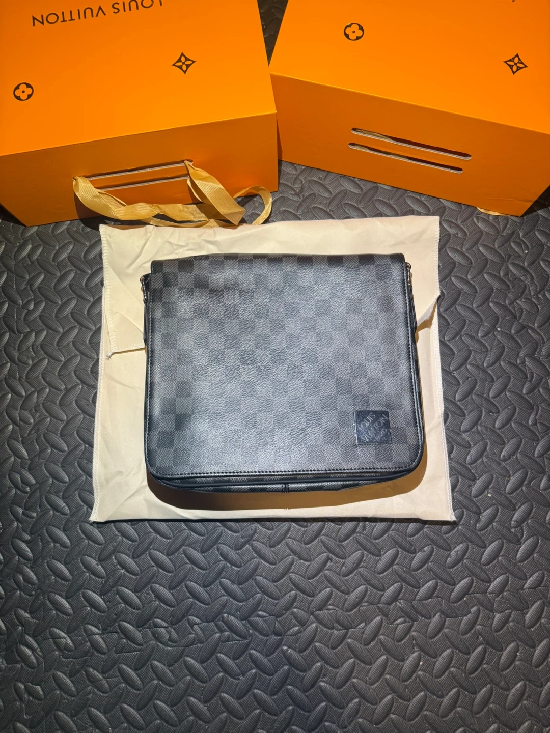 Louis Vuitton messenger bag in Damier Graphite canvas. Made in France. Includes original dust bag and box.