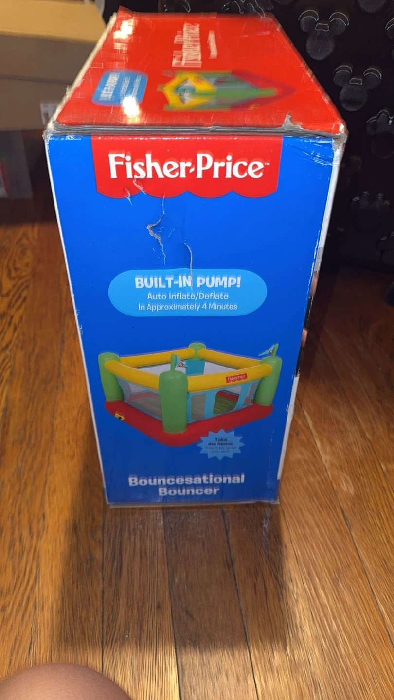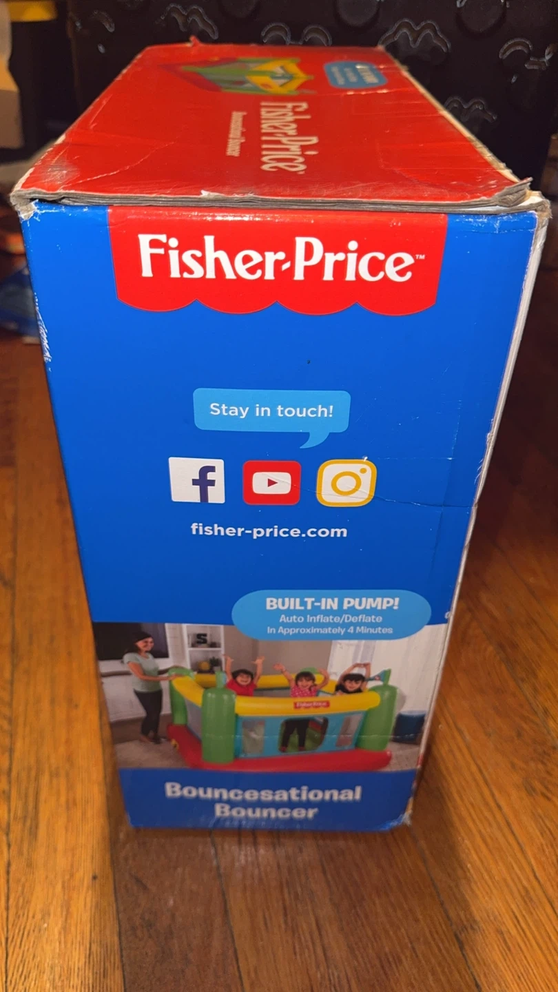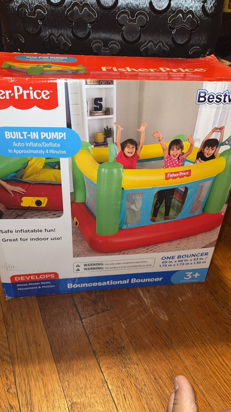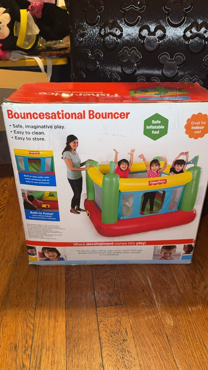 Selling a Fisher-Price Bouncesational Bouncer! It's safe, imaginative, and easy to clean and store. It's great for indoor use and provides safe inflatable fun! The bouncer has a built-in pump that auto inflates/deflates in approximately 4 minutes. The dimensions are 69 in x 68 in x 53 in, or 1.75 m x 1.72 m x 1.35 m. Recommended for ages 3+