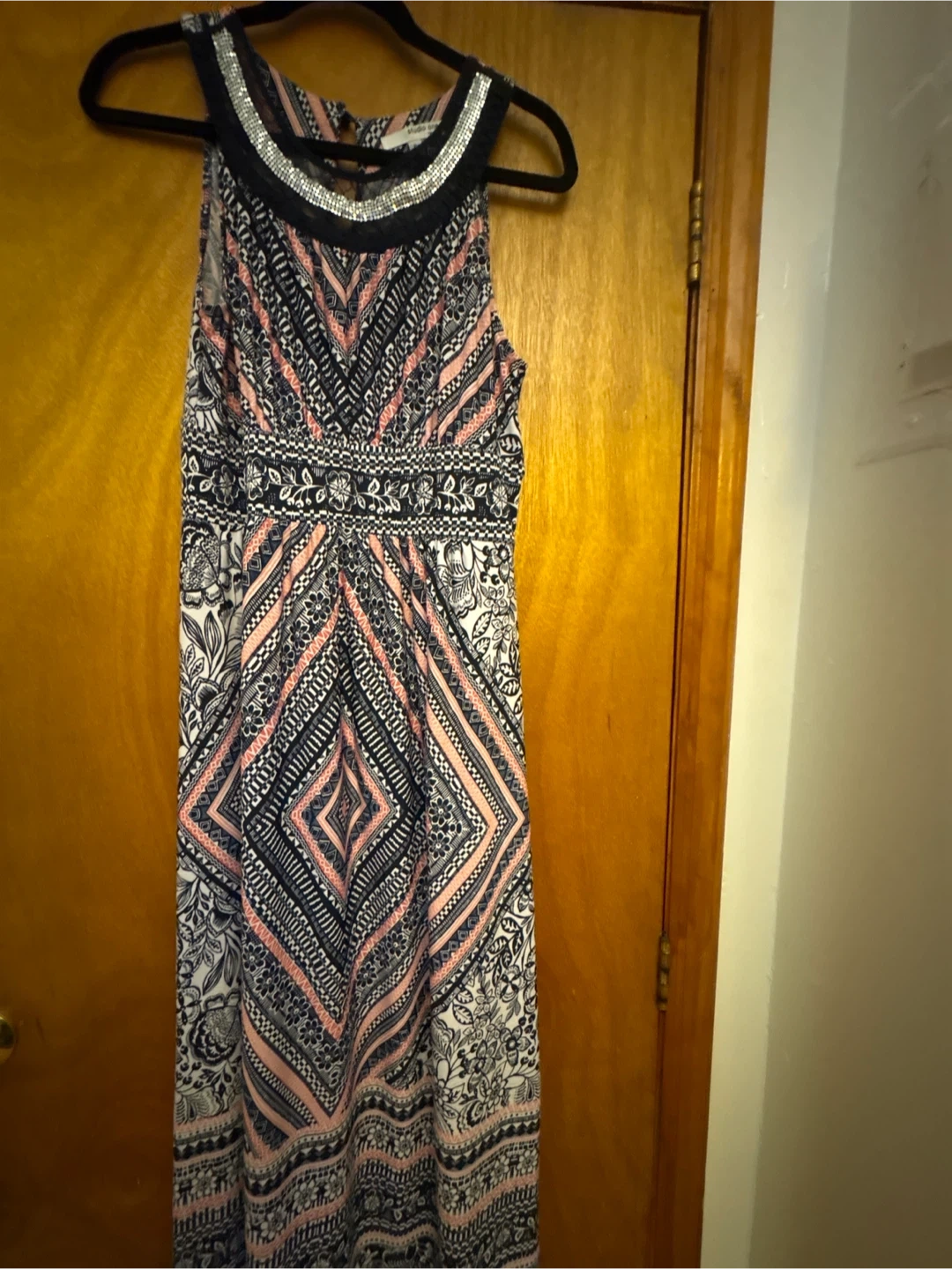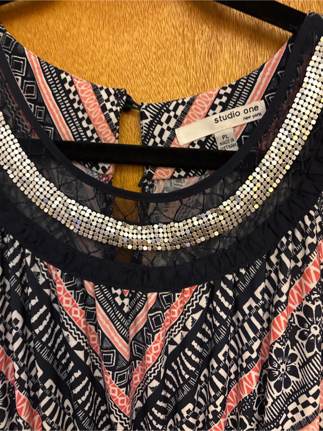 Selling a lovely Studio One New York dress! It's a size PL (Petite Large) and features a beautiful pattern with pink, white, and black details. The neckline has a decorative silver embellishment, adding a touch of elegance to the dress