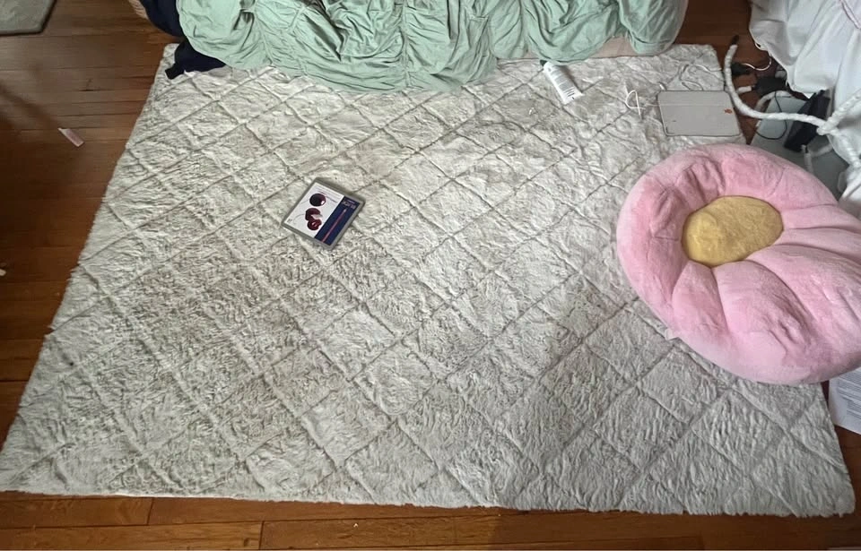 Neutral long carpet for sale. This light pink/beige runner is a nice addition to any room. Has soft texture. White fluffy carpet (shoe free house).