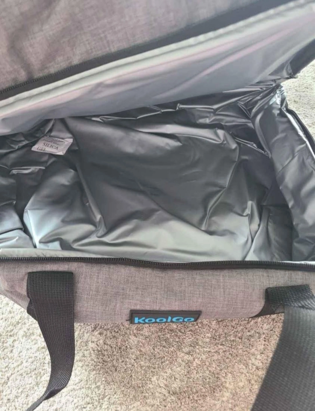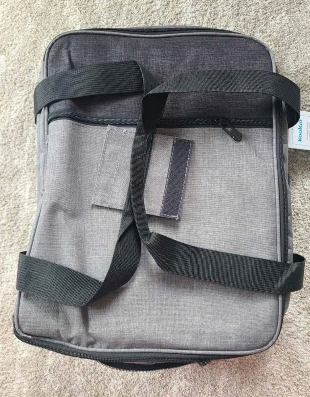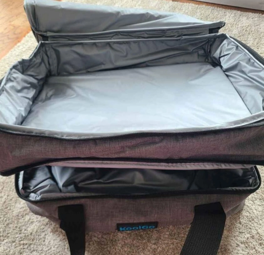Gray fabric insulated food carrier. Two tiers. Top and bottom compartments. Black straps. Zipper closure. Great for picnics and transporting food.