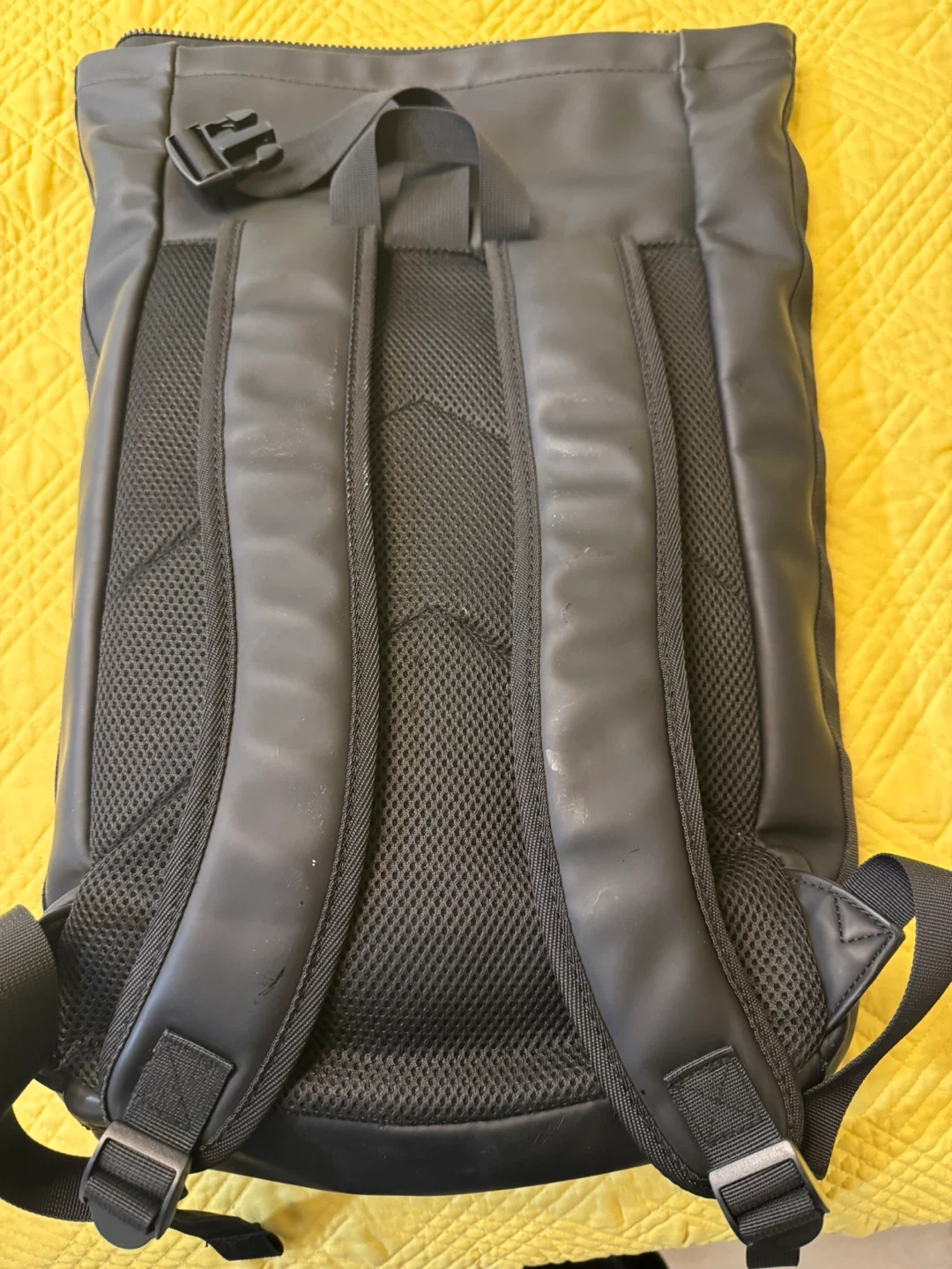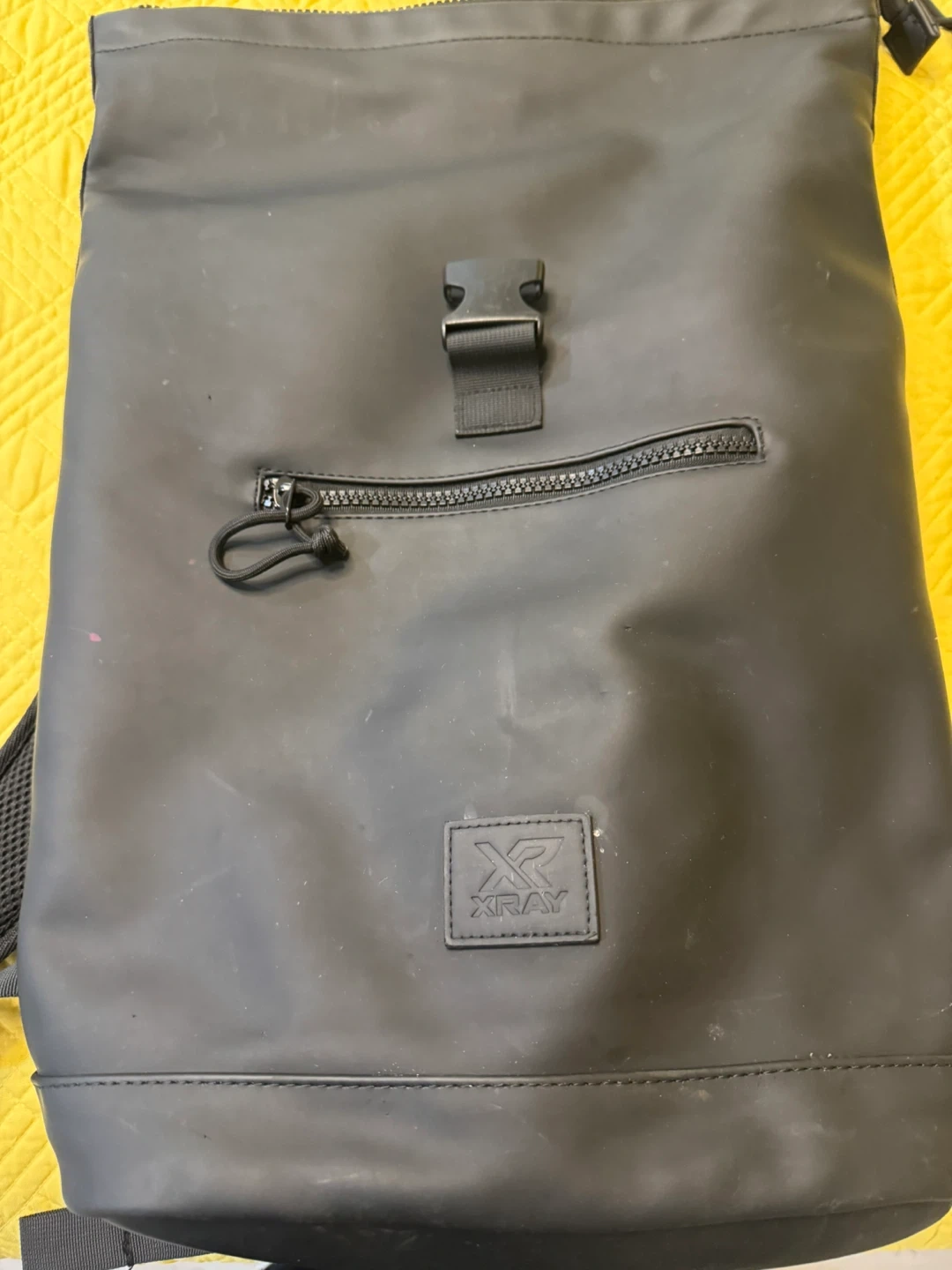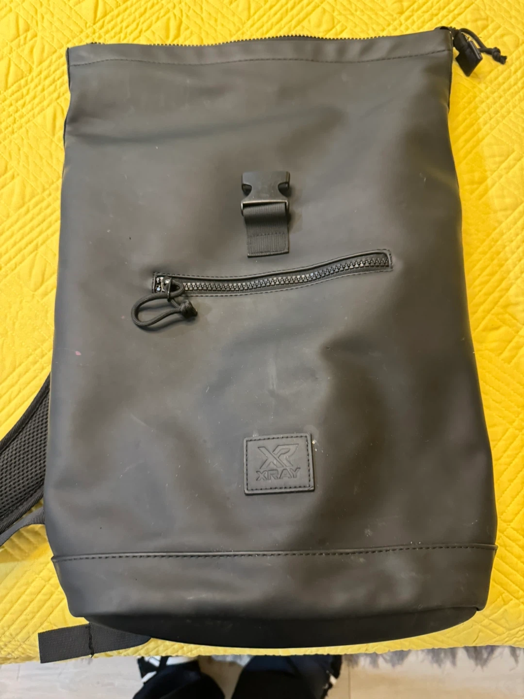 Selling a black backpack from XRAY. It has a roll-top design with a buckle closure and a zippered front pocket. The back is padded for comfort.