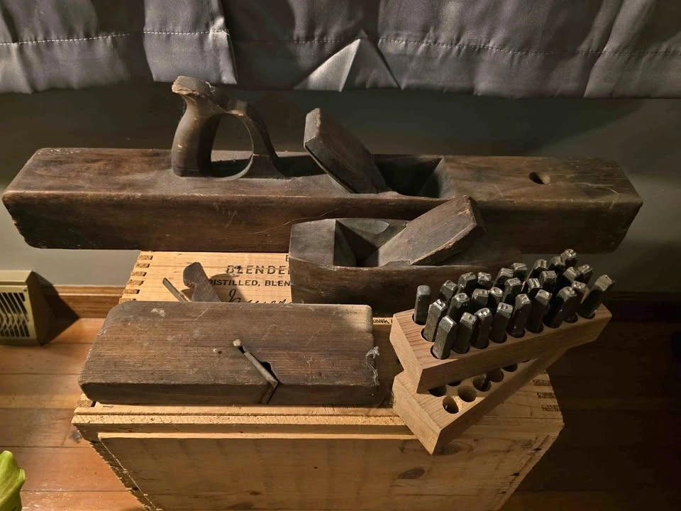 Really neat lot of antique block planes and a vintage metal workers die set with the alphabet. Located in Big Rock. One price for all pictured.