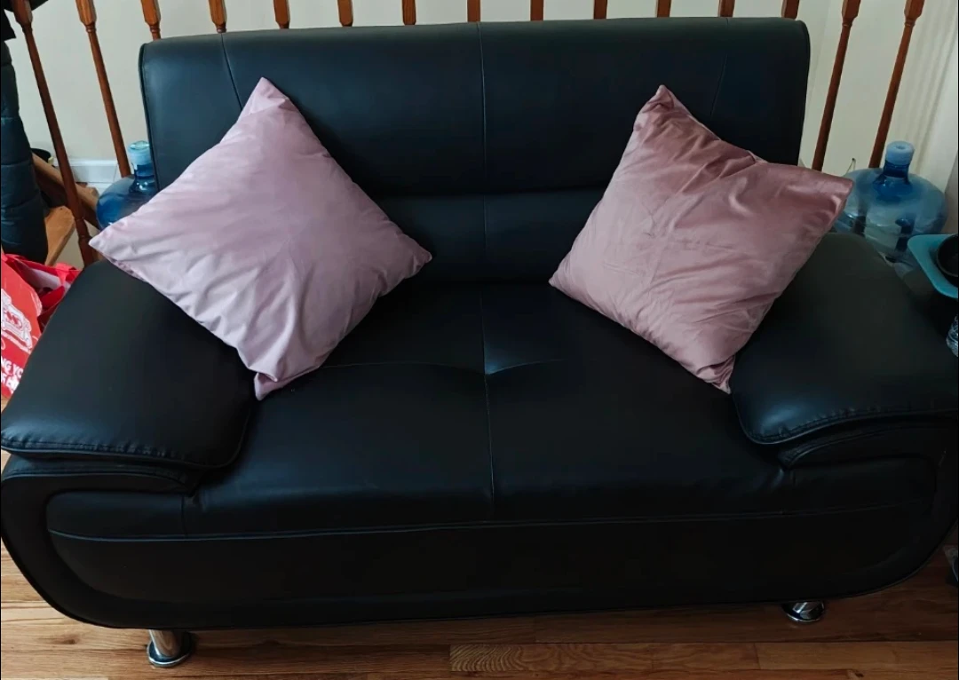 Selling a black leather loveseat sofa. It's in good condition and has a sleek, modern design. Perfect for a small apartment or living room!