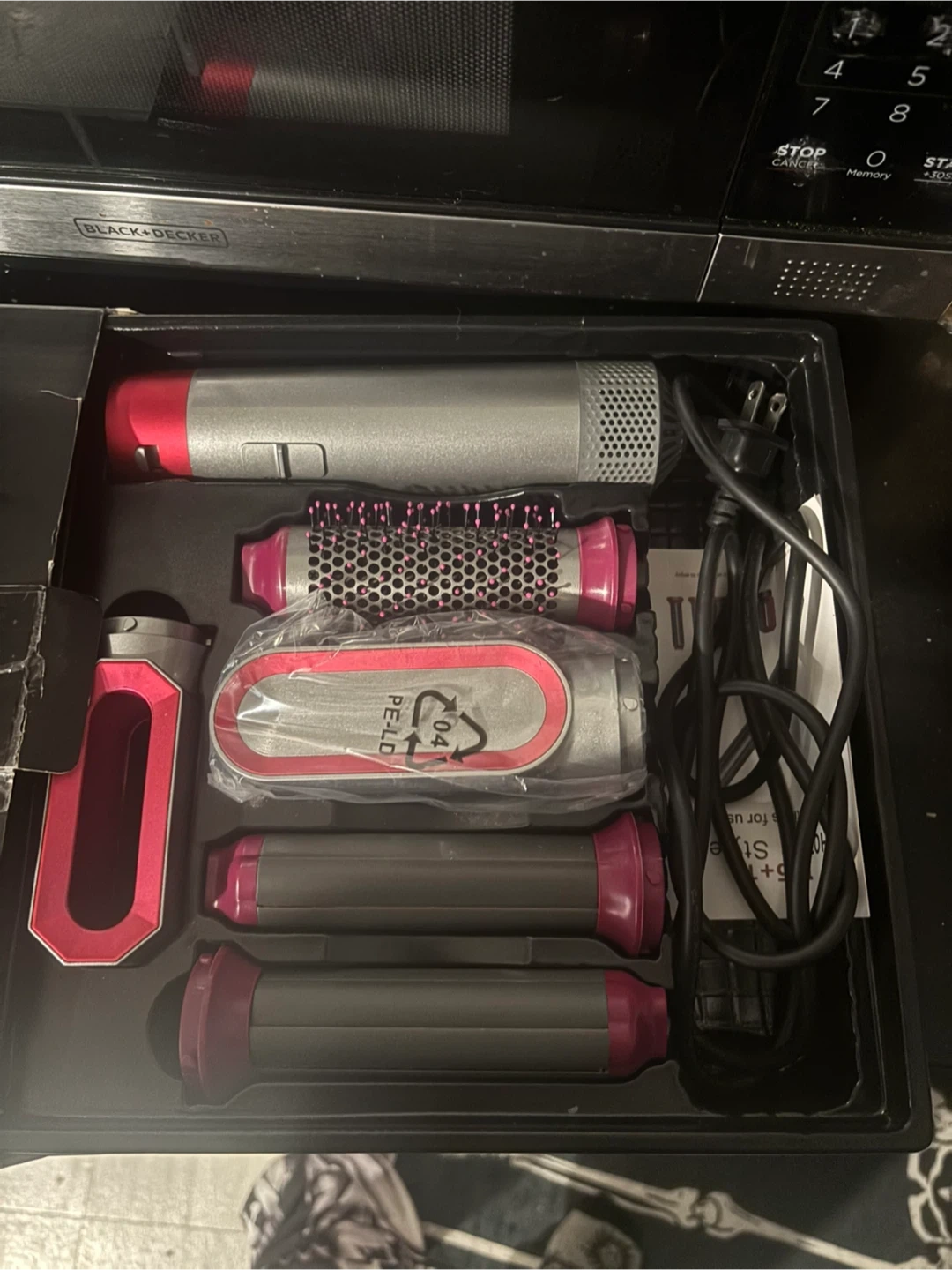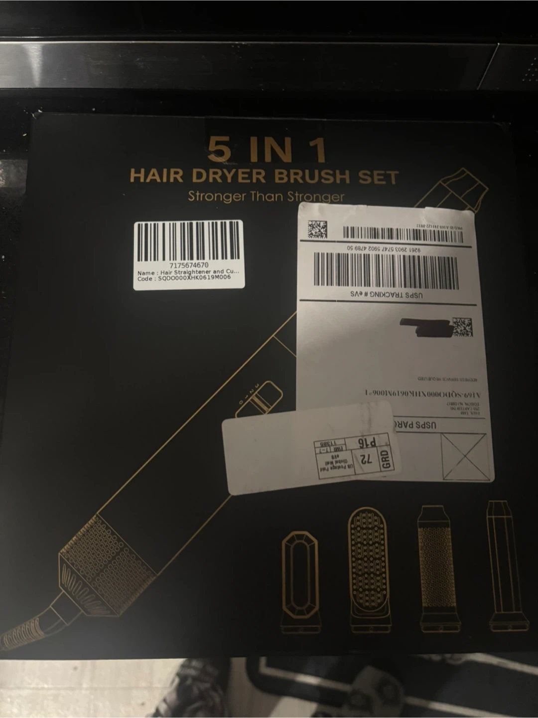Selling a 5 in 1 hair dryer brush set! It comes with multiple attachments for different styling options. The box is included, making it easy to store and keep all the pieces together.