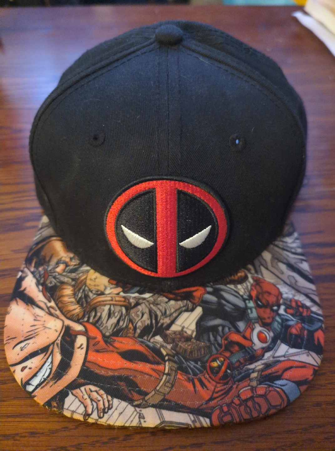 Selling a Deadpool hat from Marvel Comics. It's black with a unique comic book design on the brim and the Deadpool emblem embroidered on the front.